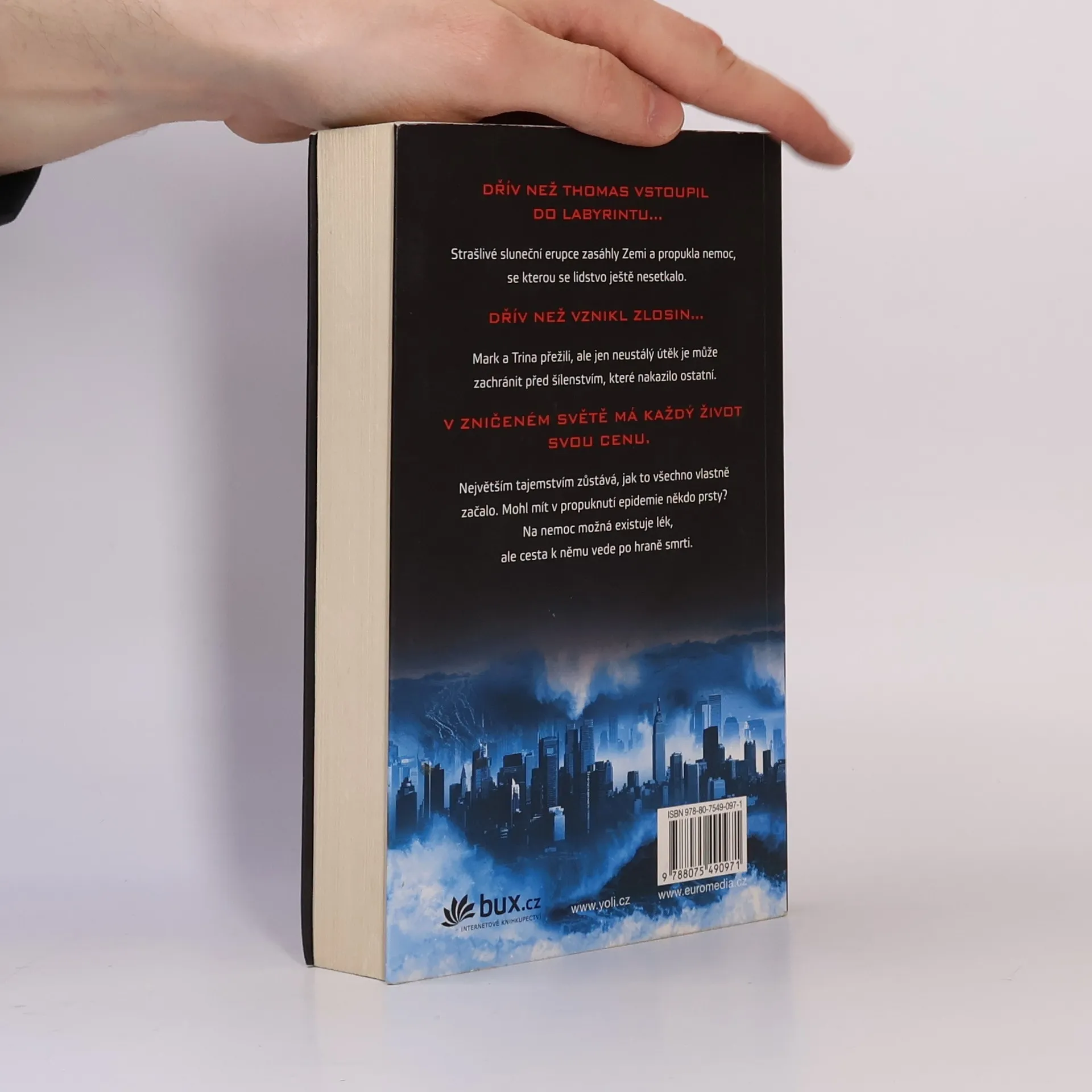 Prequel úspěšné sci-fi série „Labyrint“. Ještě předtím, než byl ustaven ZLOSIN, ještě předtím, než Thomas vstoupil do labyrintu, zasáhly Zemi sluneční erupce a propukla nemoc, se kterou se lidstvo dosud nesetkalo. Mark a Trina přežili erupce, ale to se ukázalo jen jako rozcvička před hrůzami, které je čekají. Nemoc, která se projevuje agresí a šílenstvím, zachvacuje postupně celý kontinent, a nikdo neví, odkud se strašlivý virus vzal. Panují pochybnosti, že v tom mohl být něčí zvrácený zájem… Mark a Trina jsou přesvědčeni, že existuje způsob, jak zachránit ty, které nemoc ještě nezničila. Jejich cesta za lékem na erupci je ale trnitá. V zdevastovaném světě má každý svou cenu, a oni by byli nejcennější jako mrtví...