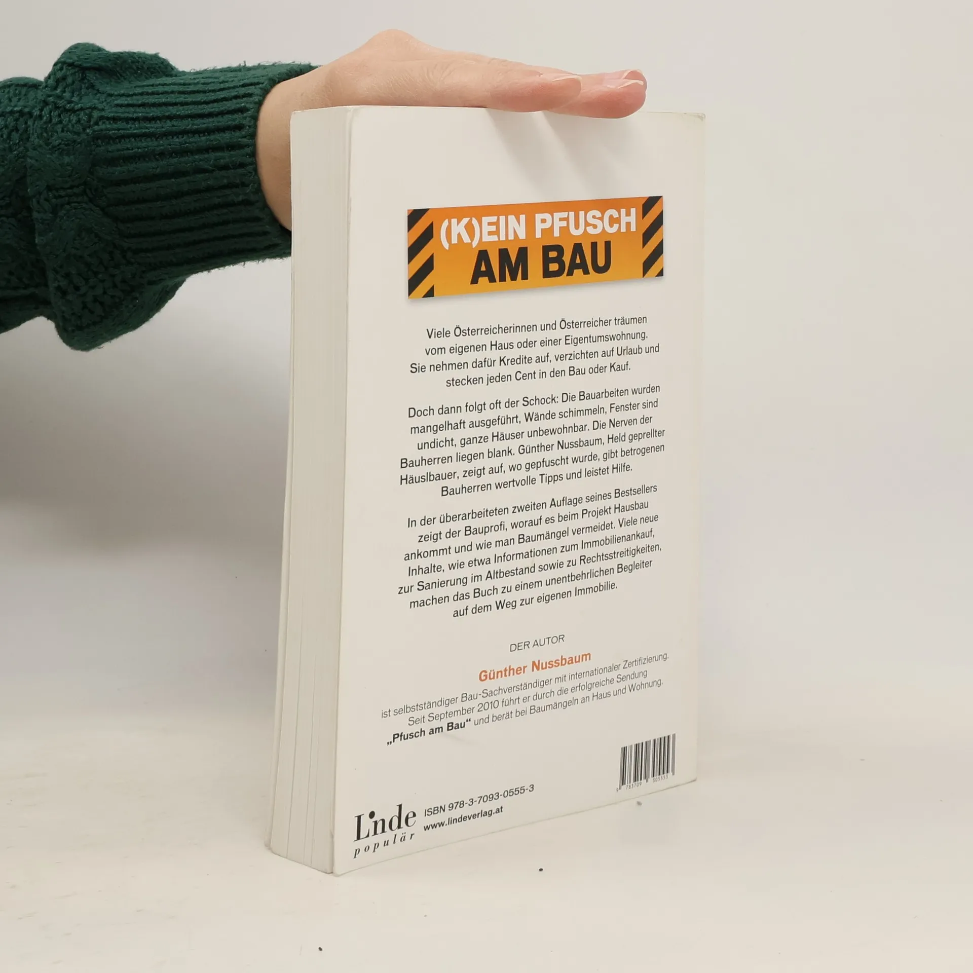 Schluss mit Pleiten, Pech und Pannen Viele Österreicherinnen und Österreicher träumen vom eigenen Haus oder einer Eigentumswohnung. Sie nehmen dafür Kredite auf, verzichten auf Urlaub und stecken jeden Cent in den Bau oder Kauf. Doch dann folgt oft der Schock: Die Bauarbeiten wurden mangelhaft ausgeführt, Wände schimmeln, Fenster sind undicht, ganze Häuser unbewohnbar. Die Nerven der Bauherren liegen blank. Günther Nussbaum, Held geprellter Häuslbauer, zeigt auf, wo gepfuscht wurde, gibt betrogenen Bauherren wertvolle Tipps und leistet Hilfe. Auch in der zweiten Auflage seines Buches zeigt der Bauprofi, worauf es beim Projekt Hausbau ankommt und wie man Baumängel vermeidet. Neu u. a.: Sanierung feuchter Mauern