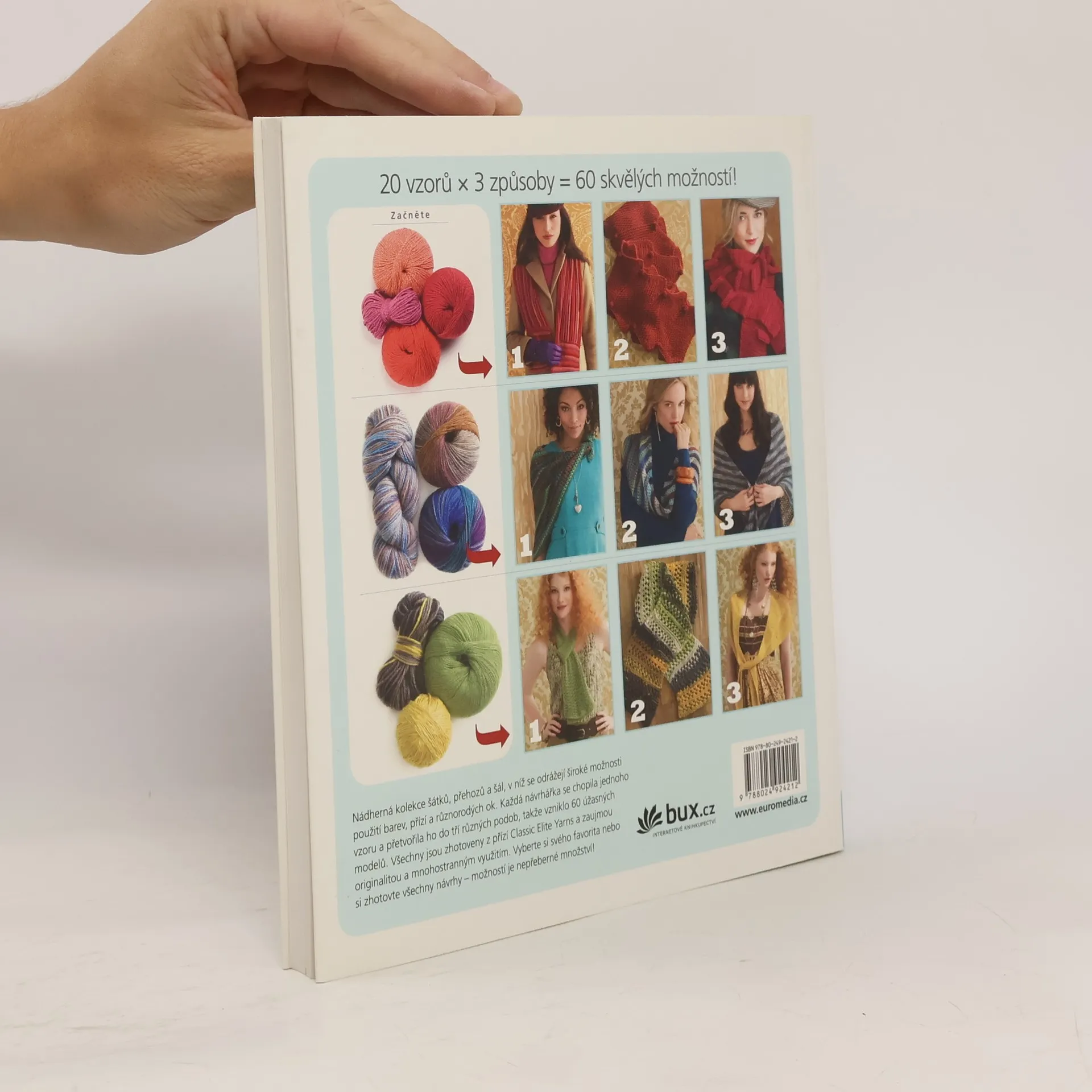 20 módních vzorů * Každý ve 3 podobách Když vezmete 20 neobvyklých vzorů a z každého vytvoříte tři pletené doplňky, dostanete 60 modelů šál, šátků, návleků, plédů a pelerín. V nádherné pletené kolekci se odrážejí široké možnosti použití barev, přízí a různorodých ok. Každá návrhářka se chopila jednoho vzoru a přetvořila ho do tří různých podob. Všechny jsou zhotoveny z přízí Classic Elite Yarns a zaujmou originalitou a mnohostranným využitím. Vyberte si svého favorita nebo si zhotovte všechny návrhy – možností je nepřeberné množství!