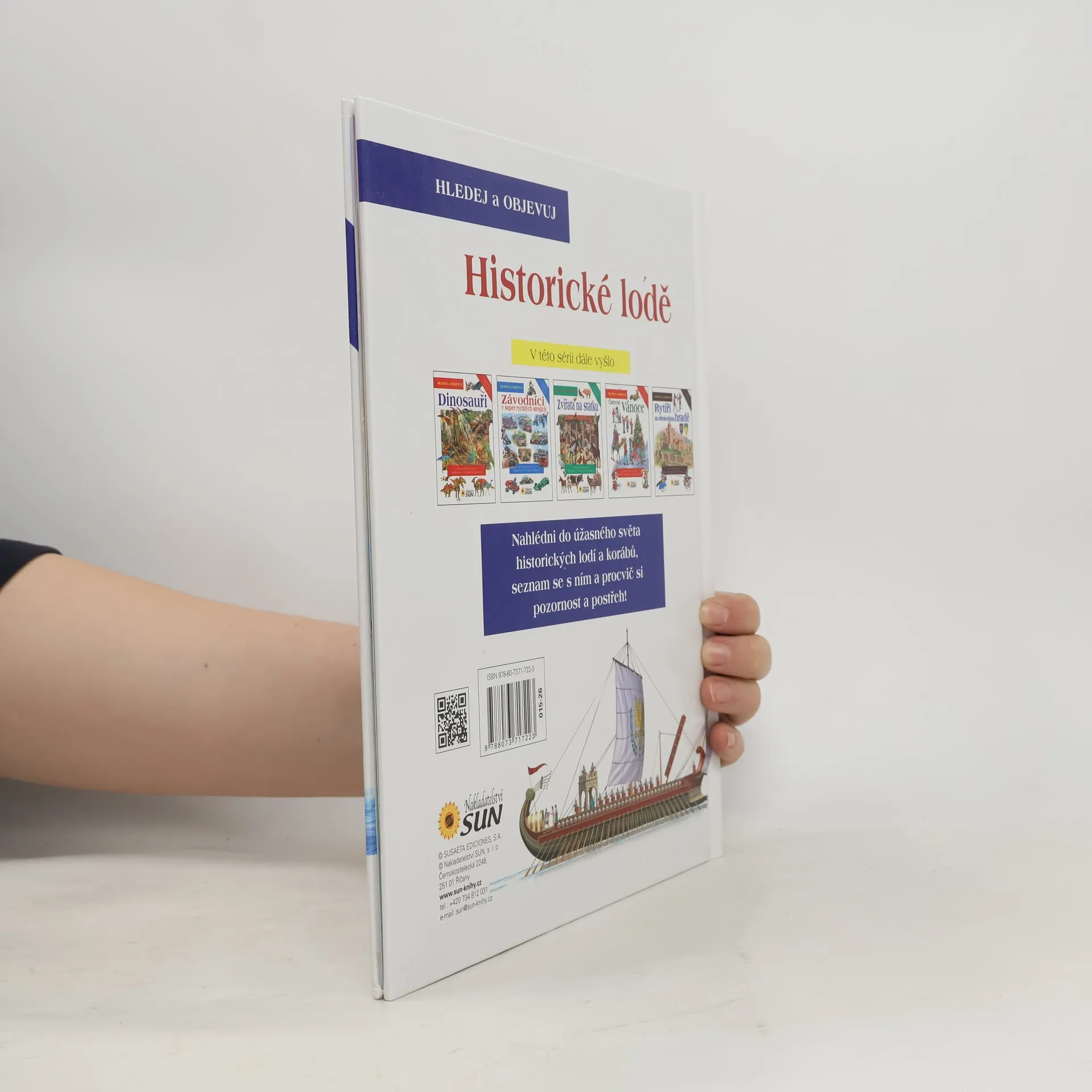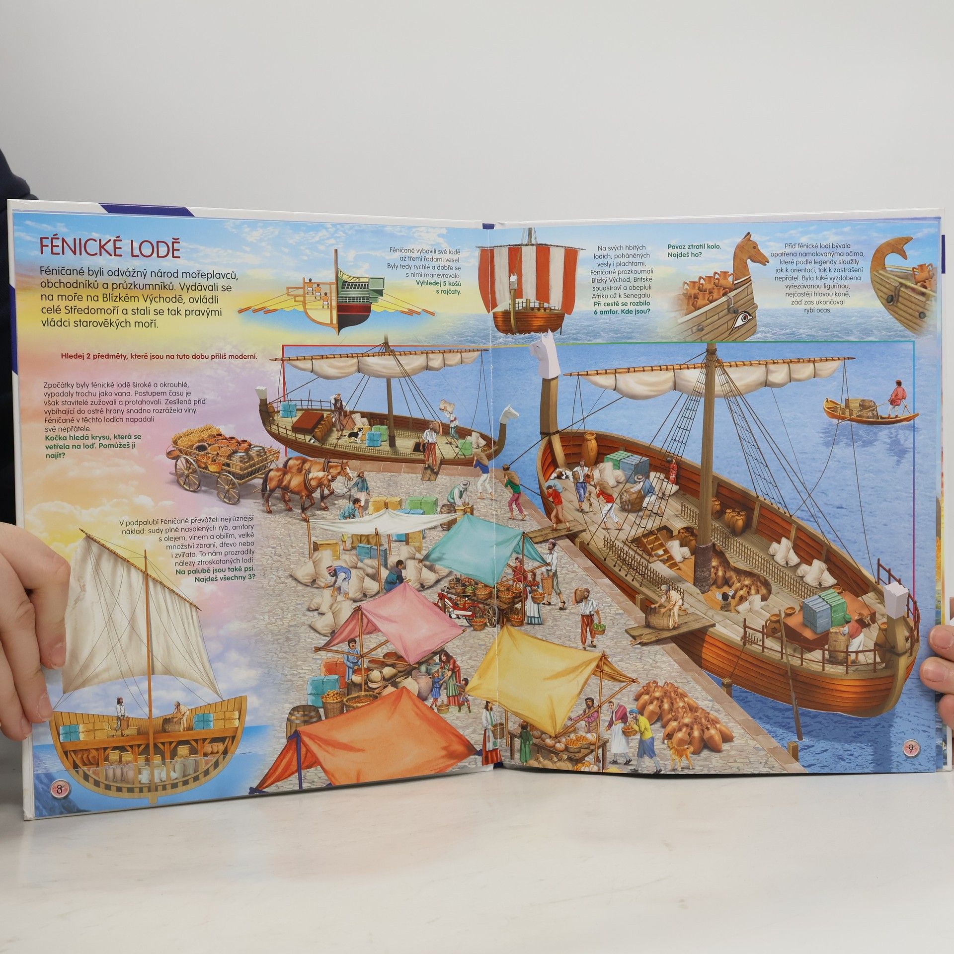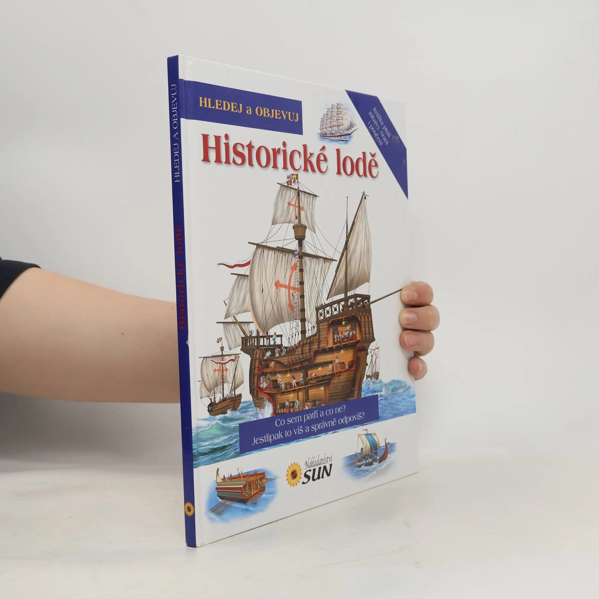 Děti se dozvědí spoustu zajímavých informací o různých tématech. Na obrázcích pak vyhledají předměty, které tam nepatří, ale také ty, jež se tématu týkají. Kniha představuje lodě od antiky přes středověké koráby až po velké obchodní plachetnice 19. století. Zvláštní kapitola se týká pirátů a námořních bitev. Každé kapitole je věnována dvoustrana s krátkými texty a barevnými ilustracemi, kde jsou navíc poschovávané různé předměty, které je potřeba najít. Obrazová publikace představující lodě v průběhu věků od nejjednodušších plavidel až po největší plachetnice.