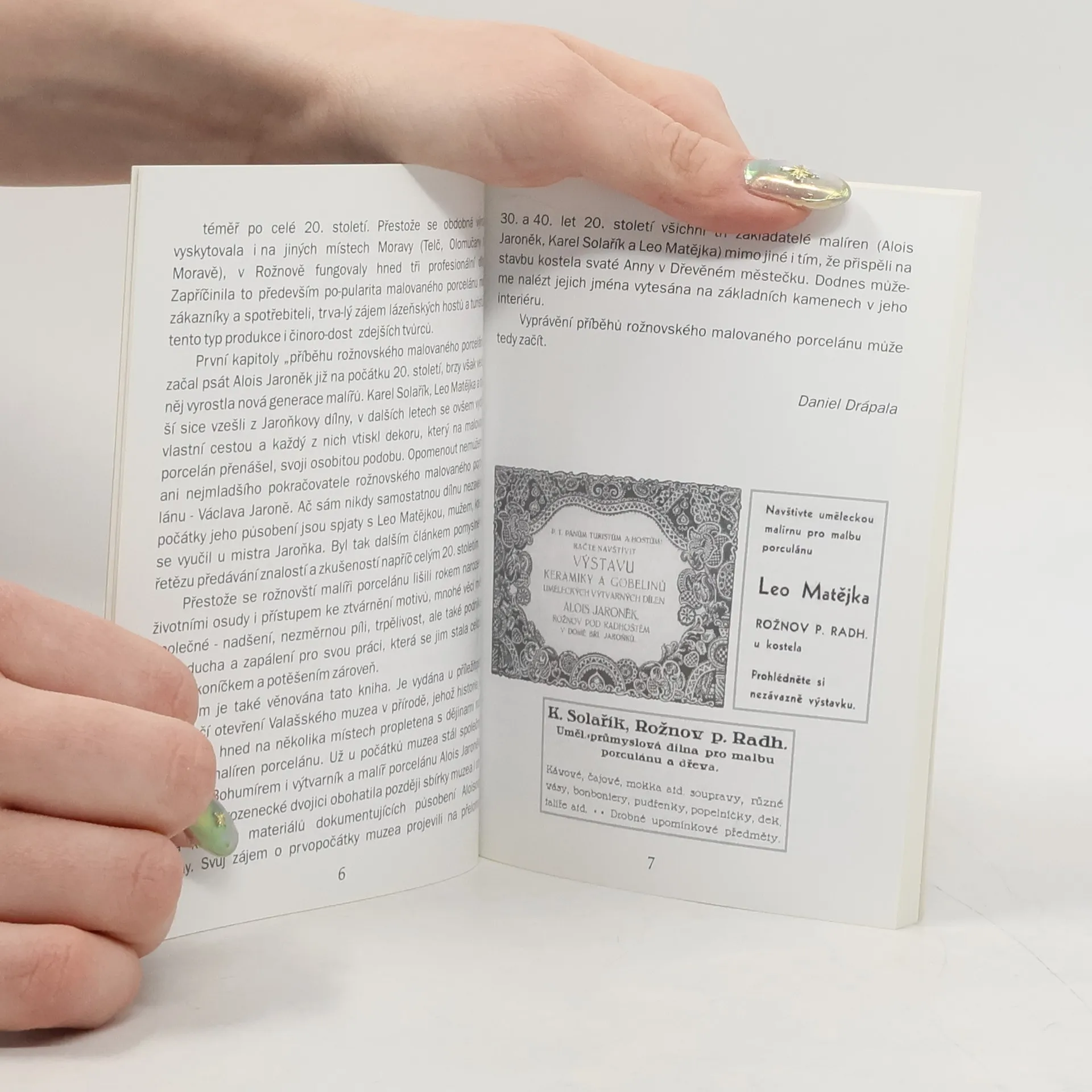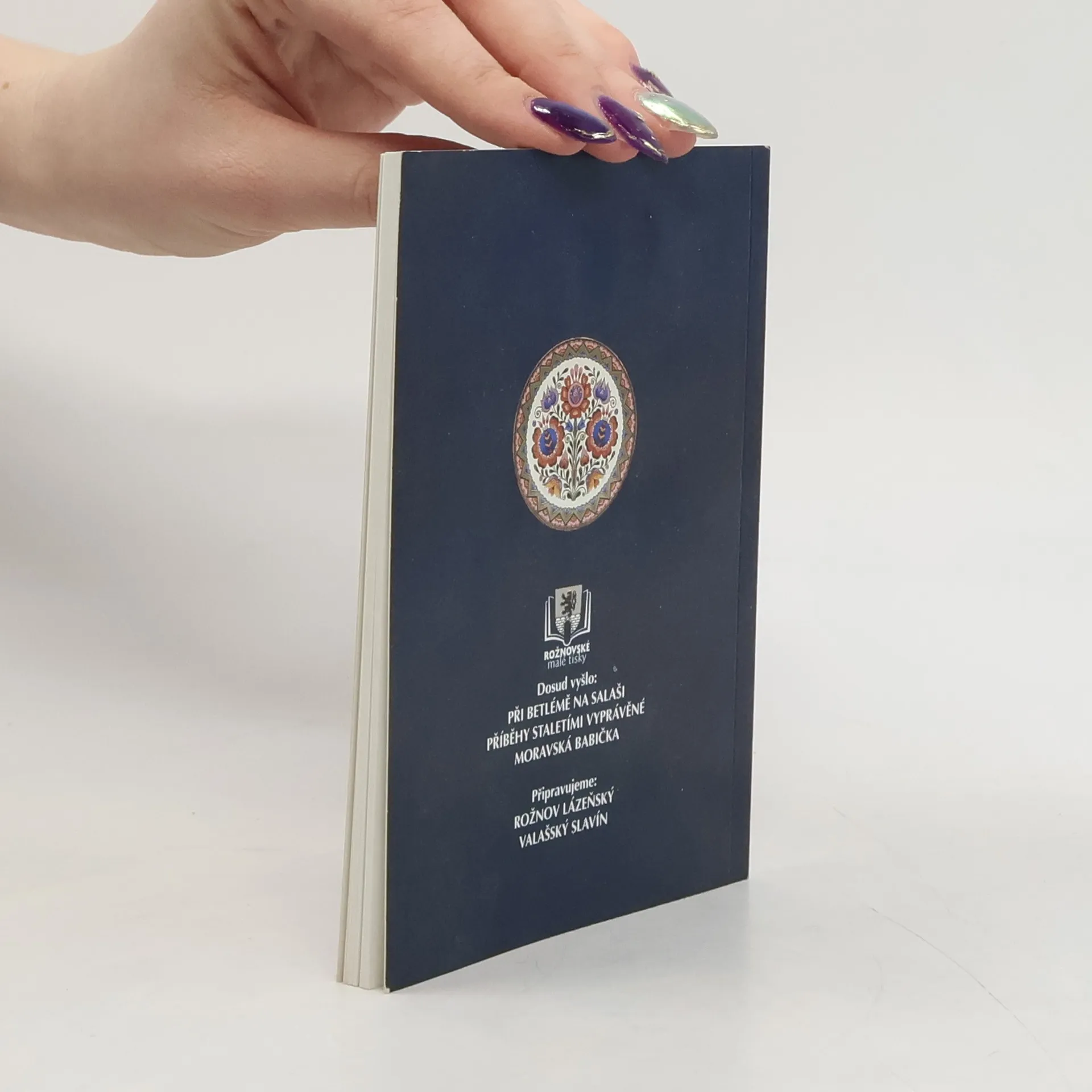 Historie více než sto let trvající tradice malovaného porcelánu v Rožnově pod Radhoštěm. První dílnu na malovaný porcelán založil již na počátku 20. století Alois Jaroněk, na nějž navázali např. Karel Solařík a Leo Matějka, posledním pokračovatelem byl Václav Jaroň. Kniha je vlastně malým průvodcem po jednotlivých dílnách, přibližuje životní i profesní osudy jednotlivých malířů, inspirační zdroje atd. Přináší také četné dobové fotografie, barevné snímky malovaného porcelánu i značky jednotlivých malířů.