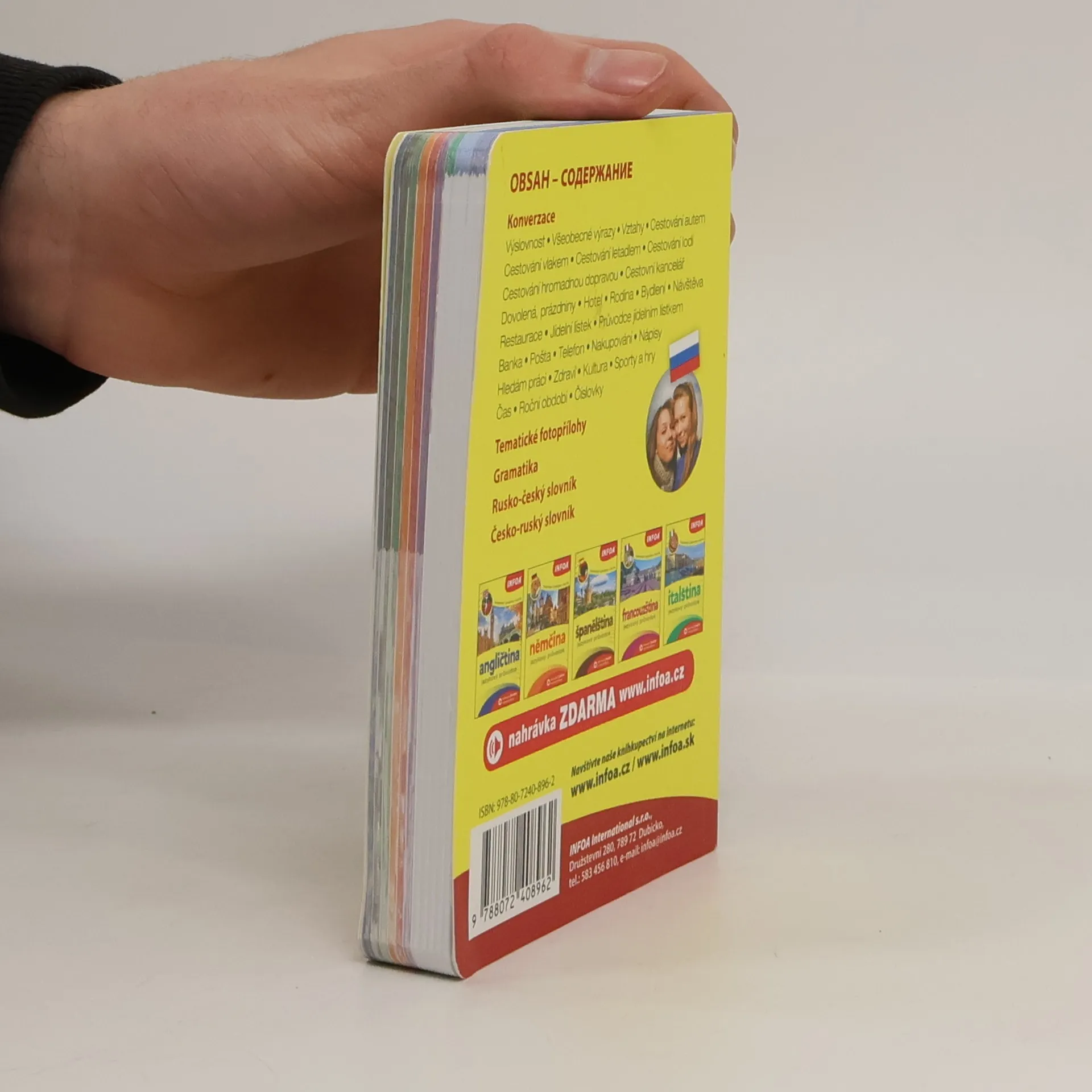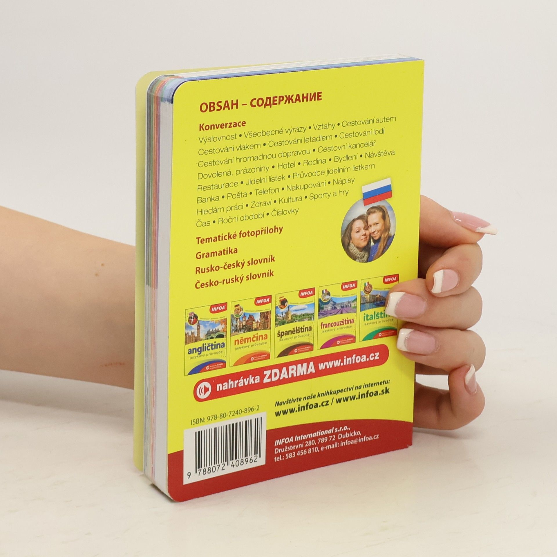 Přehledná jazyková příručka obsahuje základní konverzační témata potřebná v situacích, které nás při cestování potkávají – hotel, restaurace, nakupování atd. Dále zde najdete tematické fotopřílohy, přehled gramatiky a oboustranný slovník. Obsáhlá nahrávka ZDARMA ke stažení na www.infoa.cz.