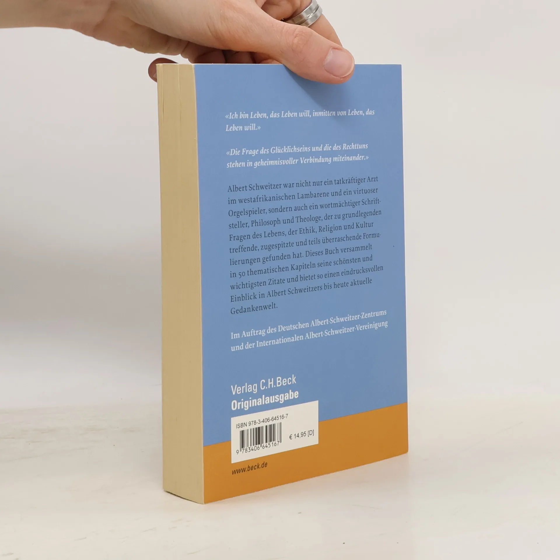 Albert Schweitzer war nicht nur ein tatkräftiger Arzt im westafrikanischen Lambarene und ein virtuoser Orgelspieler, sondern zugleich auch ein wortmächtiger Schriftsteller und Prediger, der zu grundlegenden Fragen des Lebens, der Ethik, der Religion und der Kultur treffende, zugespitzte und teils überraschende Formulierungen gefunden hat. Dieses Buch versammelt in 50 thematischen Kapiteln seine schönsten Zitate, darunter die klassischen Formulierungen wie „Ich bin Leben, das leben will, inmitten von Leben, das leben will“, aber auch Sätze aus den nachgelassenen Werken, die neu zu entdecken sind. Insgesamt bietet das Buch, das auch fortlaufend gelesen werden kann, einen eindrucksvollen Einblick in Albert Schweitzers bis heute aktuelle Gedankenwelt.