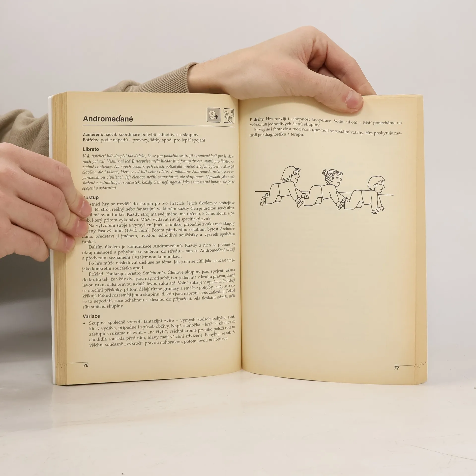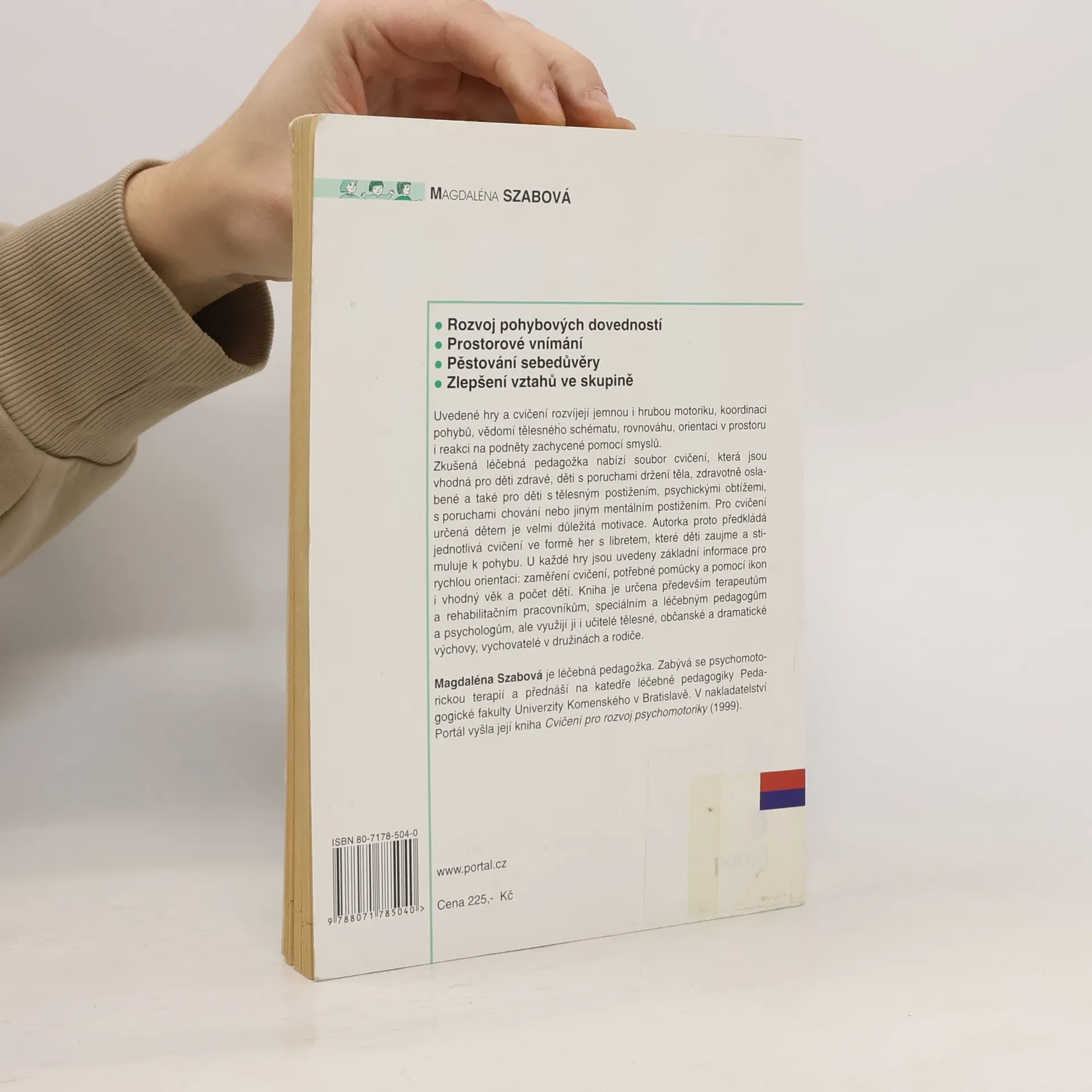 Pohybové hry pro děti od 6 do 14 let. Cvičení jsou vhodná pro zdravé i postižené děti s mentálním i tělesným postižením, při poruchách držení těla, pro zdravotně oslabené děti, pro děti s psychickými obtížemi nebo s poruchami chování. Při cvičeních pro rozvoj dítěte je velmi důležitá motivace. Proto je autorka podává ve formě her s libretem, které zaujme a stimuluje k pohybu. Uvedené hry a cvičení rozvíjejí jemnou i hrubou motoriku, koordinaci pohybů, vědomí tělesného schématu, rovnováhu, orientaci v prostoru i reakci na podněty zachycené pomocí smyslů. Zkušená léčebná pedagožka nabízí soubor cvičení, která jsou vhodná pro děti zdravé, děti s poruchami držení těla, zdravotně oslabené a také pro děti s tělesným postižením, psychickými obtížemi, s poruchami chování nebo jiným mentálním postižením. Pro cvičení určená dětem je velmi důležitá motivace. Autorka proto předkládá jednotlivá cvičení ve formě her s libretem, které děti zaujme a stimuluje k pohybu. U každé hry jsou uvedeny základní informace pro rychlou orientaci: zaměření cvičení, potřebné pomůcky a pomocí ikon i vhodný věk a počet dětí. Kniha je určena především terapeutům a rehabilitačním pracovníkům, speciálním a léčebným pedagogům a psychologům, ale využijí ji i učitelé tělesné, občanské a dramatické výchovy, vychovatelé v družinách a rodiče.