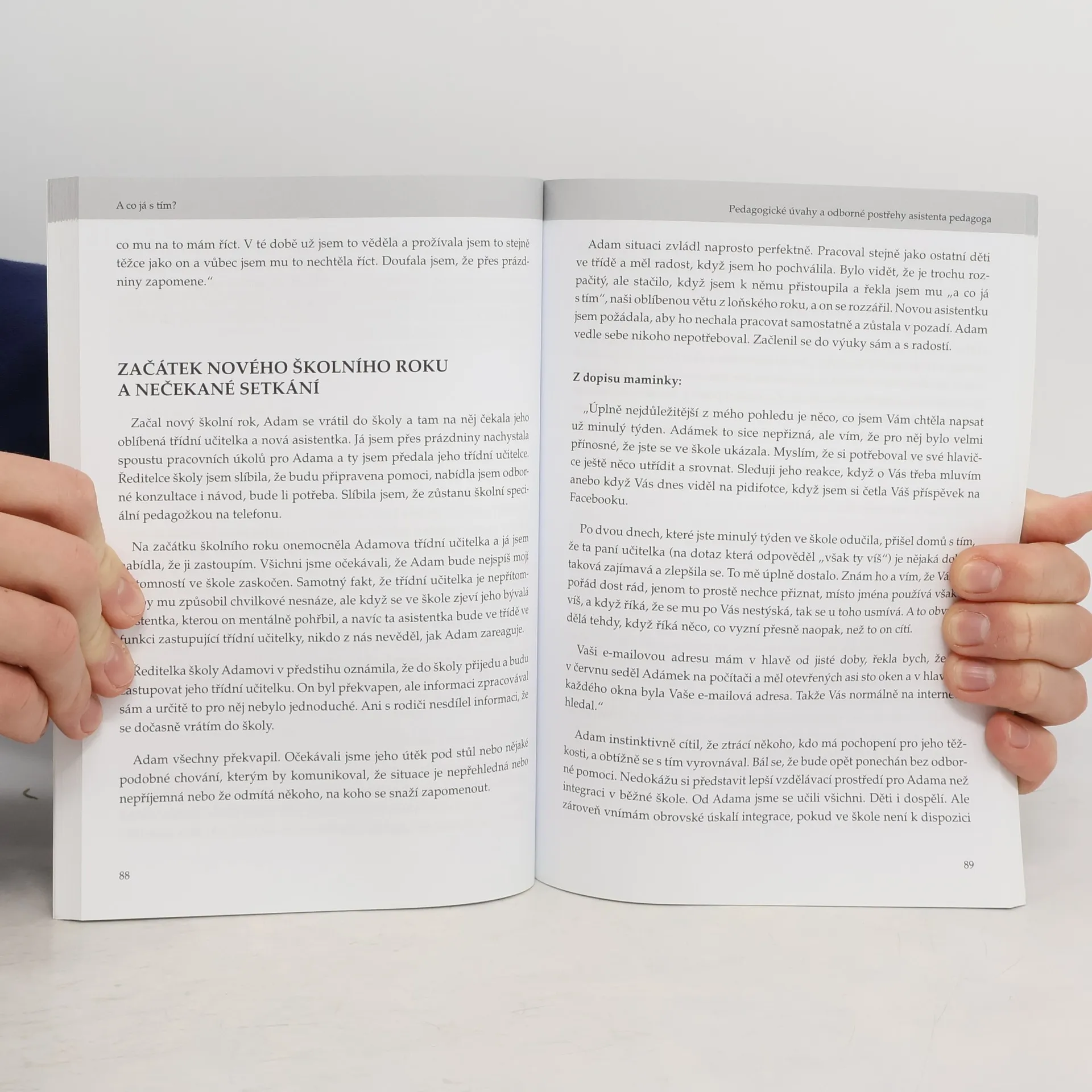 Velmi aktuální kniha zabývající se tématem integrace, inkluze a desegregace. V první části knihy Jana Bradley odborně popisuje své postřehy z pozice asistenta pedagoga v české škole a prokládá je vlastními úvahami i příběhy ze svých speciálně pedagogických zkušeností z USA. Ve druhé části popisuje své profesní začátky v USA a srovnává rozdíly ve speciálně pedagogické péči v ČR a v USA, nabízí postřehy i zkušenosti s integrací dětí s postižením, zmiňuje vývoj odborné terminologie, historický vývoj speciálního školství v USA, zvláště postup od nepřípustné segregace přes málo funkční desegregaci až k velmi funkční integraci dětí s postižením. Zmiňuje také alternativní a augmentativní komunikaci dětí, které nedisponují schopností efektivně komunikovat řečí.