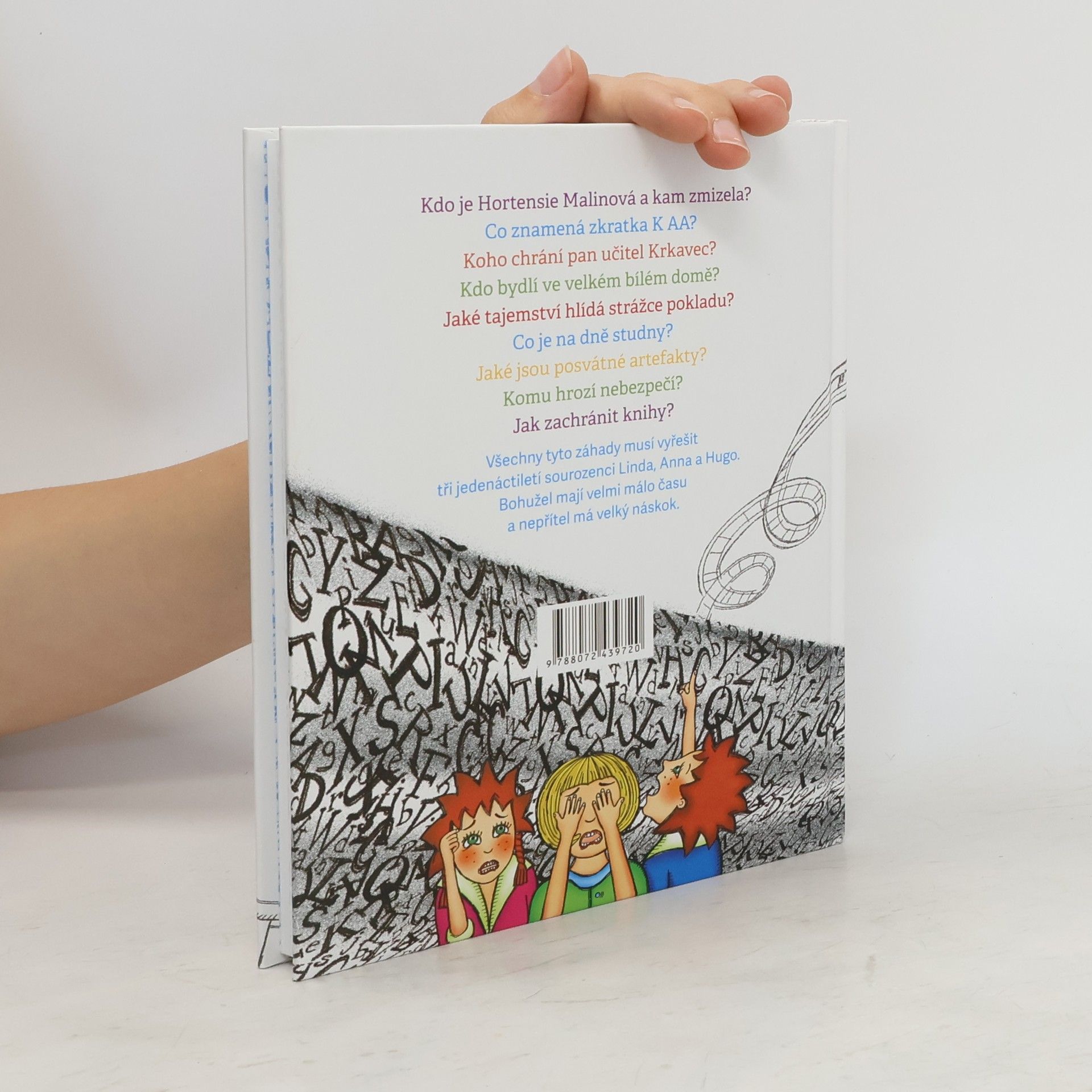 Kdo je Hortensie Malinová a kam zmizela? Co znamená zkratka K AA? Koho chrání pan učitel Krkavec? Kdo bydlí ve velkém bílém domě? Jaké tajemství hlídá strážce pokladu? Co je na dně studny? Jaké jsou posvátné artefakty? Komu hrozí nebezpečí? Jak zachránit knihy? Všechny tyto záhady musí vyřešit tři jedenáctiletí sourozenci Linda, Anna a Hugo. Bohužel mají velmi málo času a nepřítel má velký náskok.