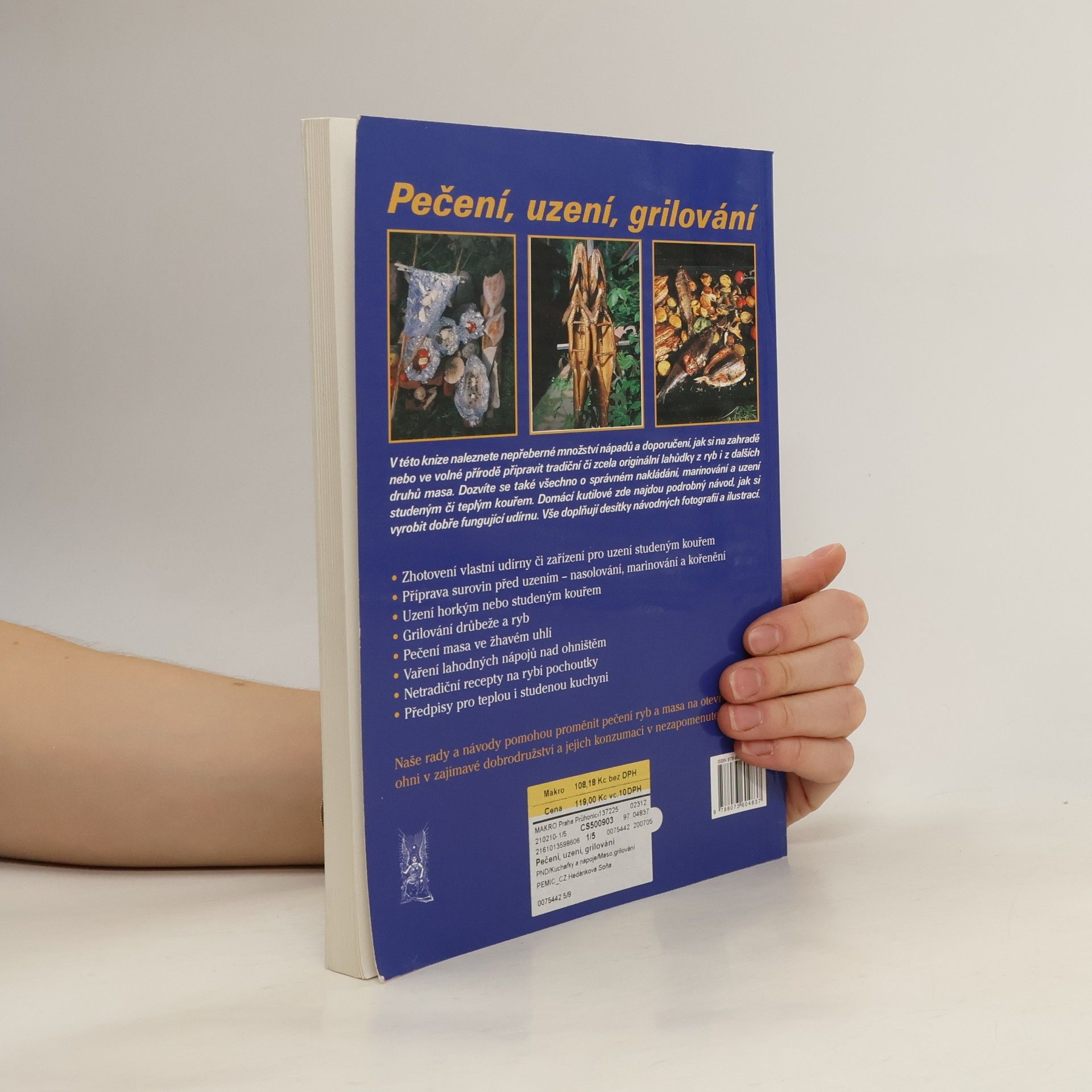 V této knize naleznete nepřeberné množství nápadů a doporučení, jak si na zahradě nebo ve volné přírodě připravit tradiční či zcela originální lahůdky z ryb i z dalších druhů masa. Dozvíte se také všechno o správném nakládání, marinování a uzení studeným či teplým kouřem. Domácí kutilové zde najdou podrobný návod, jak si vyrobit dobře fungující udírnu. Vše doplňují desítky návodných fotografií a ilustrací. Stavba vlastní udírny či zařízení pro uzení studeným kouřem Příprava surovin před uzením – nasolování, marinování a kořenění Uzení horkým nebo studeným kouřem Grilování drůbeže a ryb Pečení masa ve žhavém uhlí Vaření lahodných nápojů nad ohništěm Netradiční recepty na rybí pochoutky Předpisy pro teplou i studenou kuchyni Naše rady a návody pomohou proměnit pečení ryb na otevřeném ohni v zajímavé dobrodružství a jejich konzumaci v nezapomenutelný zážitek.