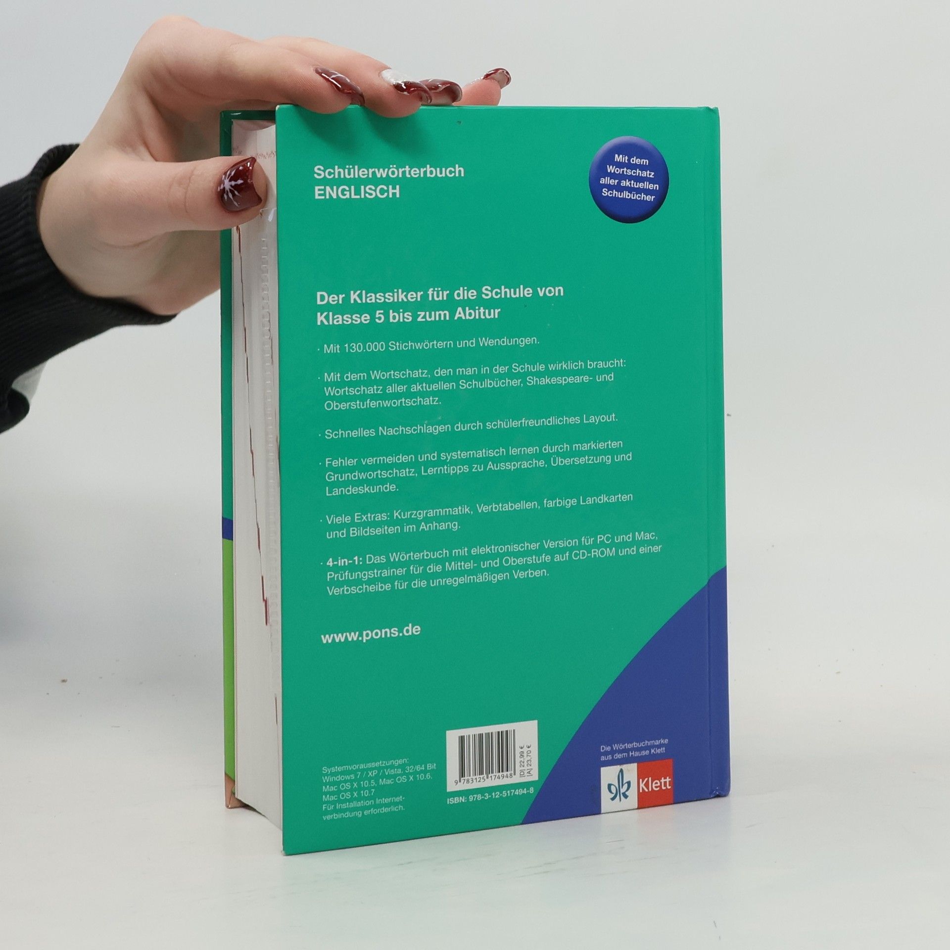 Das Wörterbuch für die komplette Schulzeit bis zum Abitur bietet dir mit 130.000 Stichwörtern und Wendungen den gesamten Wortschatz aktueller Schulbücher, perfekt abgestimmt auf Lehrpläne und Unterrichtsthemen. Die schnelle Suche wird durch Stichwörter in blauer Schrift und eine alphabetische Suchleiste am Seitenrand erleichtert. Wichtige Wörter sind durch den blau hinterlegten Grundwortschatz hervorgehoben. Die korrekte Übersetzung und Aussprache wird durch zahlreiche Info-Boxen zu Grammatik, Aussprache, Land und Leuten sowie falschen Freunden unterstützt. Das Wörterbuch ist nicht nur in der Schule, sondern auch zu Hause hilfreich. Die Drehscheibe für unregelmäßige Verben hilft dir, alle Verbformen im Blick zu behalten, indem sie die deutsche Übersetzung sowie die Formen im Simple Past, Past Participle und die -ing-Form anzeigt. Nützliche Formulierungshilfen in Deutsch und Englisch unterstützen dich beim Schreiben eigener Texte.