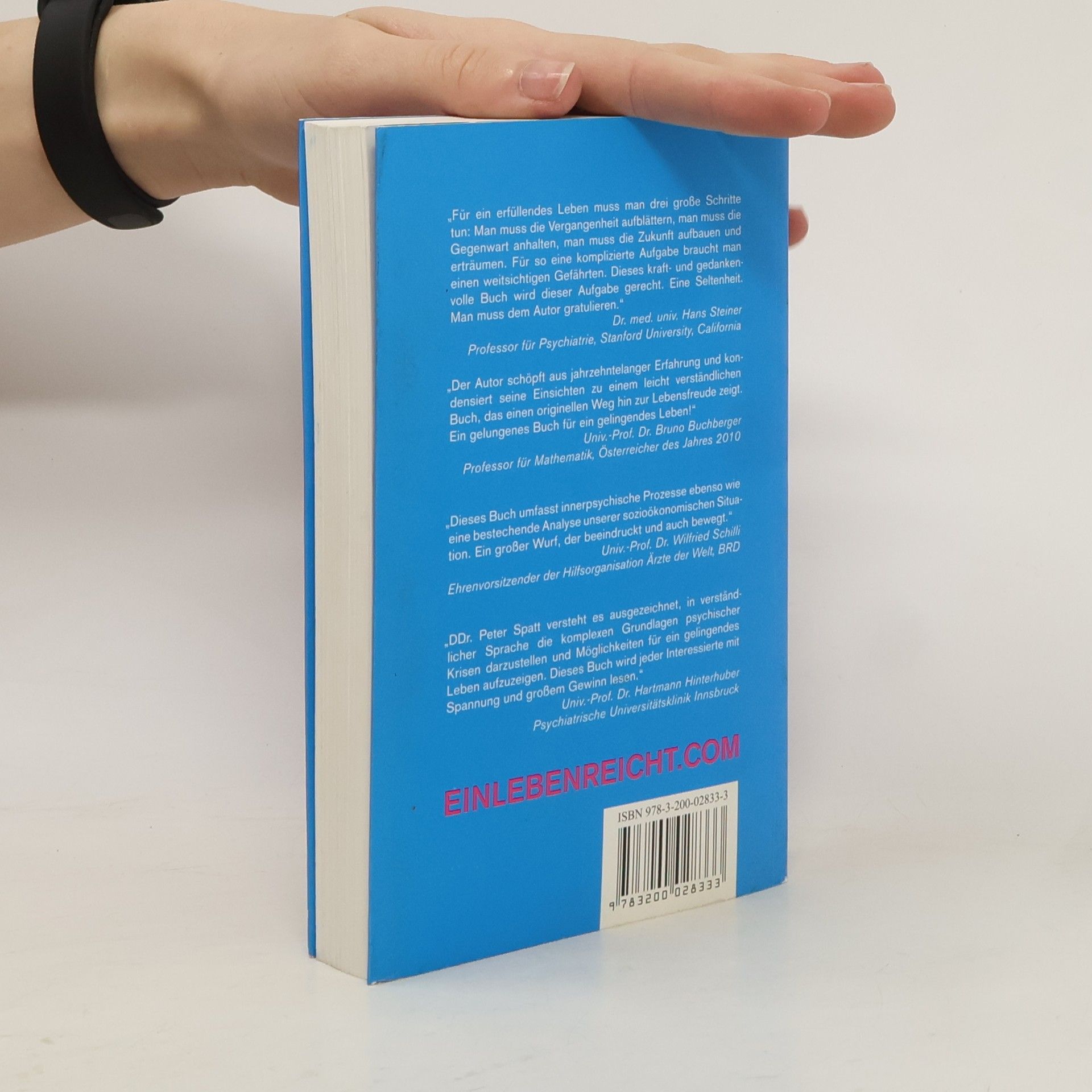„Für ein erfüllendes Leben muss man drei große Schritte tun: Man muss die Vergangenheit aufblättern, man muss die Gegenwart anhalten, man muss die Zukunft aufbauen und erträumen. Für so eine komplizierte Aufgabe braucht man einen weitsichtigen Gefährten. Dieses kraft- und gedankenvolle Buch wird dieser Aufgabe gerecht. Eine Seltenheit. Man muss dem Autor gratulieren.“ Dr. med. univ. Hans Steiner Professor für Psychiatrie, Stanford University, California „Der Autor schöpft aus jahrzehntelanger Erfahrung und kondensiert seine Einsichten zu einem leicht verständlichen Buch, das einen originellen Weg hin zur Lebensfreude zeigt. Ein gelungenes Buch für ein gelingendes Leben!“ Univ.-Prof. Dr. Bruno Buchberger Professor für Mathematik, Österreicher des Jahres 2010 „Dieses Buch umfasst innerpsychische Prozesse ebenso wie eine bestechende Analyse unserer sozioökonomischen Situation. Ein großer Wurf, der beeindruckt und auch bewegt.“ Univ.-Prof. Dr. Wilfried Schilli Ehrenvorsitzender der Hilfsorganisation Ärzte der Welt, BRD „DDr. Peter Spatt versteht es ausgezeichnet, in verständlicher Sprache die komplexen Grundlagen psychischer Krisen darzustellen und Möglichkeiten für ein gelingendes Leben aufzuzeigen. Dieses Buch wird jeder Interessierte mit Spannung und großem Gewinn lesen.“ Univ.-Prof. Dr. Hartmann Hinterhuber Psychiatrische Universitätsklinik Innsbruck