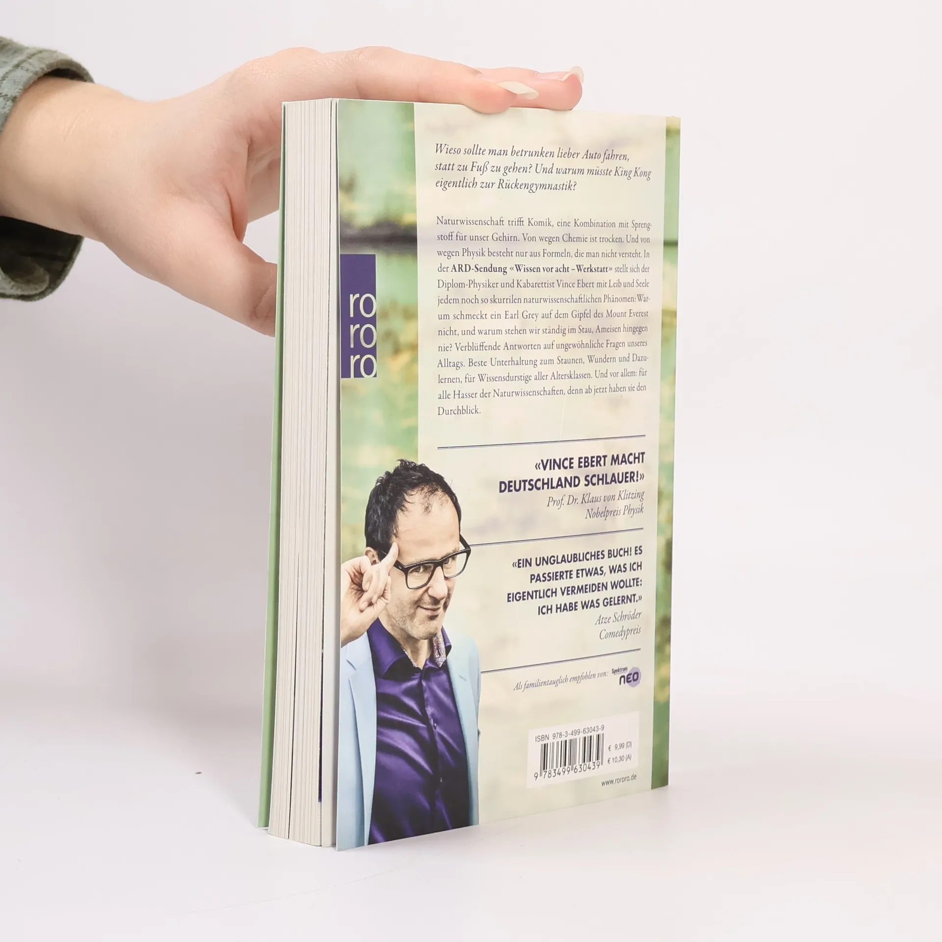 Wieso sollte man betrunken lieber Auto fahren, statt zu Fuß zu gehen? Und warum müsste King Kong eigentlich zur Rückengymnastik?Naturwissenschaft trifft Komik, eine Kombination mit Spreng-stoff für unser Gehirn. Von wegen Chemie ist trocken. Und von wegen Physik besteht nur aus Formeln, die man nicht versteht. In der ARD-Sendung «Wissen vor acht–Werkstatt» stellt sich der Diplom-Physiker und Kabarettist Vince Ebert mit Leib und Seele jedem noch so skurrilen naturwissenschaftlichen Phänomen: Warum schmeckt ein Earl Grey auf dem Gipfel des Mount Everest nicht, und warum stehen wir ständig im Stau, Ameisen hingegen nie? Verblüffende Antworten auf ungewöhnliche Fragen unseres Alltags. Beste Unterhaltung zum Staunen, Wundern und Dazulernen, für Wissensdurstige aller Altersklassen. Und vor allem: für alle Hasser der Naturwissenschaften, denn ab jetzt haben sie den Durchblick.