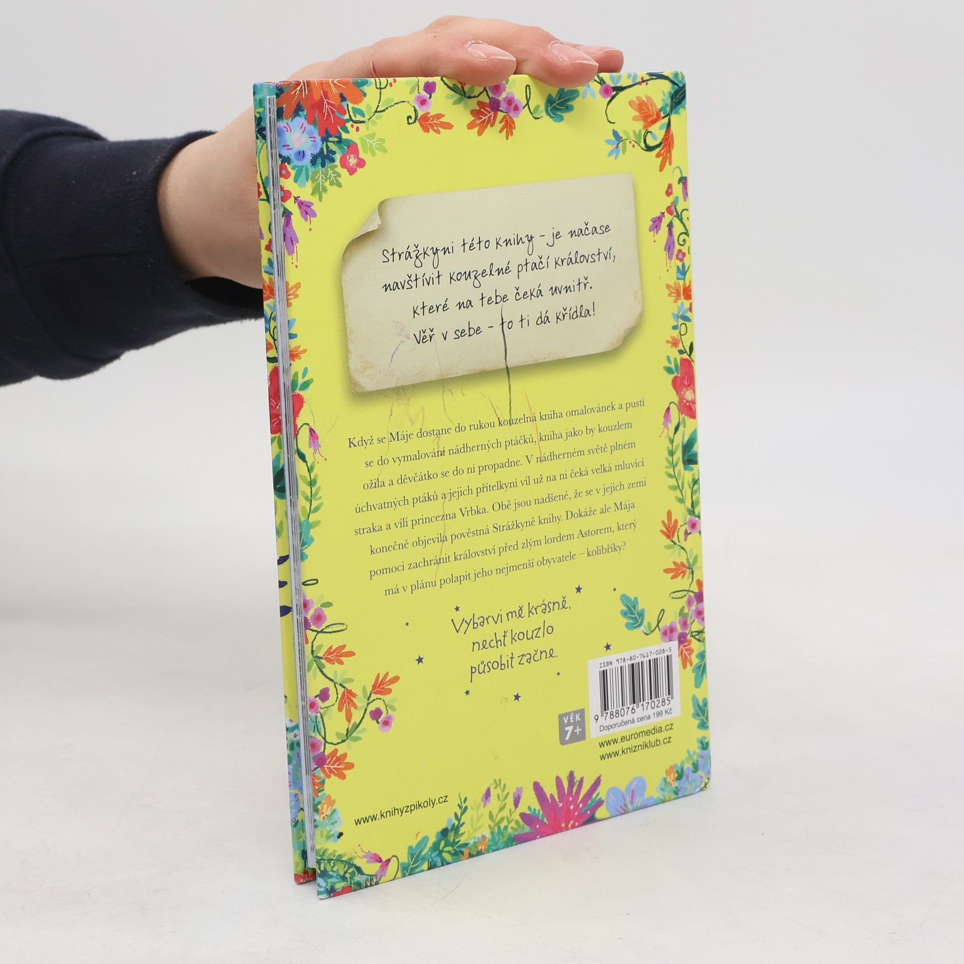 Když se Máje dostane do rukou kouzelná kniha omalovánek a pustí se do vymalování nádherných ptáčků, kniha jako by kouzlem ožila a děvčátko se do ní propadne. V nádherném světě plném úchvatných ptáků a jejich přítelkyň víl už na ni čeká velká mluvící straka a vílí princezna Vrbička. Obě jsou nadšené, že se v jejich zemi konečně objevila pověstná Strážkyně knihy. Dokáže ale Mája pomoci zachránit království před zlým lordem Astorem, který má v plánu polapit jeho nejmenší obyvatele – kolibříky? A bude mít děvčátko dost odvahy na jejich záchranu? Kniha je určena dětem od 7 let a doprovází ji krásné ilustrace Rosie Butcherové.