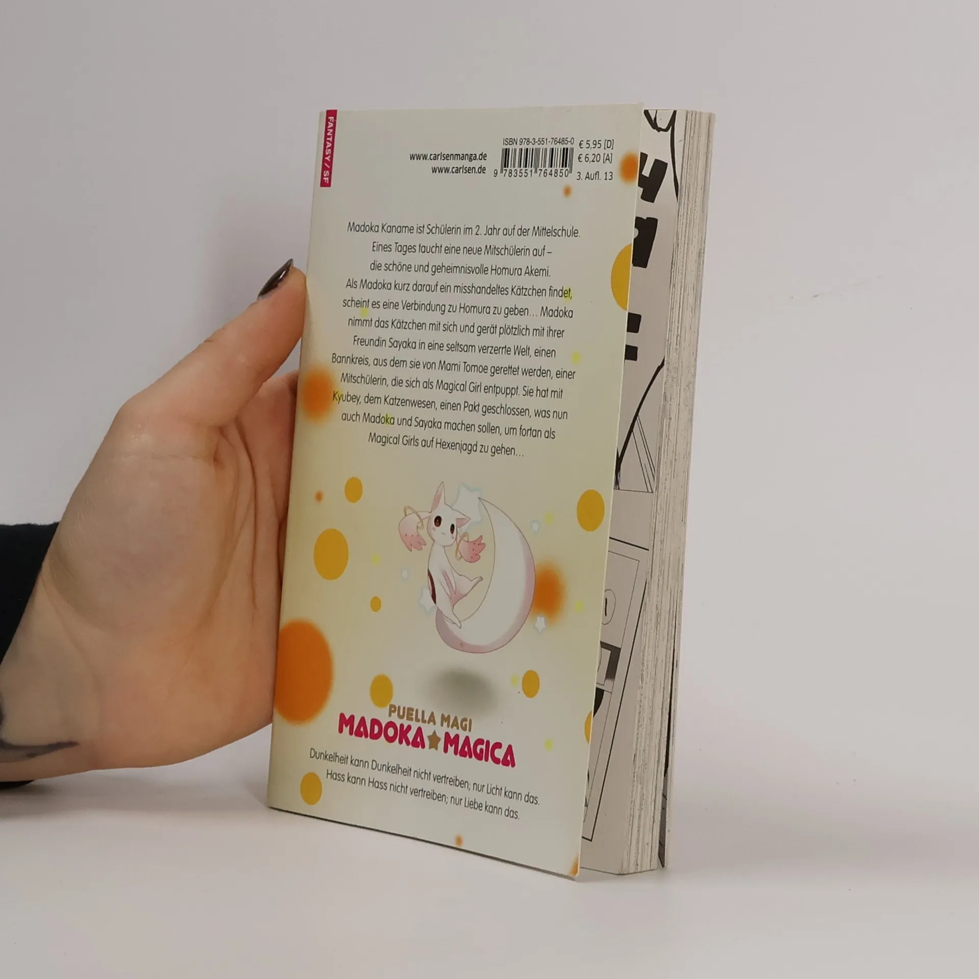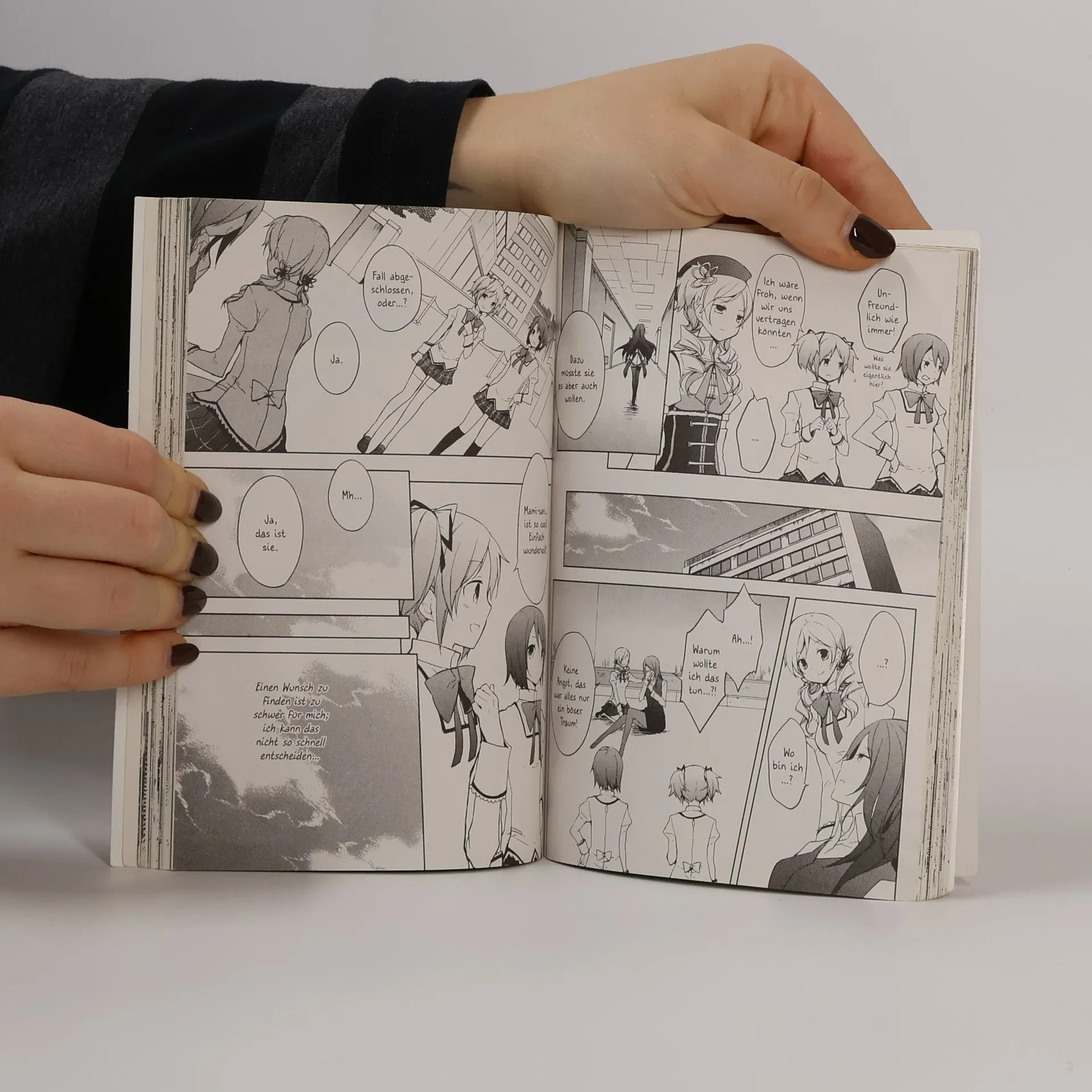 Madoka Kaname ist Schülerin im 2. Jahr auf der Mittelschule. Eines Tages taucht eine neue Mitschülerin auf – die schöne und geheimnisvolle Homura Akemi. Als Madoka kurz darauf ein misshandeltes Kätzchen findet, scheint es eine Verbindung zu Homura zu geben… Madoka nimmt das Kätzchen mit sich und gerät plötzlich mit ihm und ihrer Freundin Sayaka in eine seltsam verzerrte Welt, einen Bannkreis, aus dem sie von Mami Tomoe gerettet werden, einer Mitschülerin, die sich als Magical Girl entpuppt. Sie hat mit Kyubey, dem Katzenwesen, einen Pakt geschlossen, was nun auch Madoka und Sayaka machen sollen, um fortan als Magical Girls auf Hexenjagd zu gehen…