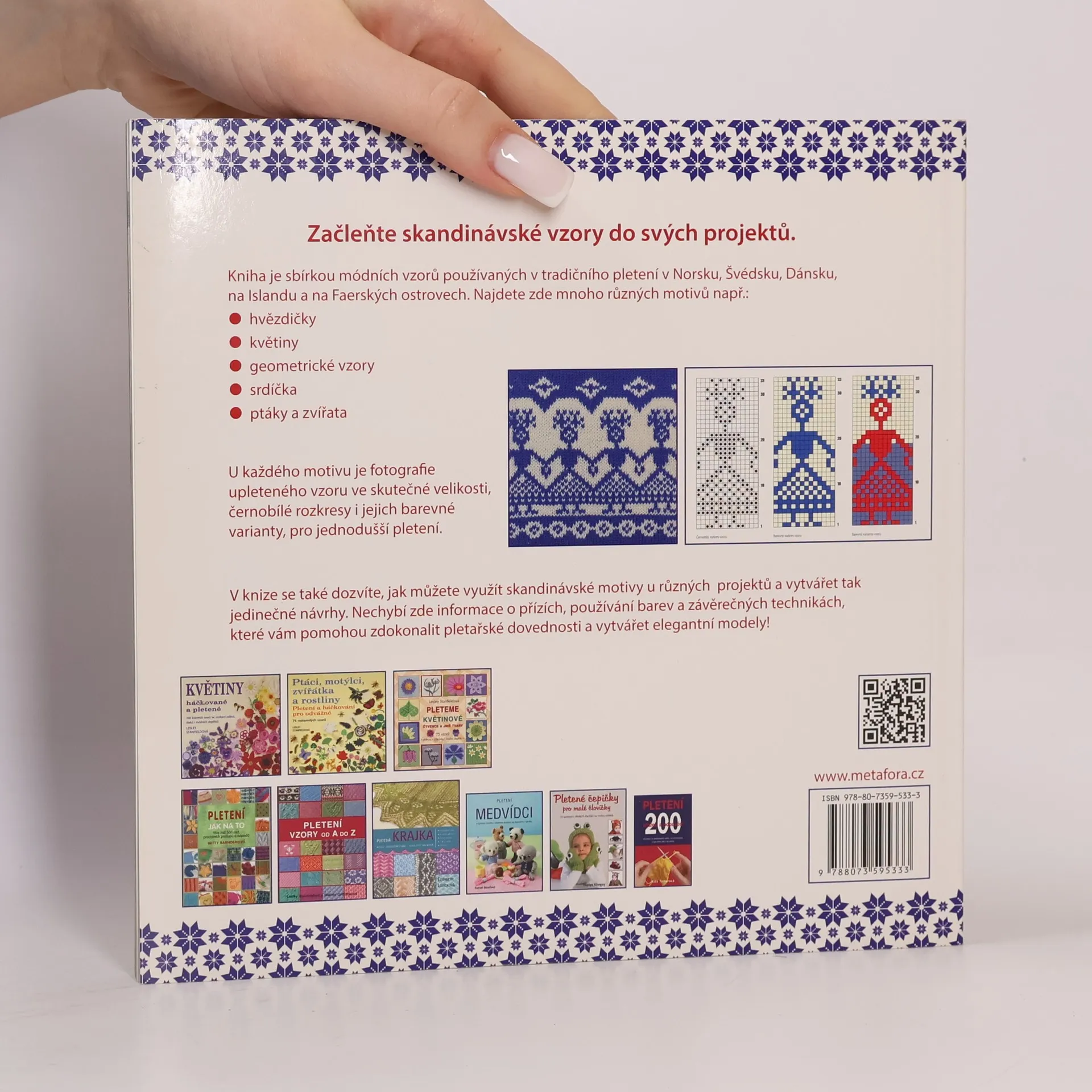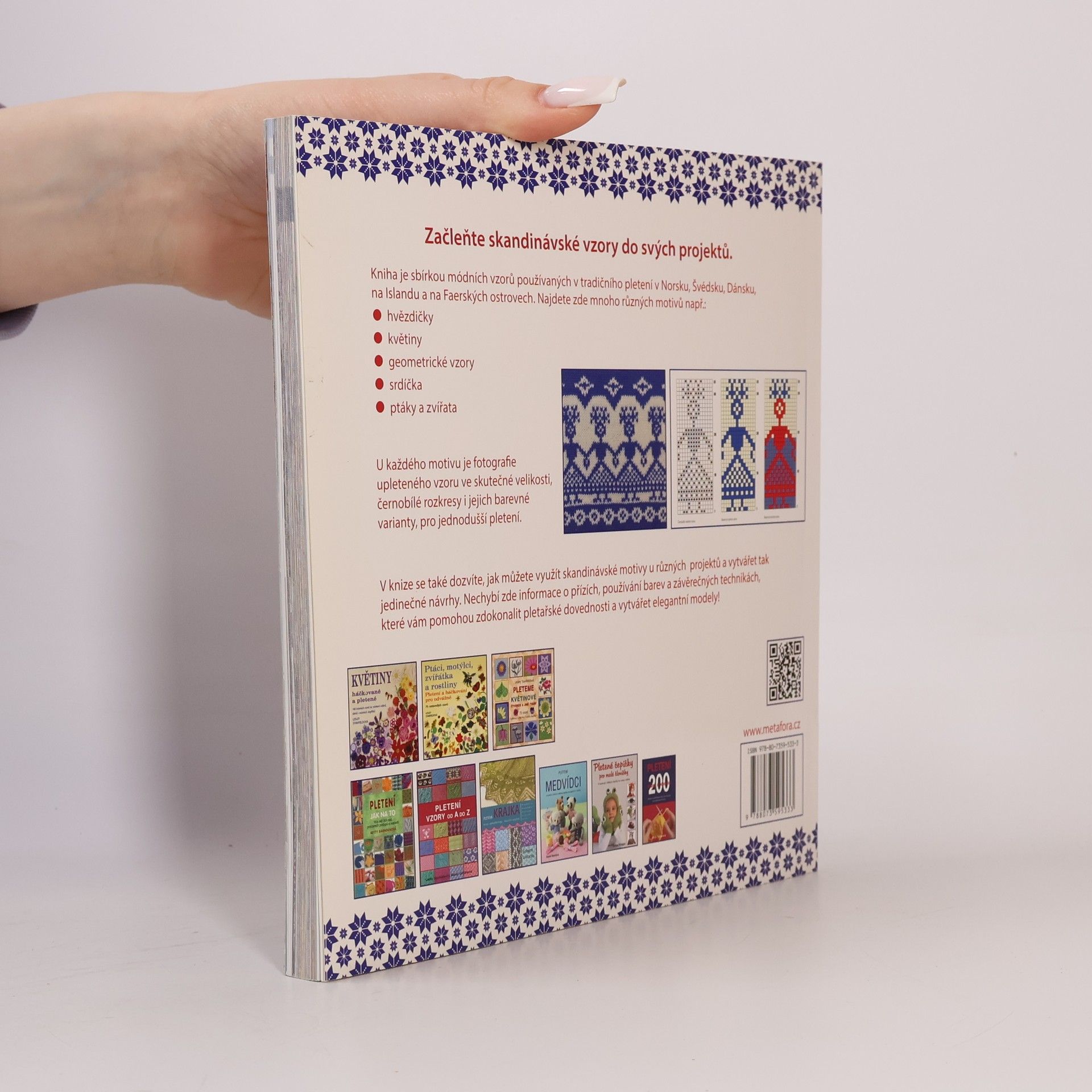 Tradiční pletené vzory ze všech severských zemí. Kniha je sbírkou módních vzorů používaných při tradičním pletení v Norsku, Švédsku, Dánsku, na Islandu a na Faerských ostrovech. Najdete zde různé barevné motivy jako jsou hvězdičky, květiny, geometrické vzory, srdíčka, ptáčci a zvířata i mnoho dalšího. U každého motivu je upletený vzorek, fotografie ve skutečné velikosti, barevné rozkresy pro snadnější pletení a barevné varianty. V knize se také dozvíte, jak můžete využít skandinávské motivy u různých projektů a vytvářet tak jedinečné návrhy. Nechybí ani informace o přízích, používání barev a závěrečných technikách, které vám pomohou zdokonalit pletařské dovednosti a vytvářet elegantní modely.