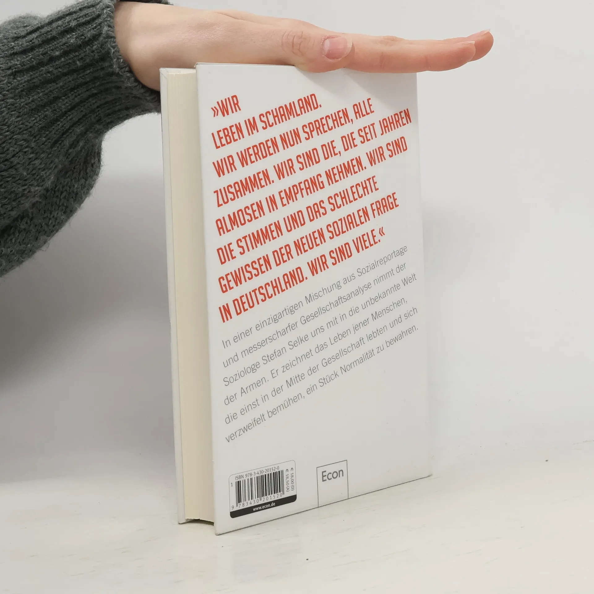 „Wir leben im Schamland. Wir werden nun sprechen, alle zusammen. Wir sind die, die seit Jahren Almosen in Empfang nehmen. Wir sind die Stimmen und das schlechte Gewissen der neuen sozialen Frage in Deutschland. Wir sind viele.“ In einer einzigartigen Mischung aus Sozialreportage und messerscharfer Gesellschaftsanalyse nimmt der Soziologe Stefan Selke uns mit in die unbekannte Welt der Armen. Er zeichnet das Leben jener Menschen, die einst in der Mitte der Gesellschaft lebten und sich verzweifelt bemühen, ein Stück Normalität zu bewahren. „Christian Lindner (FDP) hat behauptet, es gäbe in diesem Lande mehr Armutsberichte als Armut. Ich bin dankbar für jeden, der diesem Schwachsinn widerspricht.“ Dieter Hildebrandt, Kabarettist „Ein kluges, überaus mutiges und brillant recherchiertes und geschriebenes Buch.“ Jean Ziegler, Bestseller-Autor und Soziologe "Das Buch spricht das Thema Armut auf sensible und zugleich kämpferische Weise an.“ Katja Kipping, Vorsitzende DIE LINKE