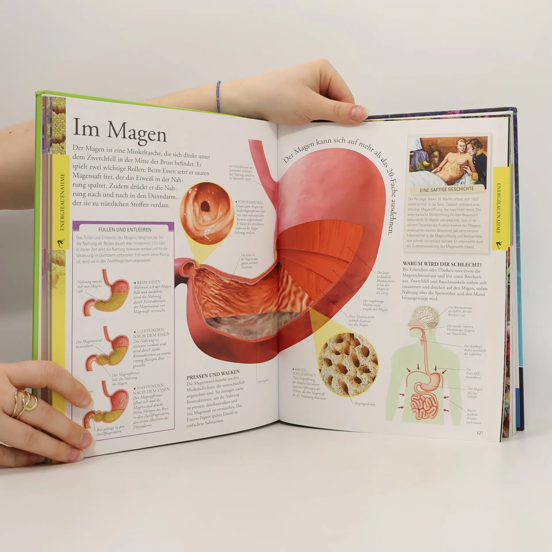 Dieses Buch nimmt Kinder mit auf eine spannende Entdeckungsreise durch den menschlichen Körper. Von Kopf bis Fuß werden Anatomie und Funktionsweise anschaulich erkundet. Detailfotos und 3D-Grafiken bieten ungewöhnliche Einblicke und garantieren eine unterhaltsame Wissensvermittlung. Eine Einführung erklärt die Grundlagen des menschlichen Körpers, gefolgt von zehn Kapiteln, die sich intensiv mit den Körpersystemen befassen. Kinder erfahren alles über Knochen, Muskeln, Blutbahnen und Organe. Fragen wie "Wie arbeitet die Lunge?" oder "Wie gelangt das Essen vom Mund in den Magen?" werden umfassend beantwortet. Ein Anhang mit einem Persönlichkeitstest und Rätseln fördert die vertiefte Auseinandersetzung mit dem Gelernten. Eine Chronik medizinischer Entdeckungen und ein Glossar fassen die wichtigsten Informationen zusammen. Die farbliche Kennzeichnung der Kapitel ermöglicht schnelles Nachschlagen. Spektakuläre Fotos zeigen anatomische Details und machen das Buch visuell ansprechend. Alle Informationen sind altersgerecht aufbereitet, und selbst komplexe Sachverhalte werden leicht verständlich erklärt. Infokästen vertiefen das Wissen, während faszinierende Zahlen und Fakten die Texte auflockern. Ideal für den Biologieunterricht und Referate!