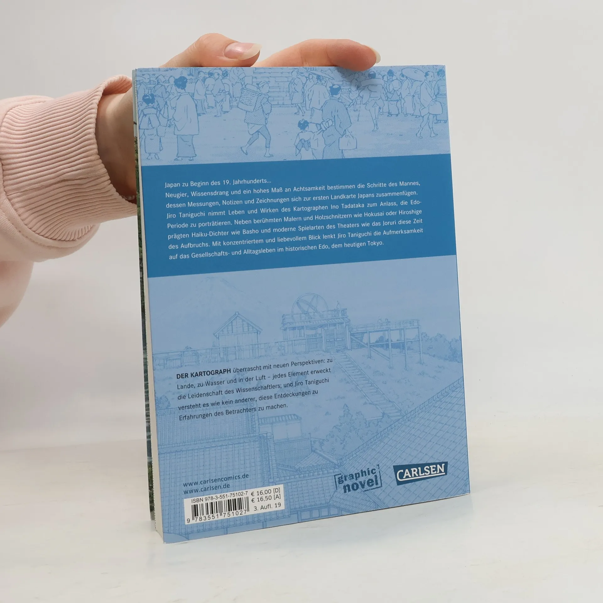 Japan zu Beginn des 19. Jahrhunderts… Neugier, Wissensdrang und ein hohes Maß an Achtsamkeit bestimmen die Schritte des Mannes, dessen Messungen, Notizen und Zeichnungen sich zur ersten Landkarte Japans zusammenfügen. Jiro Taniguchi nimmt Leben und Wirken des Kartographen Ino Tadataka zum Anlass, die Edo-Periode zu porträtieren. Neben berühmten Malern und Holzschnitzern wie Hokusai oder Hiroshige prägten Haiku-Dichter wie Basho und moderne Spielarten des Theaters wie das Joruri diese Zeit des Aufbruchs. Mit konzentriertem und liebevollem Blick lenkt Jiro Taniguchi die Aufmerksamkeit auf das Gesellschafts- und Alltagsleben im historischen Edo, dem heutigen Tokyo. DER KARTOGRAPH überrascht mit neuen Perspektiven: zu Lande, zu Wasser und in der Luft – jedes Element erweckt die Leidenschaft des Wissenschaftlers. Und wie kein anderer versteht es Jiro Taniguchi, die Entdeckungen des Kartographen zu Erfahrungen des Lesers und Betrachters zu machen.