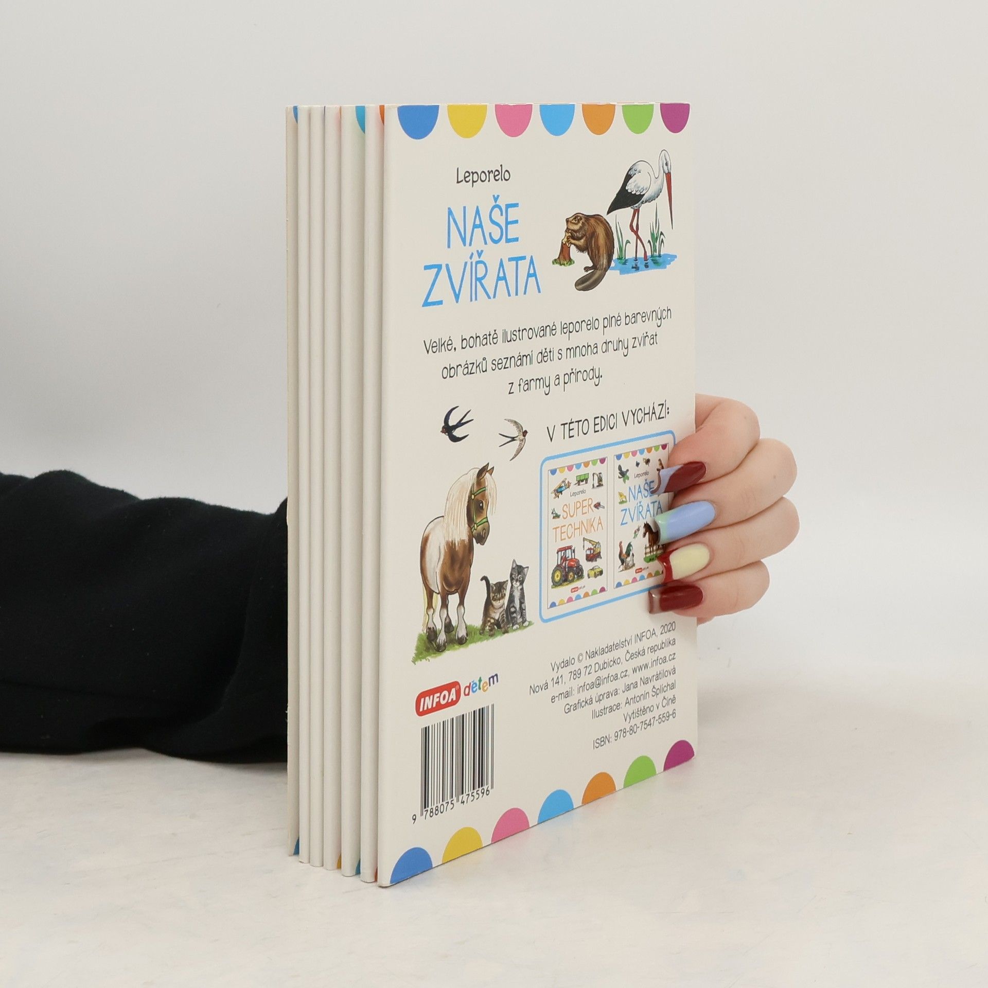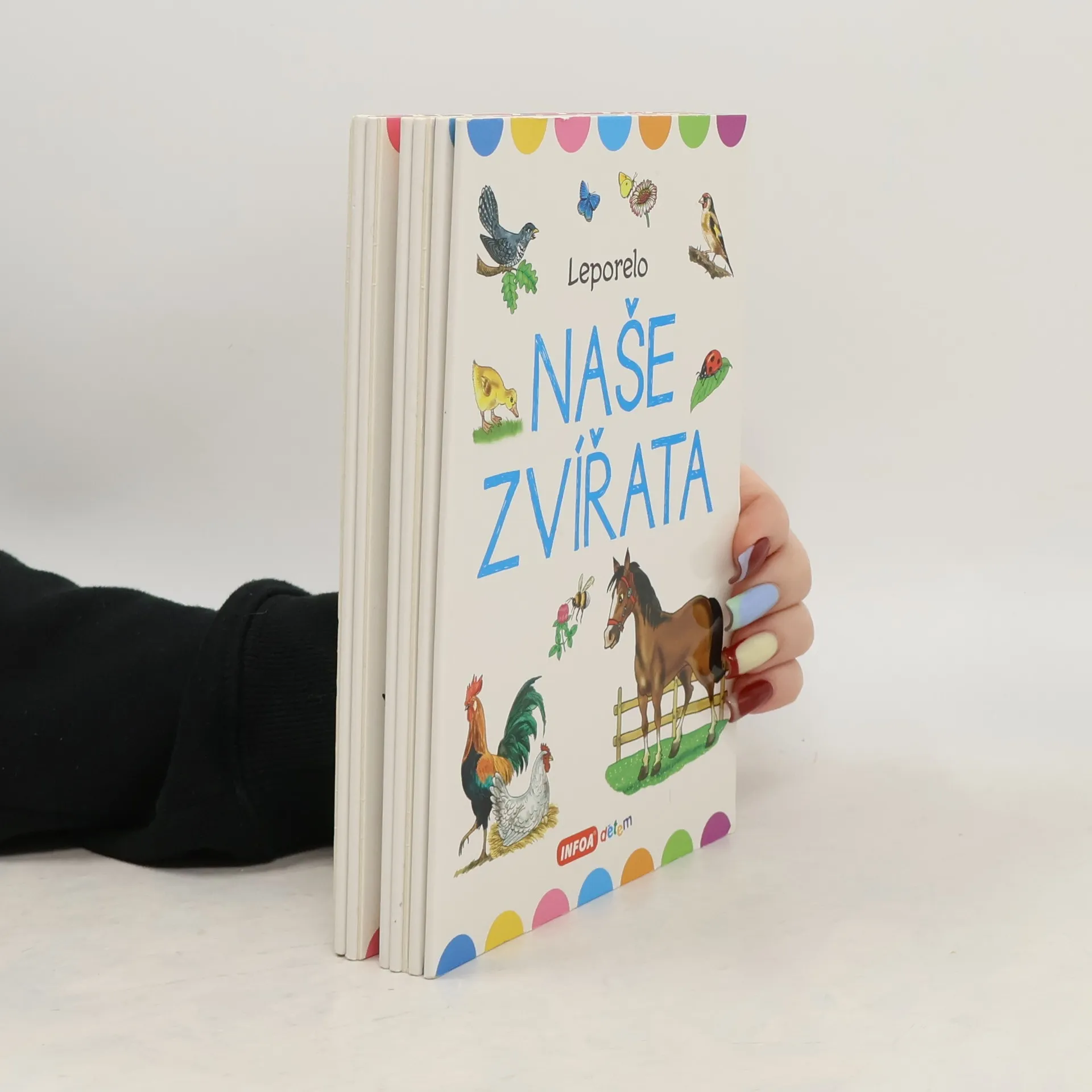 Velké, bohatě ilustrované leporelo plné barevných obrázků seznámí děti s mnoha druhy zvířat z farmy a přírody. Při popisu ilustrací si dítě rozvíjí základní slovní zásobu a zábavnou formou se učí, jak se jmenují zvířátka na obrázcích.