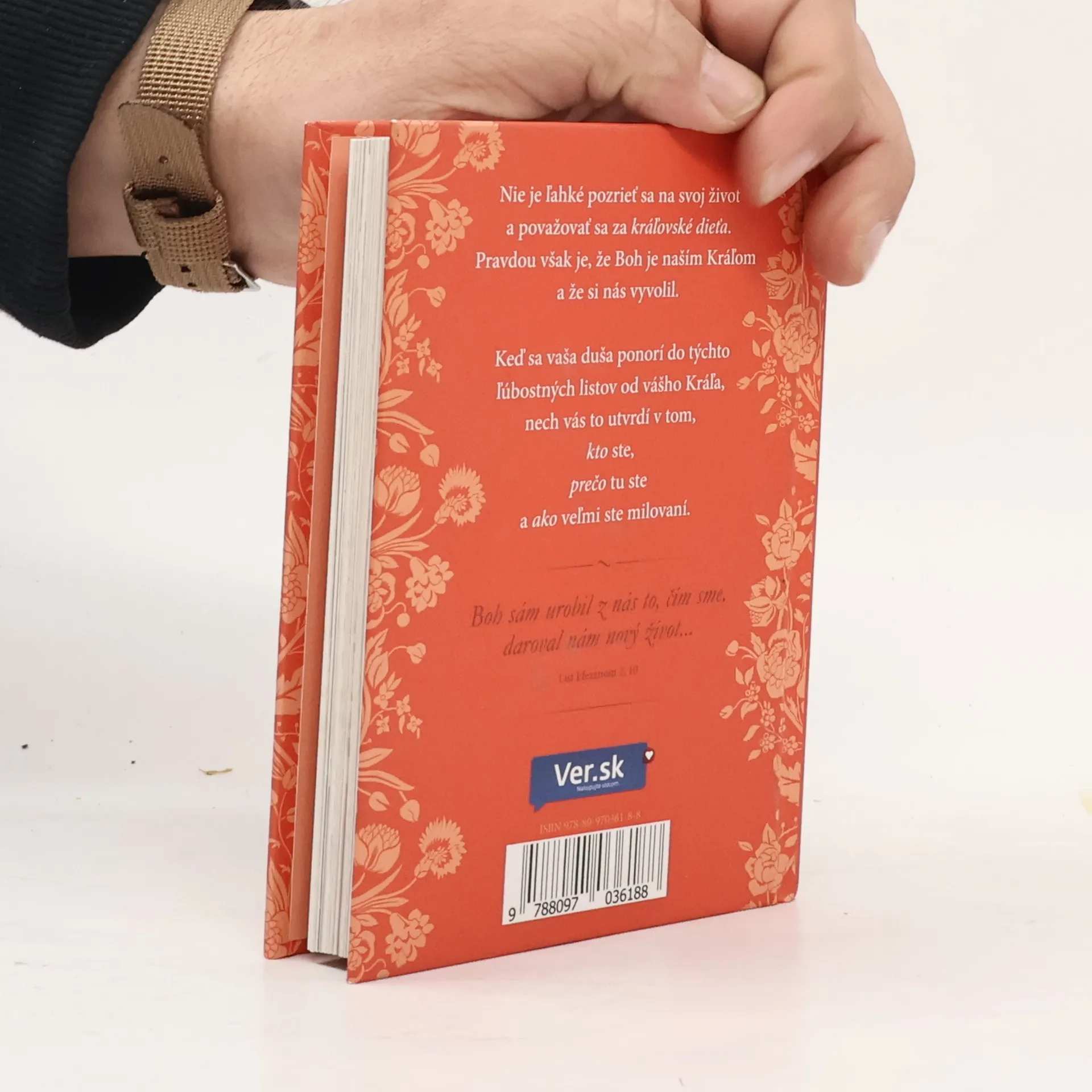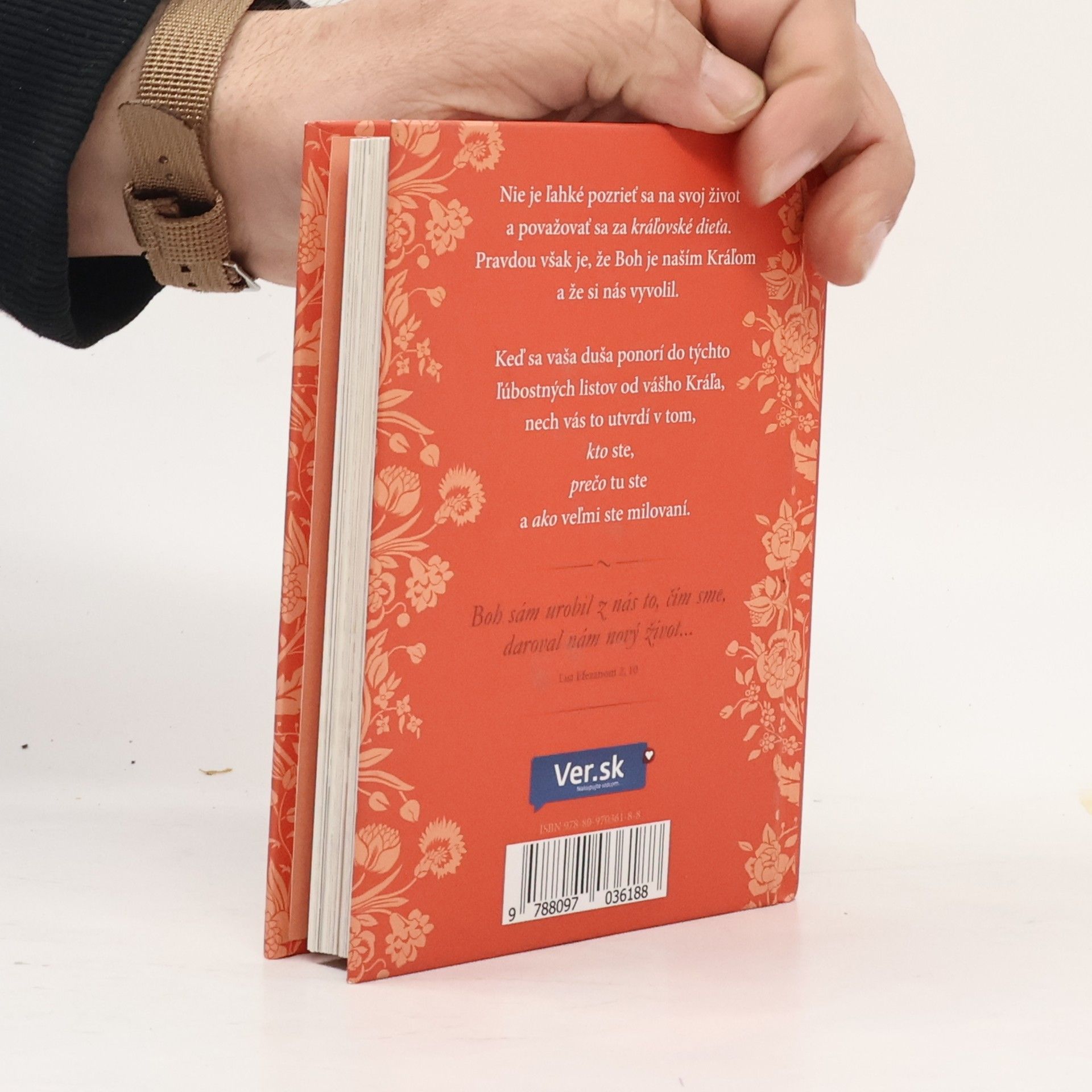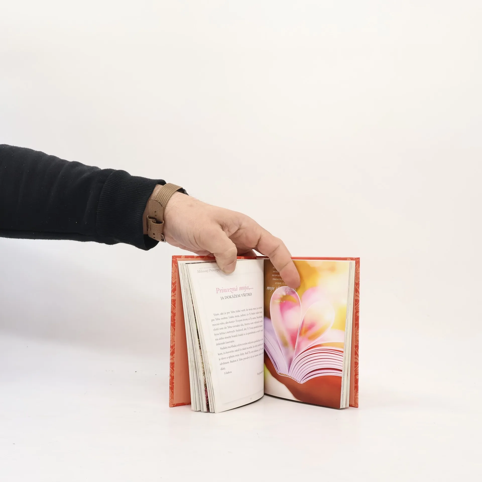 Kniha je plnofarebná, na jednej strane je list a na druhej strane nádherná fotka. Milovanej princeznej Princezná moja... ja som ti prišiel slúžiť. Aj keď necítiš, že by si Ťa druhí cenili, chcem Ti pripomenúť, Princezná moja, že ja, Tvoj Kráľ, som Ti prišiel slúžiť. Nielenže som Ťa stvoril, ja tiež udržiavam Tvoj život, utešujem Tvojho ducha a poskytujem Ti, čo potrebuješ. Si taká cenná, že som za Teba zaplatil na kríži tú najvyššiu cenu, aby som Ťa vykúpil, dieťa moje. Ja dokážem vziať každé zlyhanie alebo chybu, ktoré si urobila, a zázračne si ich použiť na moju slávu. Som trpezlivý, milosrdný a láskavý – ja som Láska. Teraz, keď vieš, že som Ti odpustil hriechy, žiadam Ťa, aby si sa odvrátila od toho, kým si bola a stala sa takou, akou som Ťa povolal byť. Dovoľ mi pomôcť Ti. Ja som Tvoj Pán, ktorý Ťa miluje za každých okolností. S láskou Tvoj Kráľ, ktorý prišiel kvôli Tebe...