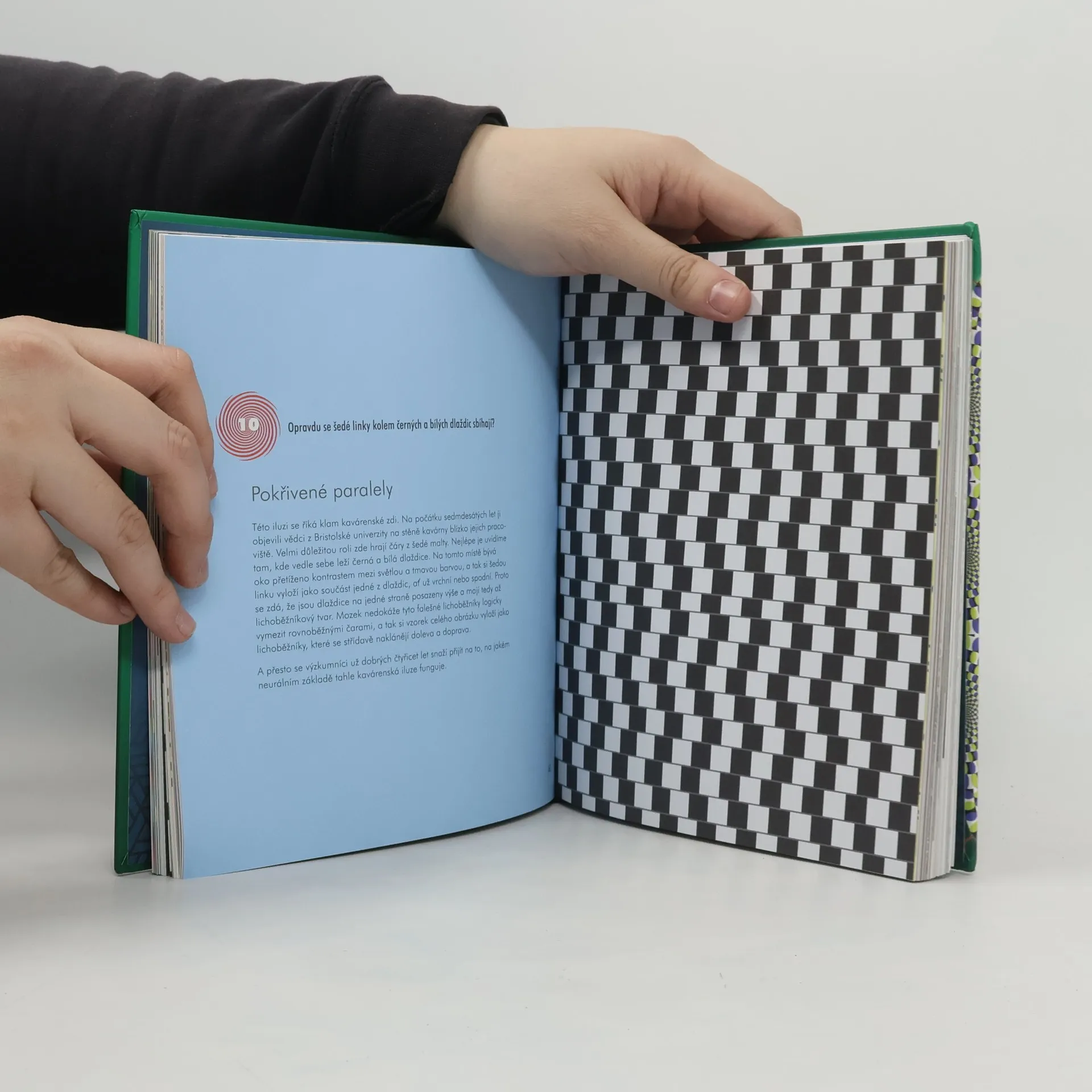 Optická iluze má dva prvky. Jeden je vnímání toho, co vidíte. Může se jednat o spojování čar, pohyblivé tvary nebo zdánlivě nestejné velikosti. Druhým prvkem je vědecké vysvětlení nebo neuronální základ iluze. A zde vám pomůže Kniha optických klamů, která se zabývá druhým prvkem: vědeckým vysvětlením klamu. Stručný úvod popisuje historii optických iluzí a jejich původ. Některé pocházejí až ze starověku (jako na Maltě nalezená 3D římská mozaika z 2. století při n. l.) a jiné jsou moderní (jako emotikony a pouliční umění). Kniha obsahuje práce skvělých iluzionistů, jako např. M.C. Escher, a známé klamy, jako je Nemožný trojúhelník nebo portrét Albert Einstein / Marilyn Monroe. Další klamy: Vidění věci, které tam nejsou, jenž byl objeven na stěně studia BBC v padesátých letech minulého století. Tato iluze obsahuje stíny, které vypadají, že se sbíhají ve sloupcích nahoru a dolů. A samozřejmě spousta dalších.