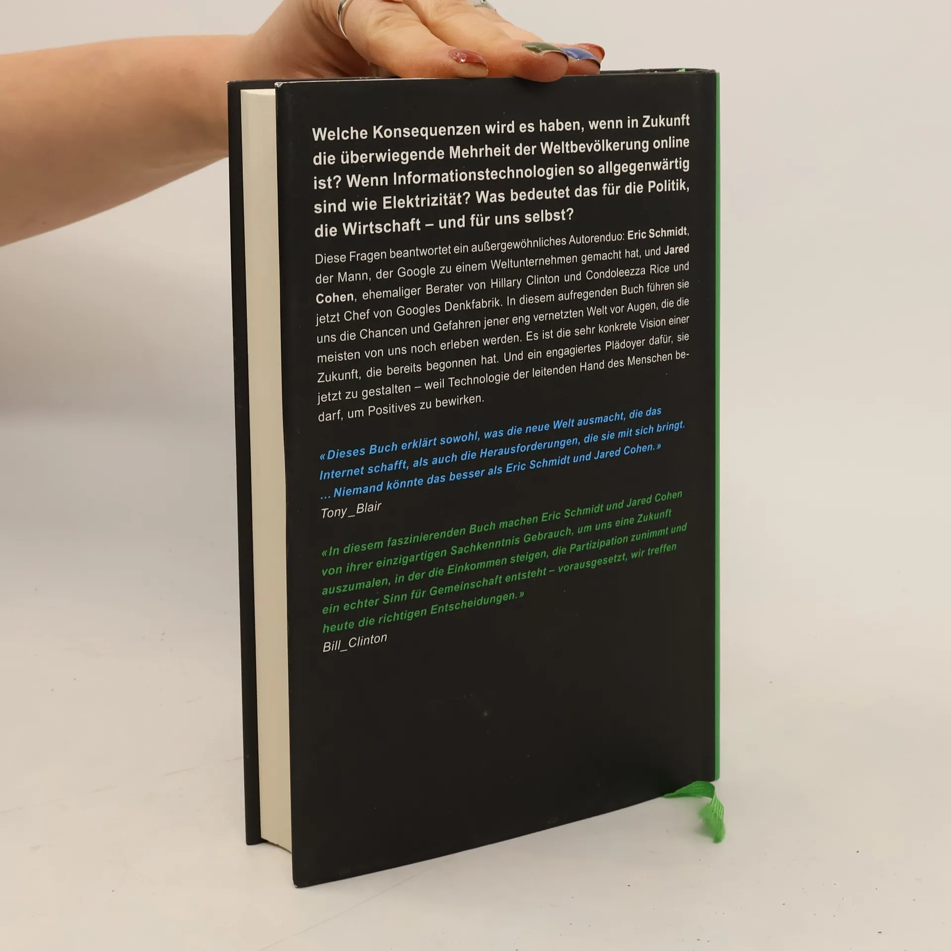 Welche Konsequenzen wird es haben, wenn in Zukunft die überwiegende Mehrheit der Weltbevölkerung online ist? Wenn Informationstechnologien so allgegenwärtig sind wie Elektrizität? Was bedeutet das für die Politik, die Wirtschaft – und für uns selbst? Diese Fragen beantwortet ein außergewöhnliches Autorenduo: Eric Schmidt, der Mann, der Google zu einem Weltunternehmen gemacht hat, und Jared Cohen, ehemaliger Berater von Hillary Clinton und Condoleeza Rice und jetzt Chef von Googles Denkfabrik. In diesem aufregenden Buch führen sie uns die Chancen und Gefahren jener eng vernetzten Welt vor Augen, die die meisten von uns noch erleben werden. Es ist die sehr konkrete Vision einer Zukunft, die bereits begonnen hat. Und ein engagiertes Plädoyer dafür, sie jetzt zu gestalten – weil Technologie der leitenden Hand des Menschen bedarf, um Positives zu bewirken.