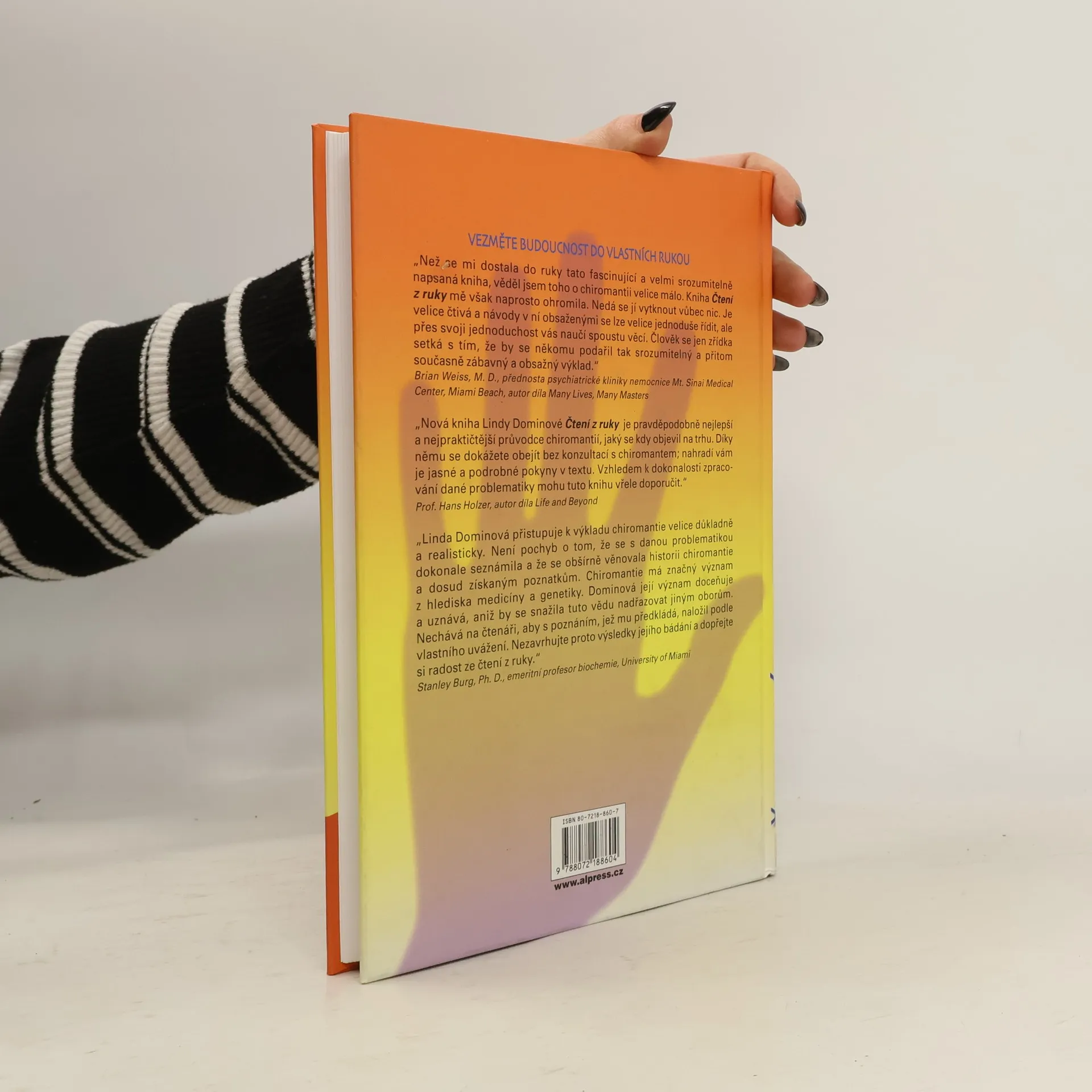 V této knize se čtenář dozví o principech, jimiž jsou do lidské dlaně zakódovány informace o našem těle, mysli i povaze, tedy i o naší nejniternější bytosti, již si žárlivě střežímě před okolím. Své charakterové rysy, schopnosti a vrozene nadání máme vštípeny do mysli, z níž jsou tyto znaky jako obrazy přenášeny do dlaně. V ní tak nosíme svoji minulost,přítomnost i budoucnost.