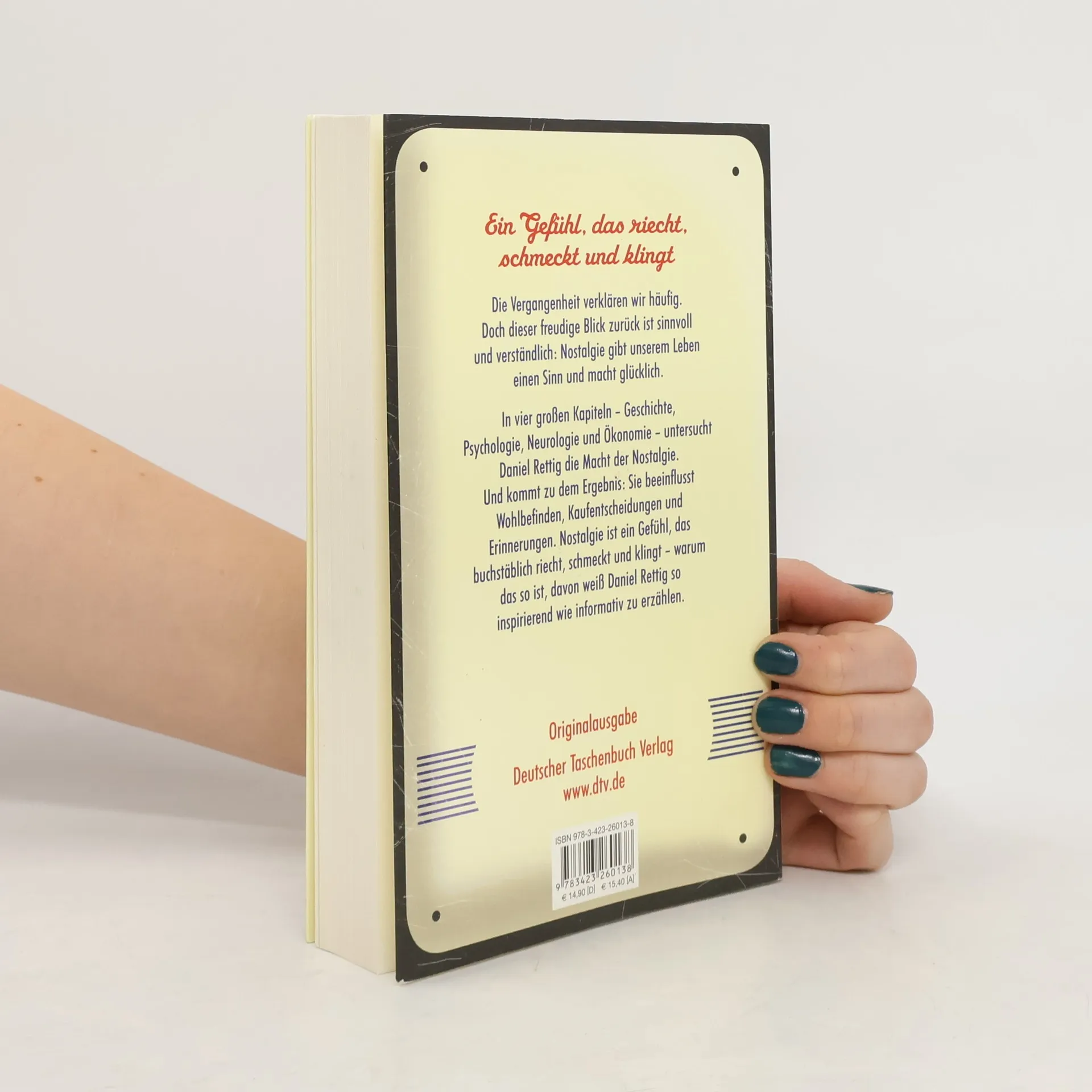Ein Gefühl, das riecht, schmeckt und klingt In der Erinnerung wird die Vergangenheit oft verklärt – und dieser freudige Blick zurück ist durchaus berechtigt: Nostalgie gibt dem eigenen Leben einen Sinn, verleiht ein Gefühl von Sicherheit und macht glücklich. In vier großen Kapiteln – Geschichte, Psychologie, Neurologie und Ökonomie – untersucht Daniel Rettig die Macht der Nostalgie. Und kommt zu dem Ergebnis: Sie beeinflusst Selbstwert- und Gemeinschaftsgefühl, Kaufentscheidungen und Erinnerungen; Gerüche und Töne verbinden wir mit Personen, Orten und Erlebnissen. Nostalgie ist ein Gefühl, das buchstäblich riecht, schmeckt und klingt – und das uns von der Kindheit bis zum Alter in seinen Bann zieht. Warum das so ist und Nostalgie uns so sehr prägt, davon weiß Daniel Rettig so spannend wie informativ zu erzählen.