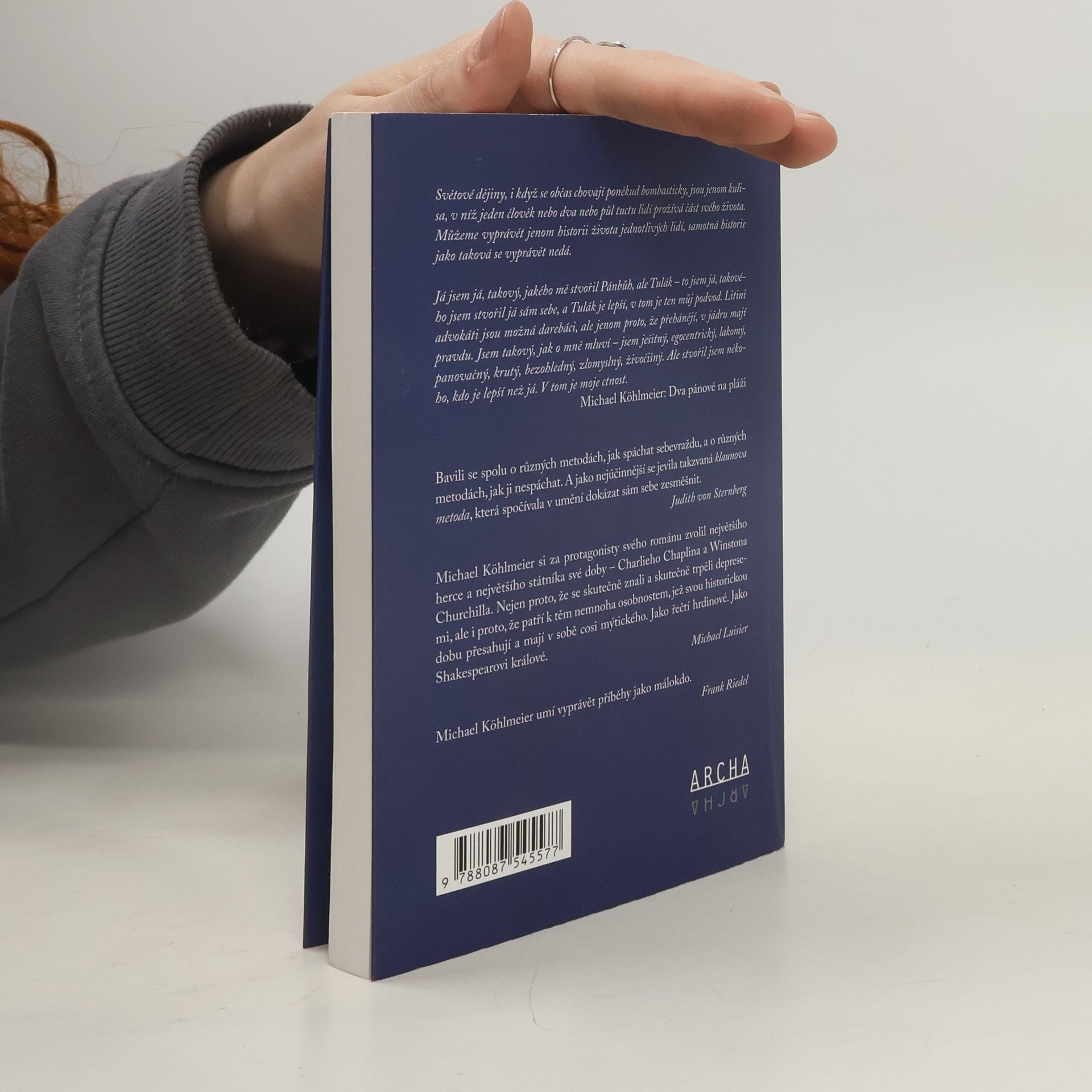 Dva pánové se spolu vydají na procházku po pláži. Nevědí, kdo je ten druhý. Ale zjistí, že je sbližuje zásadní zkušenost – deprese. A ti dva spolu uzavřou neporušitelný pakt: „Bude-li jeden z nás kdykoli potřebovat pomoc, tak ten druhý, ať bude v té chvíli kdekoli na světě, nechá všechno ležet a běžet a přijde.“ Tak se poznali Charles Chaplin s Winstonem Churchillem, alespoň v románu Michaela Köhlmeiera. A tím okamžikem se začíná odvíjet zvláštní druh silného pouta mezi jedním z největších komiků a jedním z největších státníků. Tito dva jedinci, jejichž životy a povahy si nemohly být vzdálenější, se setkali jen několikrát v životě. A mezi jejich setkáními se život jednoho odvíjel ve filmovém světě v Hollywoodu, život druhého v politickém prostředí meziválečné Británie. Do jejich osudů se promítá historie první poloviny 20. století i doba, kdy oba, každý svými prostředky, bránili svůj svět proti Hitlerovi. Jeden vytvořil film Diktátor, druhý vyhlásil diktátorovi válku. Není důležité, které z citovaných pramenů jsou doložitelné a které si autor přimyslel, v každém případě podal věrný, hluboce lidský a nepřikrášlený obraz dvou velkých osobností, jejichž životy se kuriózním způsobem propojily.