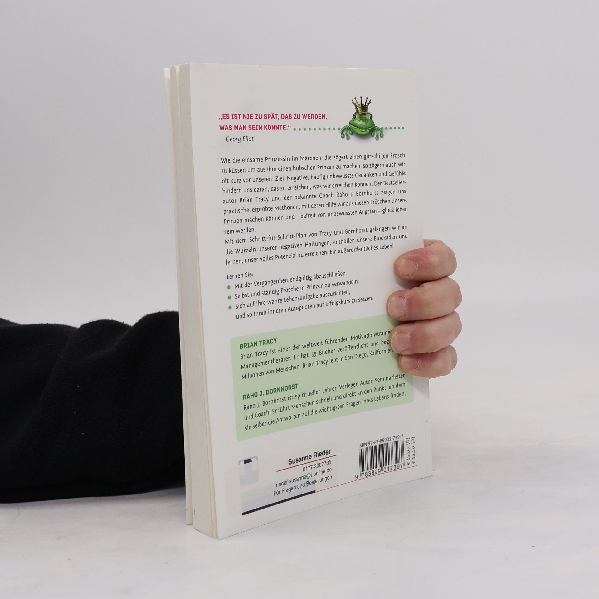 Wie die einsame Prinzessin im Märchen, die zögert einen glitschigen Frosch zu küssen um aus ihm einen hübschen Prinzen zu machen, so zögern auch wir oft kurz vor unserm Ziel. Negative, oft auch unbewusste Gedanken und Gefühle hindern uns daran, das zu erreichen, was wir erreichen können. Der Bestsellerautor Brian Tracy und der bekannte Coach Raho Joe Bornhorst zeigen uns praktische, erprobte Methoden für jeden von uns, um aus diesen Fröschen unsere Prinzen zu machen, um befreit von unbewussten Ängsten glücklicher zu sein. Mit dem Schritt-für-Schritt-Plan von Tracy und Bornhorst, gelangen wir an die Wurzeln unserer negativen Haltungen, enthüllen unsere Blockaden und lernen unser volles Potenzial zu erreichen: Ein außerordentliches Leben! Lernen Sie: Mit der Vergangenheit endgültig abzuschließen, Selbst und ständig Frösche in Prinzen zu verwandeln, Sich auf Ihre wahre Lebensaufgabe auszurichten.