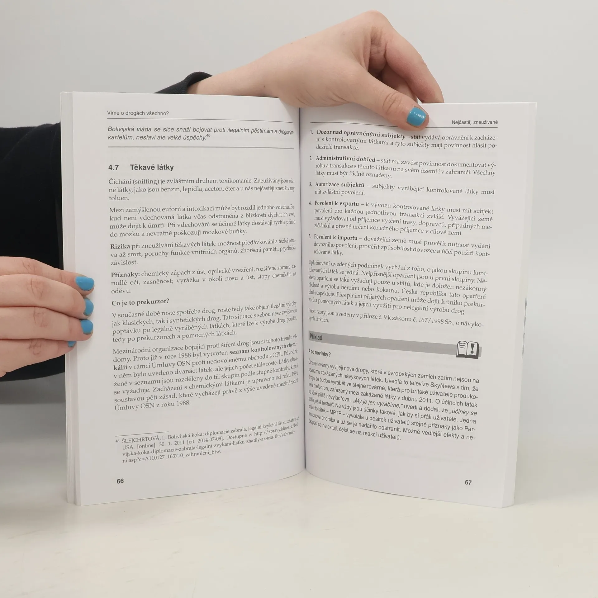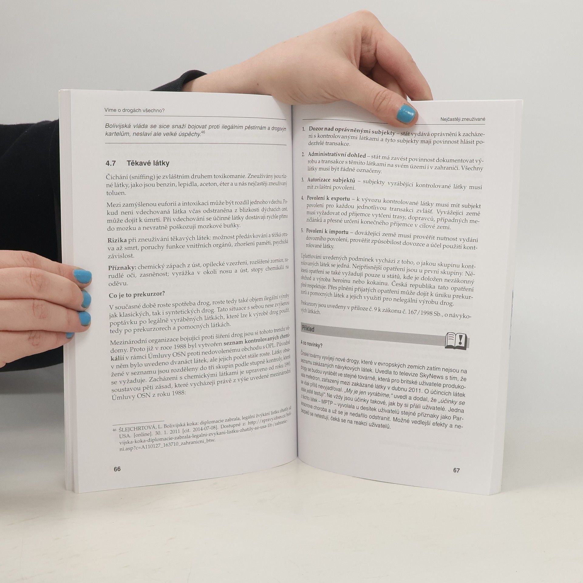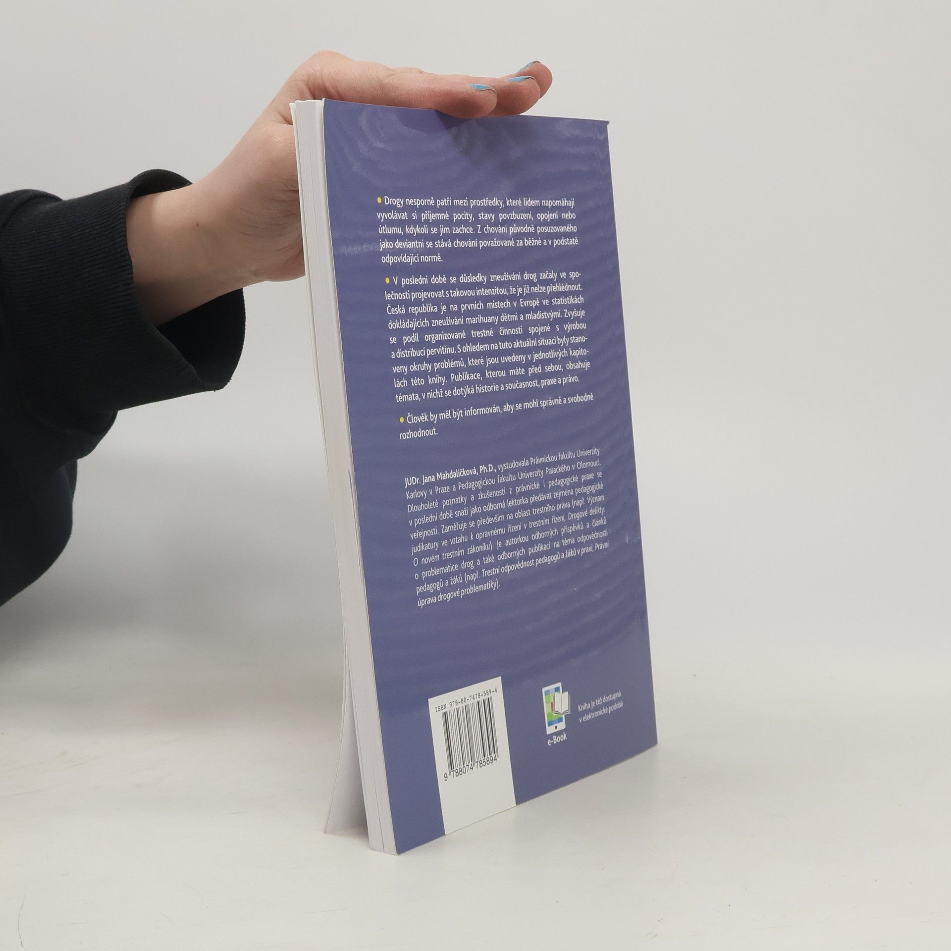 O drogách slyšíme tak často, že nám nutně musí připadat, že o nich už všechno víme. Ale je to opravdu tak? Smyslem knížky byla snaha poskládat útržky informací do přehledné skládačky. Proč patří mladiství uživatelé drog mezi rizikové skupiny? Jak vzniká závislost? Jak se projevuje intoxikace? Jaké jsou klíčové charakteristiky úspěšné školní prevence? Jak může pomoci rodina? Co může naznačovat, že dítě bere drogy? Jak poskytnout první pomoc při předávkování? Lze drogy testovat ve škole? Jaká jsou kritéria trestnosti? Odpovědi na všechny výše zmíněné otázky a mnoho dalších informací se dozvíte v předkládané publikaci. Publikaci lze zakoupit samostatně nebo společně s knihou TESTOVÁNÍ dětí a mladistvých ve školských zařízeních při podezření z užití návykové látky.