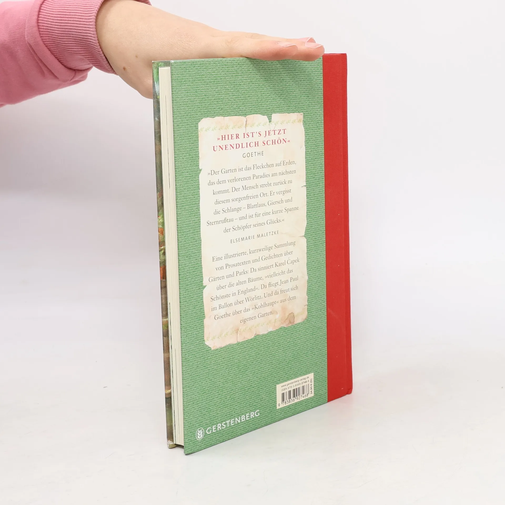 „Der Garten ist das Fleckchen auf Erden, das dem verlorenen Paradies am nächsten kommt. Der Mensch strebt zurück zu diesem sorgenfreien Ort. Er vergisst die Schlange - Blattlaus, Giersch und Sternrußtau - und ist für eine kurze Spanne der Schöpfer seines Glücks“, schreibt Elsemarie Maletzke. Die namhafte Autorin hat diesen neuen „Lesespaziergang“ zusammengestellt, eine kurzweilige Sammlung von Prosatexten und Gedichten über Gärten und Parks. Da sinniert Karel C¡apek über die alten Bäume, „vielleicht das Schönste in England“. Da fliegt Jean Paul im Ballon über Wörlitz, da freut sich Goethe über das „Kohlhaupt“ aus dem eigenen Garten. Und da gewinnt Sarkozy Carla Brunis Herz mit seinen Kenntnissen über Blumen. Folgende deutsche Gärten und Parks werden im Buch erwähnt: Branitz, Englischer Garten in München, Garten der Liebermann-Villa in Berlin-Wannsee, Muskau, Sanssouci, Wörlitz