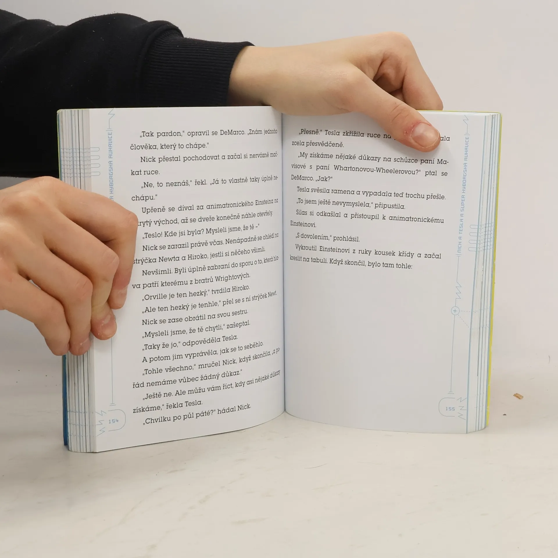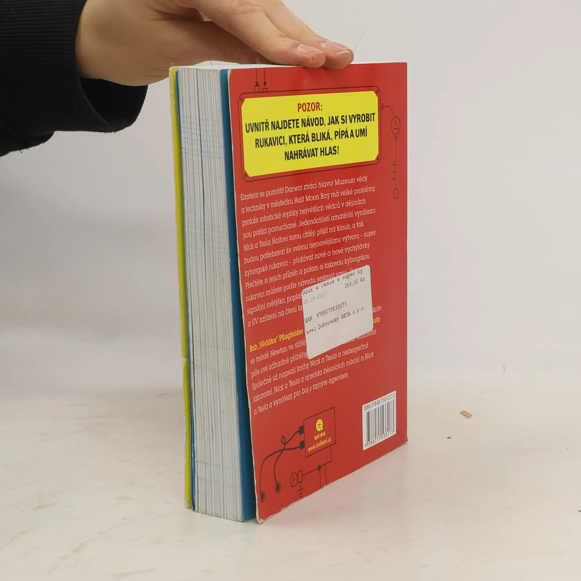 Uvnitř najdete návod, jak si vyrobit rukavici, která bliká, pípá a umí nahrávat hlas! Einstein se pomátl! Darwin ztrácí hlavu! Muzeum vědy a techniky v městečku Half Moon Bay má velké problémy, protože robotické repliky největších vědců v dějinách jsou pořád porouchané. Jedenáctiletí amatérští vynálezci Nick a Tesla Holtovi tomu chtějí přijít na kloub, a tak budou potřebovat ke svému nejnovějšímu výtvoru – super kyborgské rukavici – přidávat nové a nové vychytávky. Přečtěte si jejich příběh a potom si takovou kyborgskou rukavici můžete podle návodu sestavit sami. Je na ní signální světýlko, poplašný alarm, nahrávací zařízení a UV zařízení na čtení tajných vzkazů! Bob „Vědátor“ Pflugfelder učí přírodní vědy na základní škole ve městě Newton ve státě Massachusetts. Steve Hockensmith píše své záhadné příběhy v kalifornském městě Alameda.