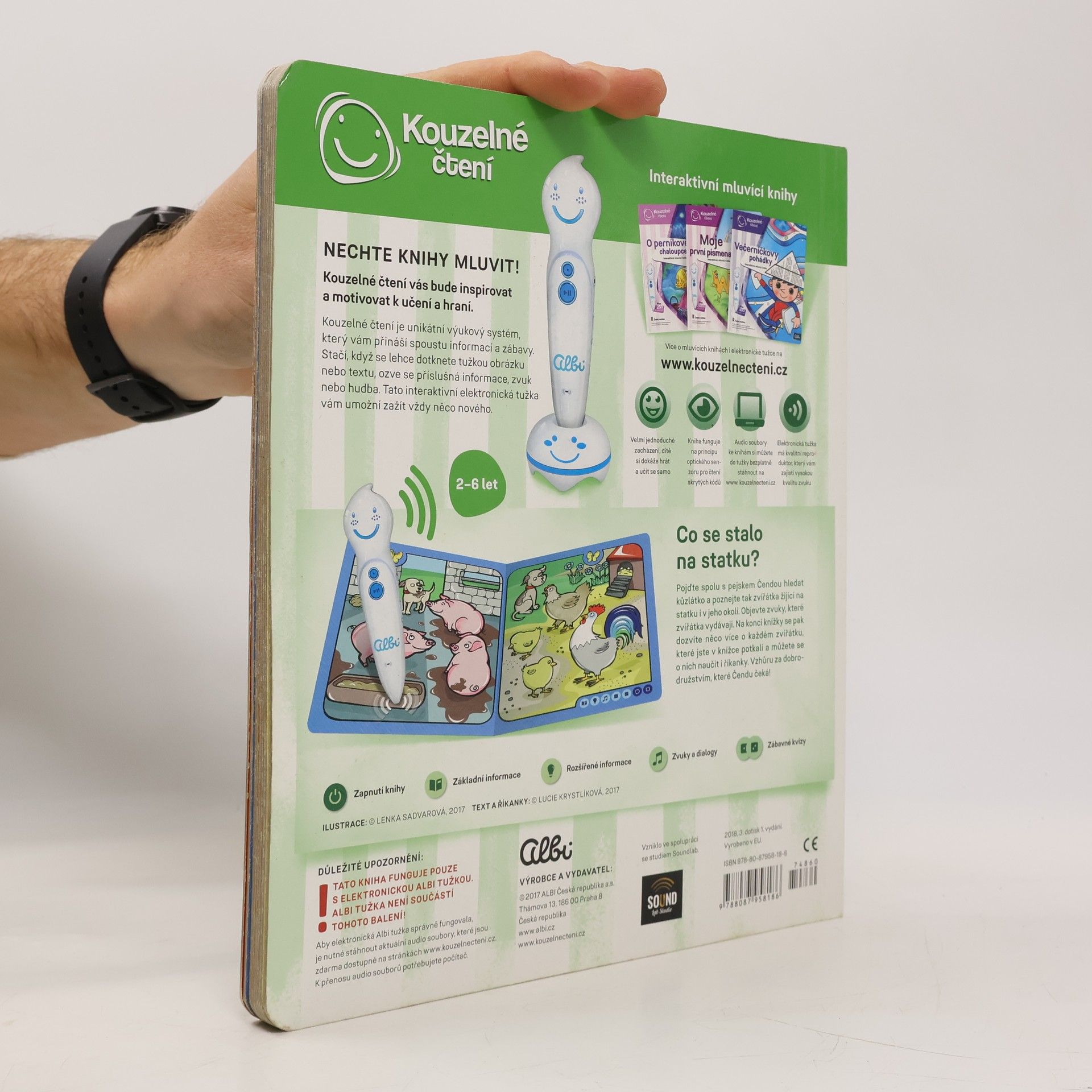 Interaktivní kniha Zvířátka na statku pozve nejmenší děti na dobrodružnou výpravu pejska Čendy za ztraceným kůzlátkem. Kniha z edice Kouzelné čtení je plná zábavných říkanek a informací o tom, co zažil malý pejsek na statku a kousek za ním. V naučné knize Zvířátka na statku objeví zvuky, které zvířátka vydávají. Na konci knížky se pak dozví více informací o každém zvířátku, které v knížce potkali a můžou se o nich naučit i říkanky. Vzhůru za dobrodružstvím, které Čendu čeká! Namluvil Jaroslav Plesl. Ilustrace Lenka Sadvarová. Text a říkanky Lucie Krystlíková. Kniha obsahuje přes 1000 zvuků a textů.