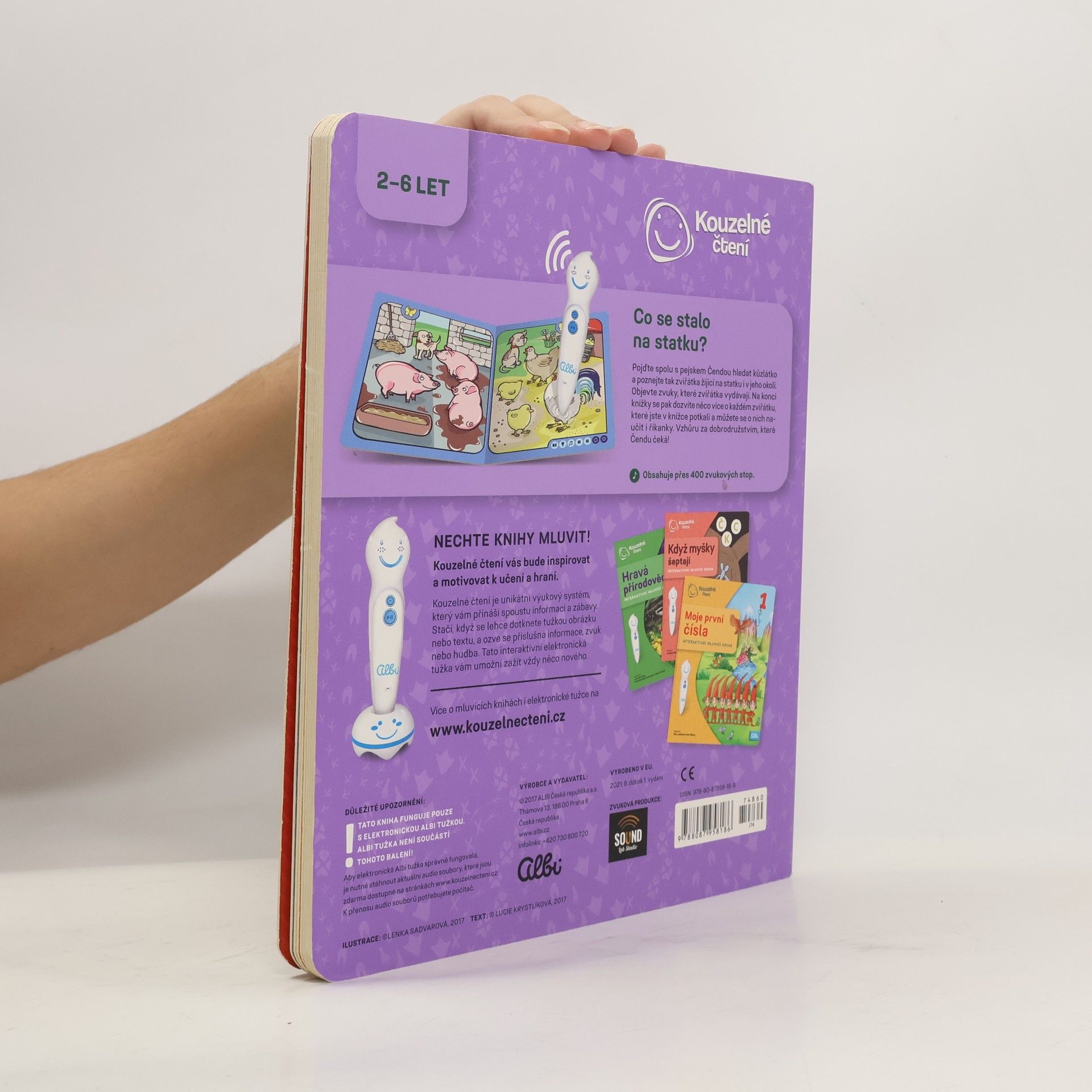 Interaktivní kniha Zvířátka na statku pozve nejmenší děti na dobrodružnou výpravu pejska Čendy za ztraceným kůzlátkem. Kniha z edice Kouzelné čtení je plná zábavných říkanek a informací o tom, co zažil malý pejsek na statku a kousek za ním. V naučné knize Zvířátka na statku objeví zvuky, které zvířátka vydávají. Na konci knížky se pak dozví více informací o každém zvířátku, které v knížce potkali a můžou se o nich naučit i říkanky. Vzhůru za dobrodružstvím, které Čendu čeká! Namluvil Jaroslav Plesl. Ilustrace Lenka Sadvarová. Text a říkanky Lucie Krystlíková. Kniha obsahuje přes 1000 zvuků a textů.