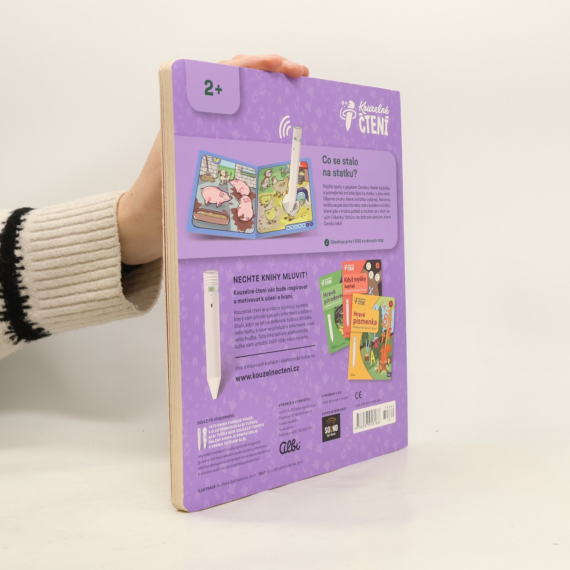 Interaktivní kniha Zvířátka na statku pozve nejmenší děti na dobrodružnou výpravu pejska Čendy za ztraceným kůzlátkem. Kniha z edice Kouzelné čtení je plná zábavných říkanek a informací o tom, co zažil malý pejsek na statku a kousek za ním. V naučné knize Zvířátka na statku objeví zvuky, které zvířátka vydávají. Na konci knížky se pak dozví více informací o každém zvířátku, které v knížce potkali a můžou se o nich naučit i říkanky. Vzhůru za dobrodružstvím, které Čendu čeká! Namluvil Jaroslav Plesl. Ilustrace Lenka Sadvarová. Text a říkanky Lucie Krystlíková. Kniha obsahuje přes 1000 zvuků a textů.