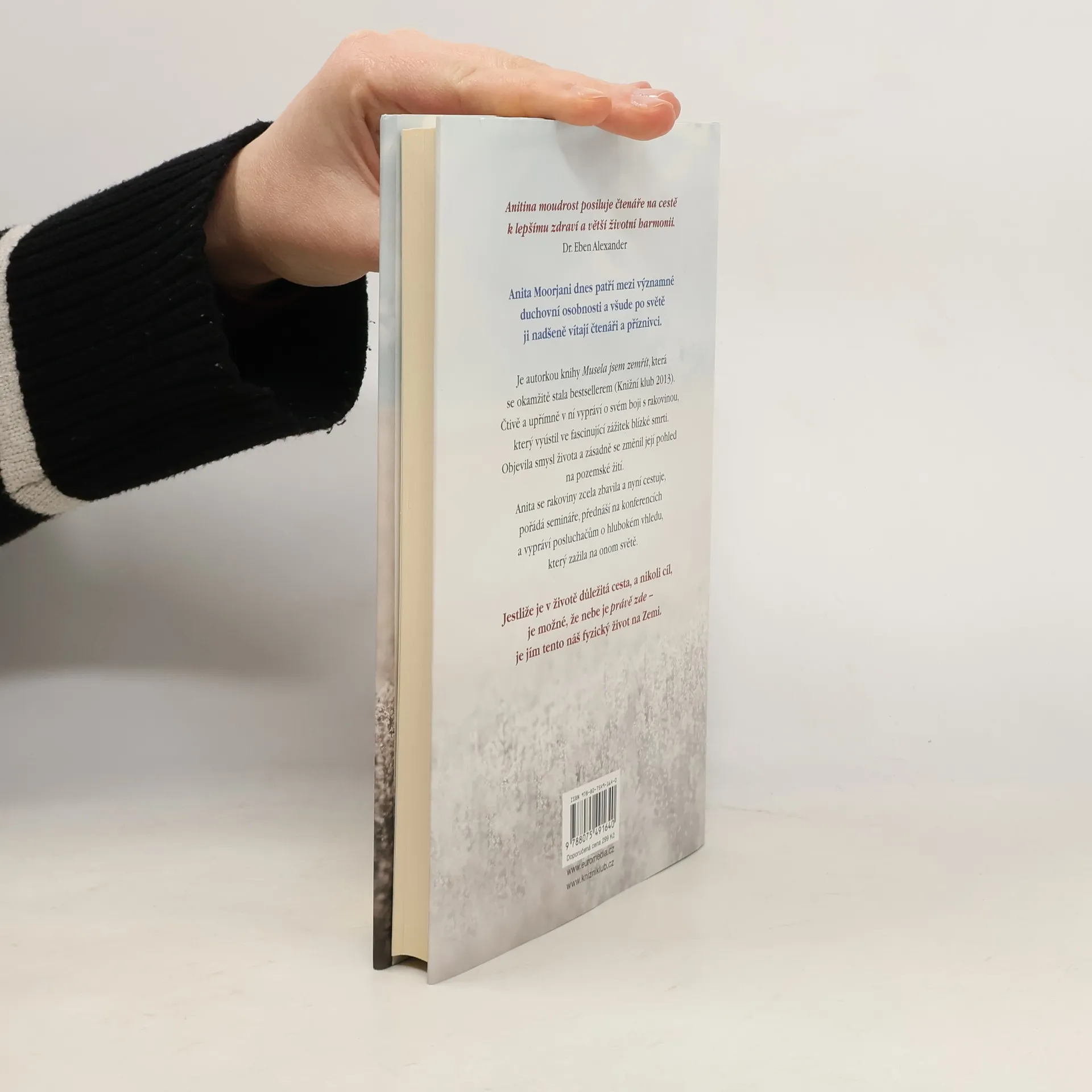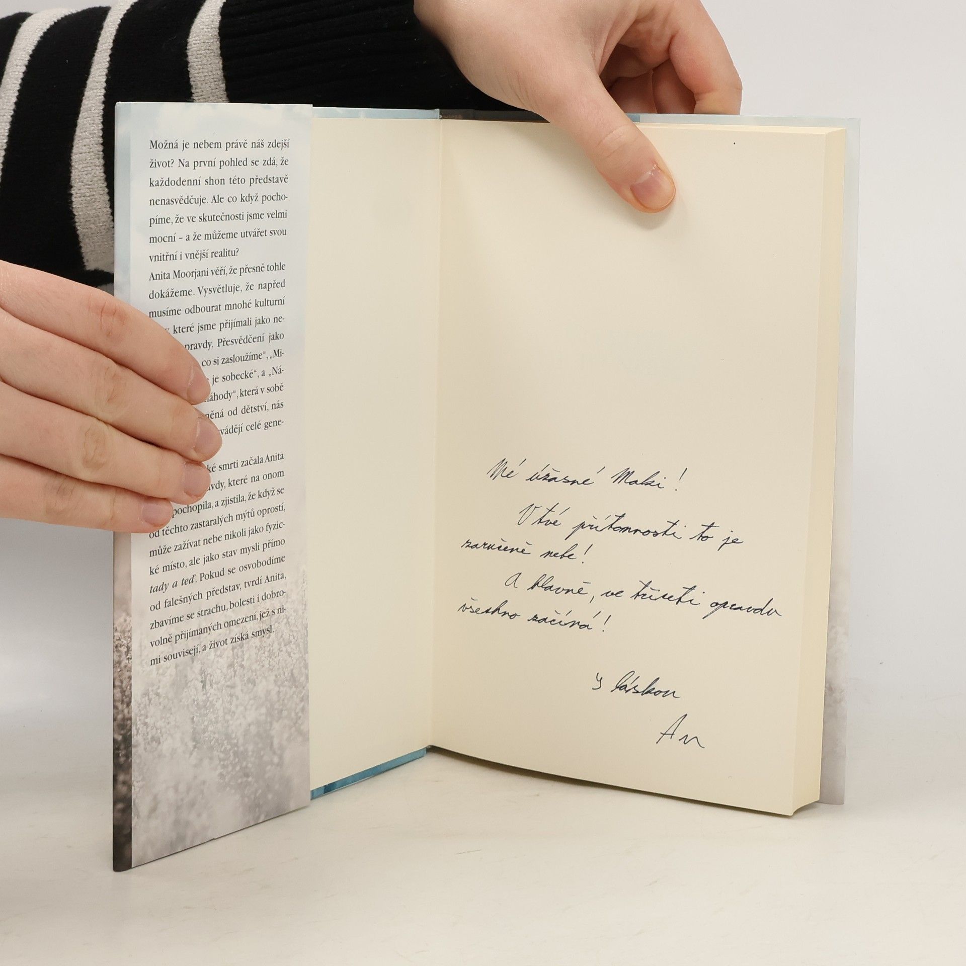 Anita Moorjani je autorkou knihy Musela jsem zemřít, která se stala bestsellerem (Knižní klub 2013). Popisuje v ní svůj boj s rakovinou, ústící ve fascinující zážitek blízké smrti. Ten dalekosáhle změnil její pohled na život. Anita se rakoviny zcela zbavila a nyní cestuje po světě, pořádá přednášky a semináře, přednáší na konferencích a vypráví posluchačům o hlubokém vhledu, který zažila na onom světě. Je-li v životě důležitá cesta, a nikoli cíl, je možné, že nebe je zde - je jím tento fyzický život, který žijeme na Zemi.