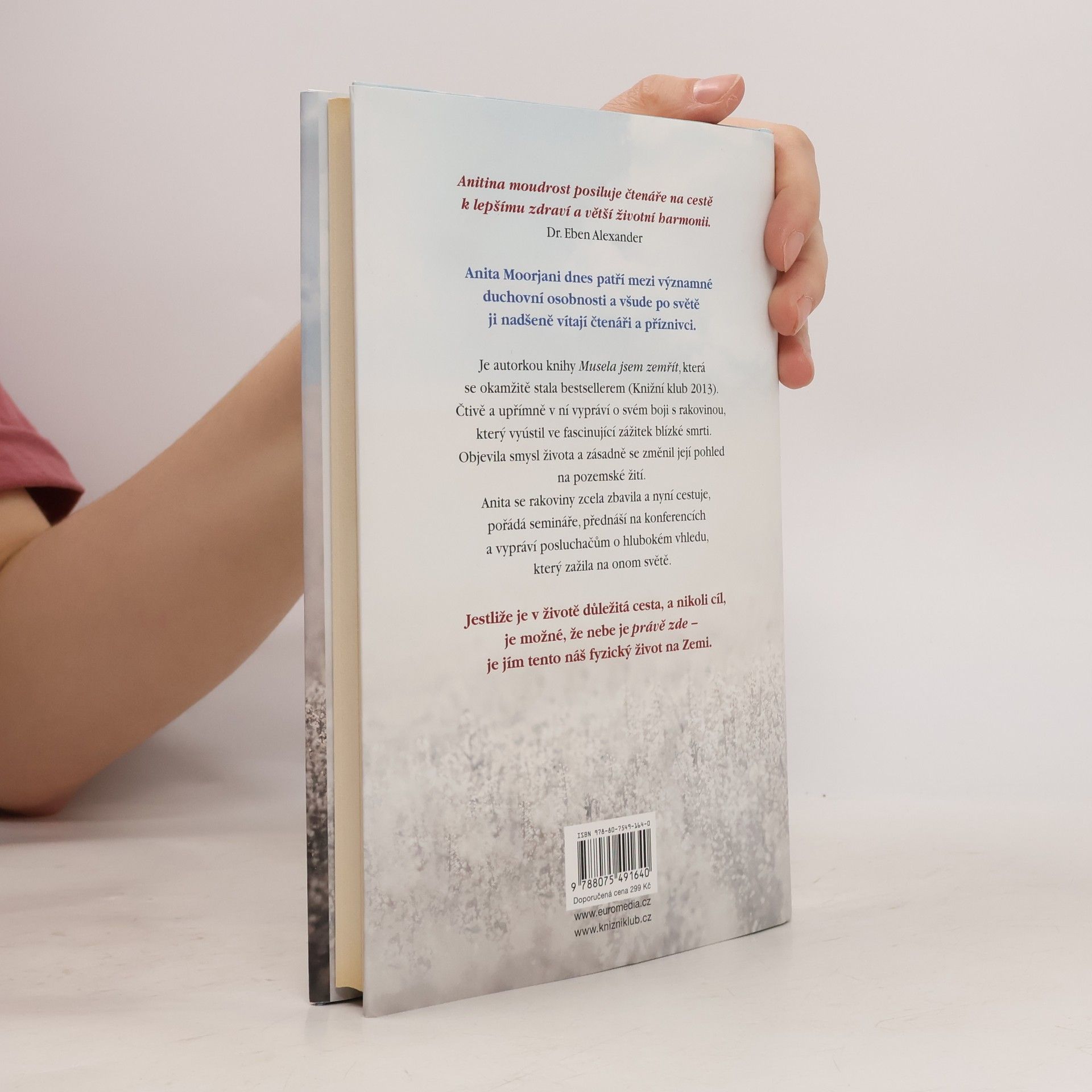Anita Moorjani je autorkou knihy Musela jsem zemřít, která se stala bestsellerem (Knižní klub 2013). Popisuje v ní svůj boj s rakovinou, ústící ve fascinující zážitek blízké smrti. Ten dalekosáhle změnil její pohled na život. Anita se rakoviny zcela zbavila a nyní cestuje po světě, pořádá přednášky a semináře, přednáší na konferencích a vypráví posluchačům o hlubokém vhledu, který zažila na onom světě. Je-li v životě důležitá cesta, a nikoli cíl, je možné, že nebe je zde - je jím tento fyzický život, který žijeme na Zemi.