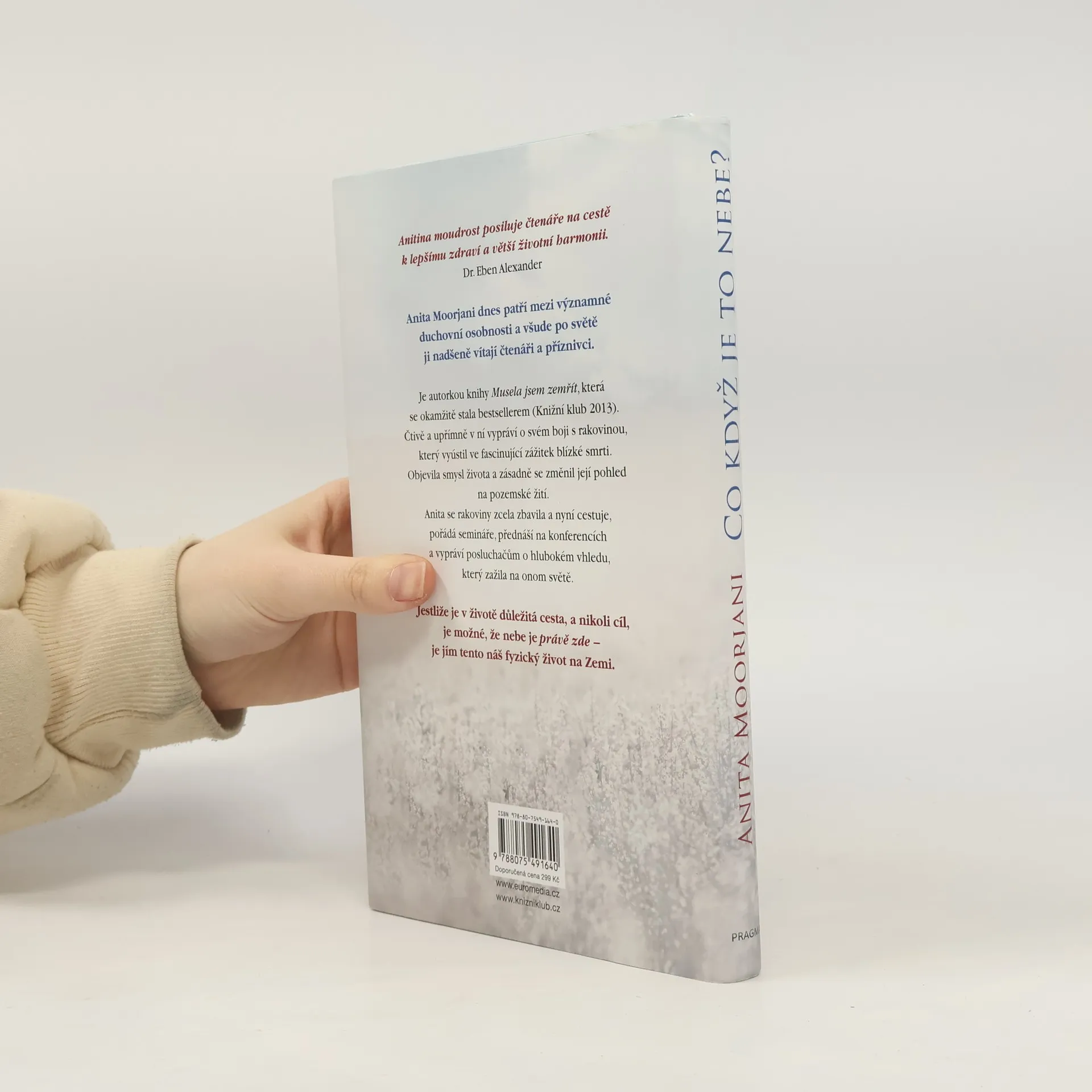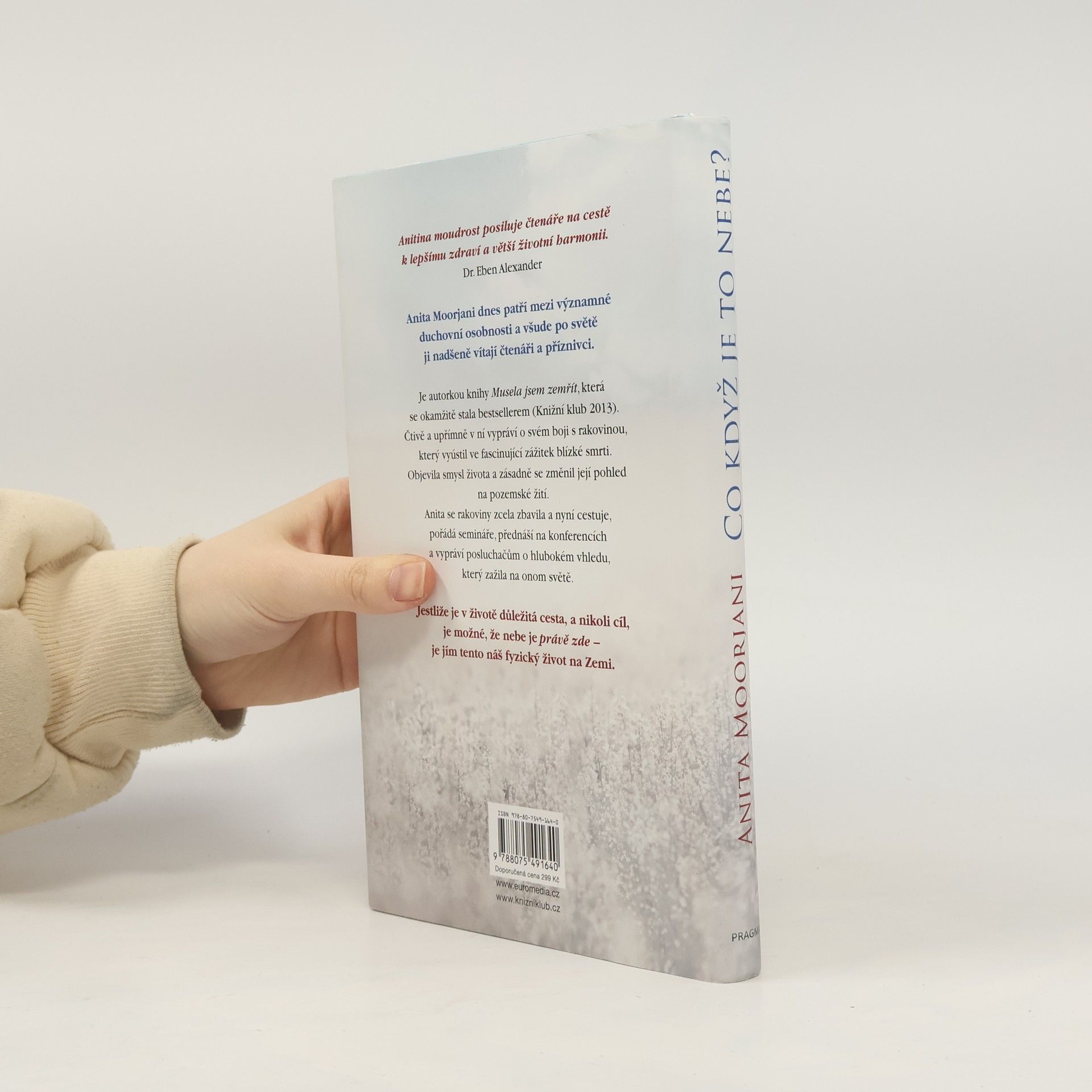 Anita Moorjani je autorkou knihy Musela jsem zemřít, která se stala bestsellerem (Knižní klub 2013). Popisuje v ní svůj boj s rakovinou, ústící ve fascinující zážitek blízké smrti. Ten dalekosáhle změnil její pohled na život. Anita se rakoviny zcela zbavila a nyní cestuje po světě, pořádá přednášky a semináře, přednáší na konferencích a vypráví posluchačům o hlubokém vhledu, který zažila na onom světě. Je-li v životě důležitá cesta, a nikoli cíl, je možné, že nebe je zde - je jím tento fyzický život, který žijeme na Zemi.