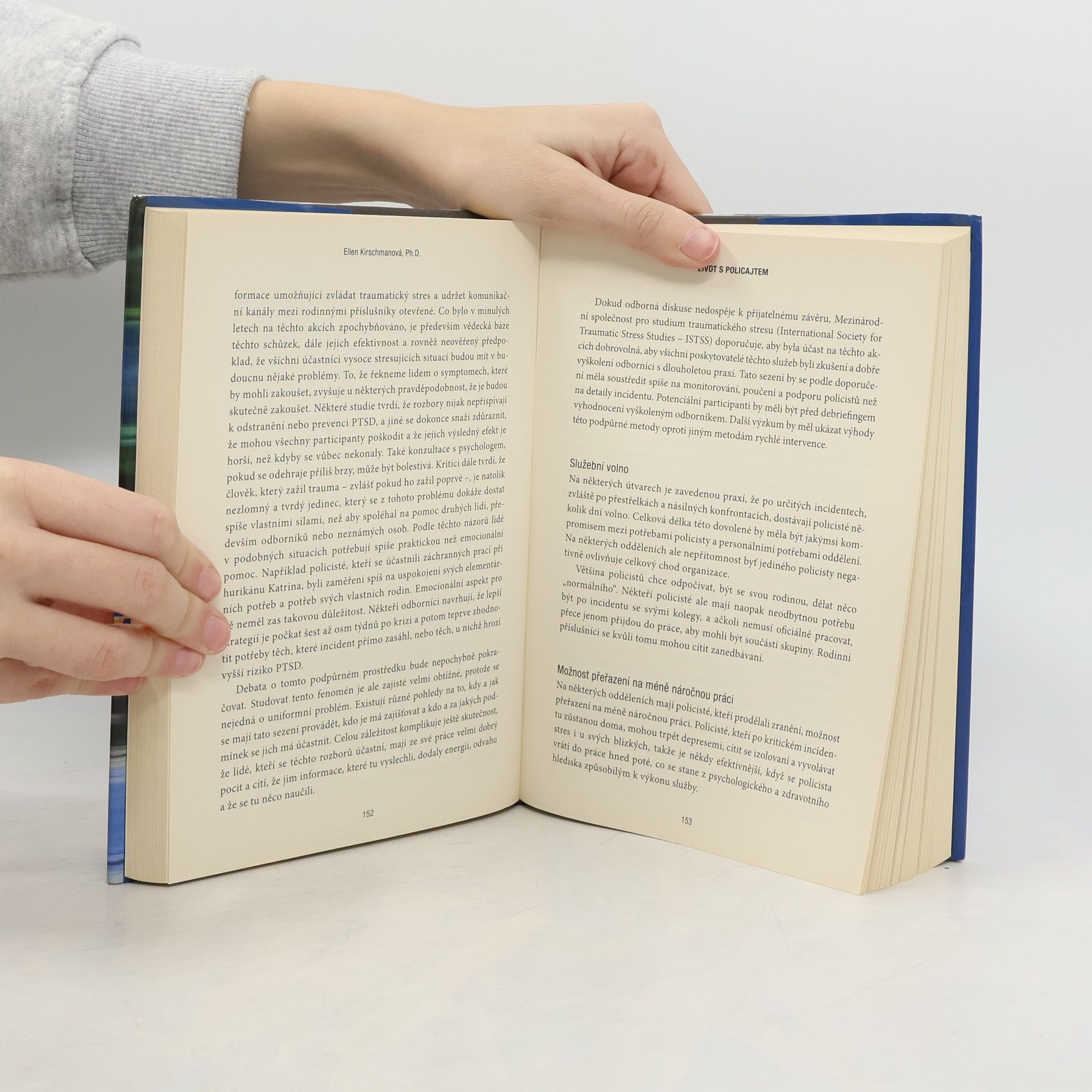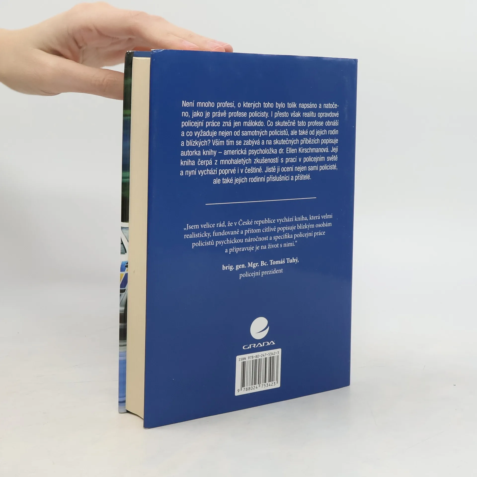 Jaký je opravdový život policajta a jeho rodiny? Co skutečně tato profese obnáší a co vyžaduje nejen od samotných policistů, ale také od jejich rodin a blízkých; jak lépe porozumět každodenním problémům a jak se vyrovnat s obtížnými situacemi, které tato profese přináší; jak se naučit pracovat s každodenním stresem, dlouhými přesčasy, nepředvídatelnými okolnostmi a krizovými situacemi? A především pak, jak rozpoznat varovné signály poukazující na emoční a fyzickou nerovnováhu, která může vyústit až v postraumatický stres, závislost na alkoholu či drogách, domácí násilí, či dokonce v sebevraždu? Vším tím se zabývá a na skutečných příbězích popisuje autorka knihy – americká psycholožka dr. Ellen Kirschmanová. Její kniha čerpá z mnohaletých zkušeností s prací v policejním světě a nyní vychází i poprvé v češtině. Jistě ji ocení nejen sami policisté, ale také jejich rodinní příslušníci a přátelé.