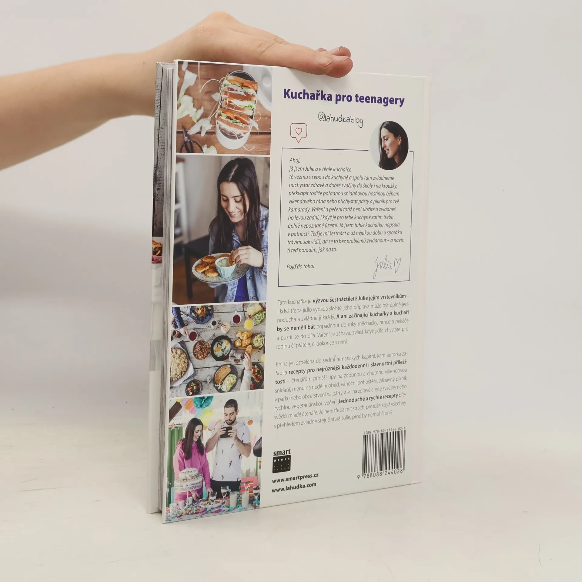 Tato kniha může být báječným dárkem ke Dni dětí, za vysvědčení či k Vánocům. Kuchařka pro teenagery je výzvou šestnáctileté Julie jejím vrstevníkům – i když třeba jídlo vypadá složitě, jeho příprava může být úplně jednoduchá a zvládne ji každý. A ani začínající kuchařky a kuchaři by se neměli bát popadnout do ruky měchačky, hrnce a pekáče a pustit se do díla. Vaření je zábava, zvlášť když jídlo chystáte pro rodinu či přátele, či dokonce s nimi. Kniha je rozdělena do sedmi tematických kapitol, kam autorka zařadila recepty pro nejrůznější každodenní i slavnostní příležitosti – čtenářům přináší tipy na zdobnou a chutnou víkendovou snídani, menu na nedělní oběd, vánoční pohoštění, zábavný piknik v parku nebo občerstvení na párty, ale i na zdravé a syté svačiny nebo rychlou vegetariánskou večeři. Jednoduché a rychlé recepty přesvědčí mladé čtenáře, že není třeba mít strach, protože když všechny s přehledem zvládne stejně stará Julie, proč by nemohli oni?