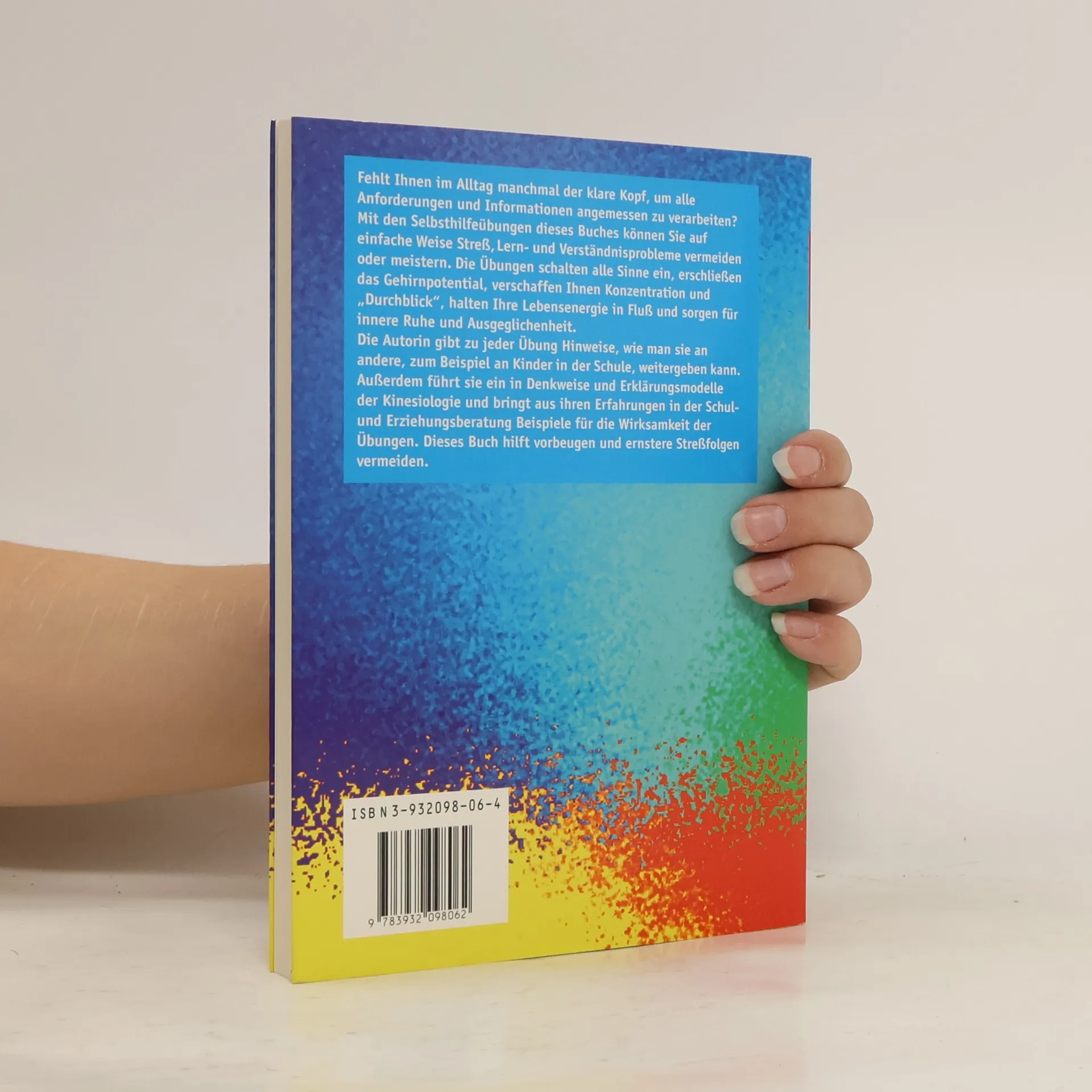 Fehlt Ihnen im Alltag manchmal der klare Kopf, um alle Anforderungen und Informationen angemessen zu verarbeiten? Mit den Selbsthilfeübungen dieses Buches können Sie auf einfache Weise Stress, Lern- und Verständnisprobleme vermeiden oder meistern. Die Übungen schalten alle Sinne ein, erschließen das Gehirnpotenzial, verschaffen Ihnen Konzentration und „Durchblick“, halten Ihre Lebensenergie in Fluss und sorgen für innere Ruhe und Ausgeglichenheit. Die Autorin gibt zu jeder Übung Hinweise, wie man sie an andere, zum Beispiel an Kinder in der Schule, weitergeben kann. Außerdem führt sie ein in Denkweise und Erklärungsmodelle der Kinesiologie und bringt aus ihren Erfahrungen in der Schul- und Erziehungsberatung Beispiele für die Wirksamkeit der Übungen. Dieses Buch hilft vorbeugen und ernstere Stressfolgen vermeiden.