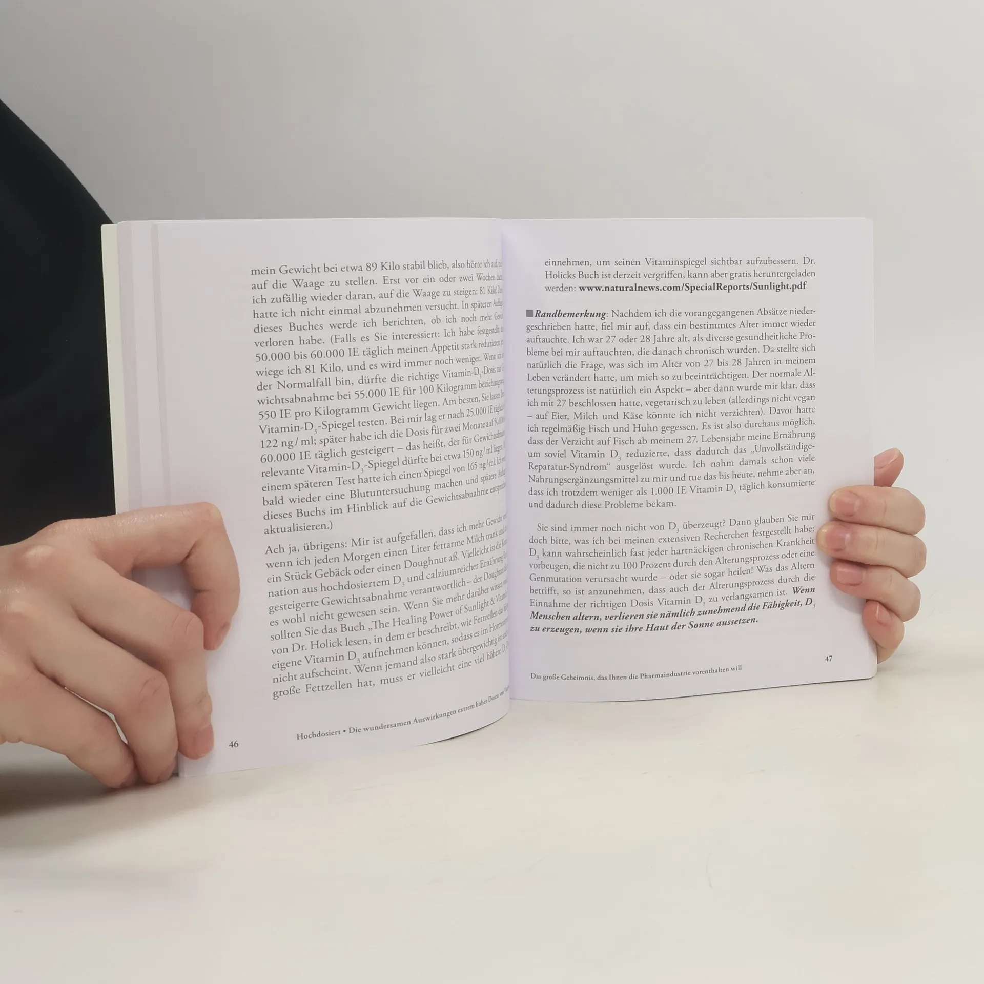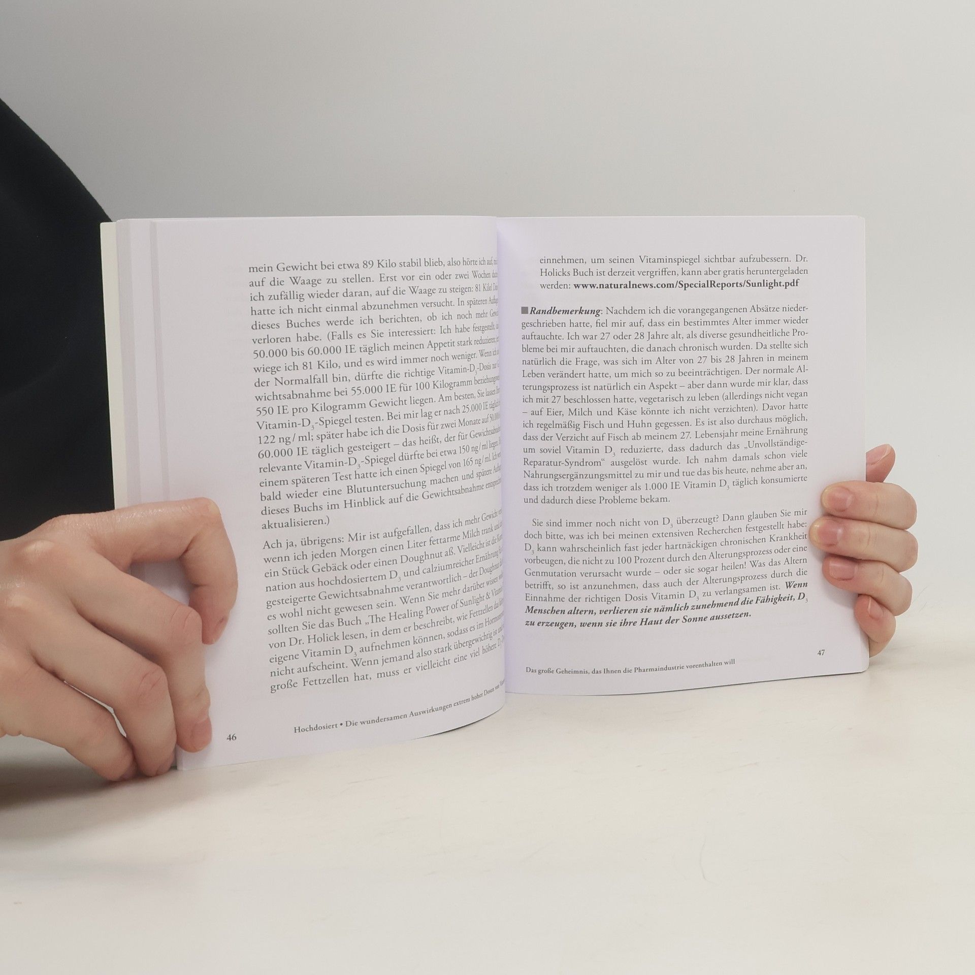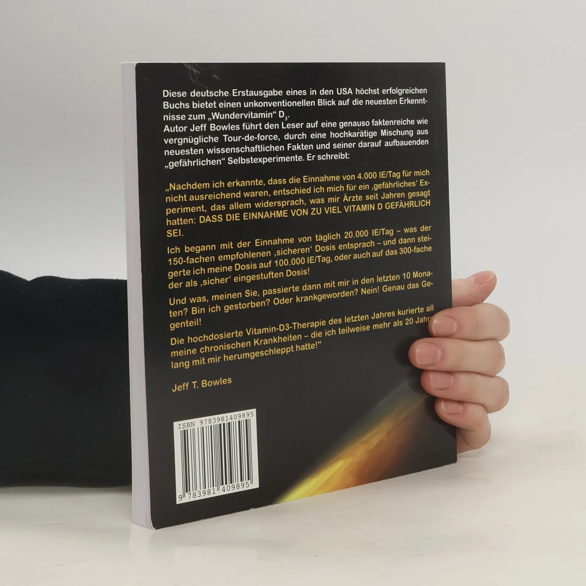 Diese deutsche Erstausgabe eines erfolgreichen Ebooks bietet einen unkonventionellen Blick auf die neuesten Erkenntnisse zum „Wundervitamin“ D3. Autor Jeff Bowles führt den Leser auf eine faktenreiche und unterhaltsame Tour durch eine Mischung aus wissenschaftlichen Fakten und seinen „gefährlichen“ Selbstexperimenten. Nachdem er erkannte, dass die Einnahme von 4.000 IE/Tag für ihn nicht ausreichend war, begann er mit der Einnahme von täglich 20.000 IE, was der 150-fachen empfohlenen Dosis entsprach, und steigerte diese auf 100.000 IE/Tag. Er beschreibt die Resultate seines Experiments und die damit verbundenen Gefahren. Zudem präsentiert er eine neue Theorie, die erklärt, wie hohe Dosen von Vitamin D3 epidemische Krankheiten und Gesundheitsprobleme verhindern oder heilen können, die seit den 1980er Jahren zunehmen. Diese Theorie besagt, dass Vitamin D3 ein Hormon ist, das bei Sonnenexposition gebildet wird, und dass ein Mangel daran zu verschiedenen gesundheitlichen Problemen führt. Hochdosiertes D3 kann zur Behandlung zahlreicher Krankheiten eingesetzt werden, darunter MS, Asthma, verschiedene Krebsarten, Lupus, Arthritis, Herzkrankheiten, Fettleibigkeit und Depression. Bowles hat über 20 Jahre lang Krankheiten und den Alterungsprozess studiert und seine Arbeiten wurden als bedeutend eingestuft.