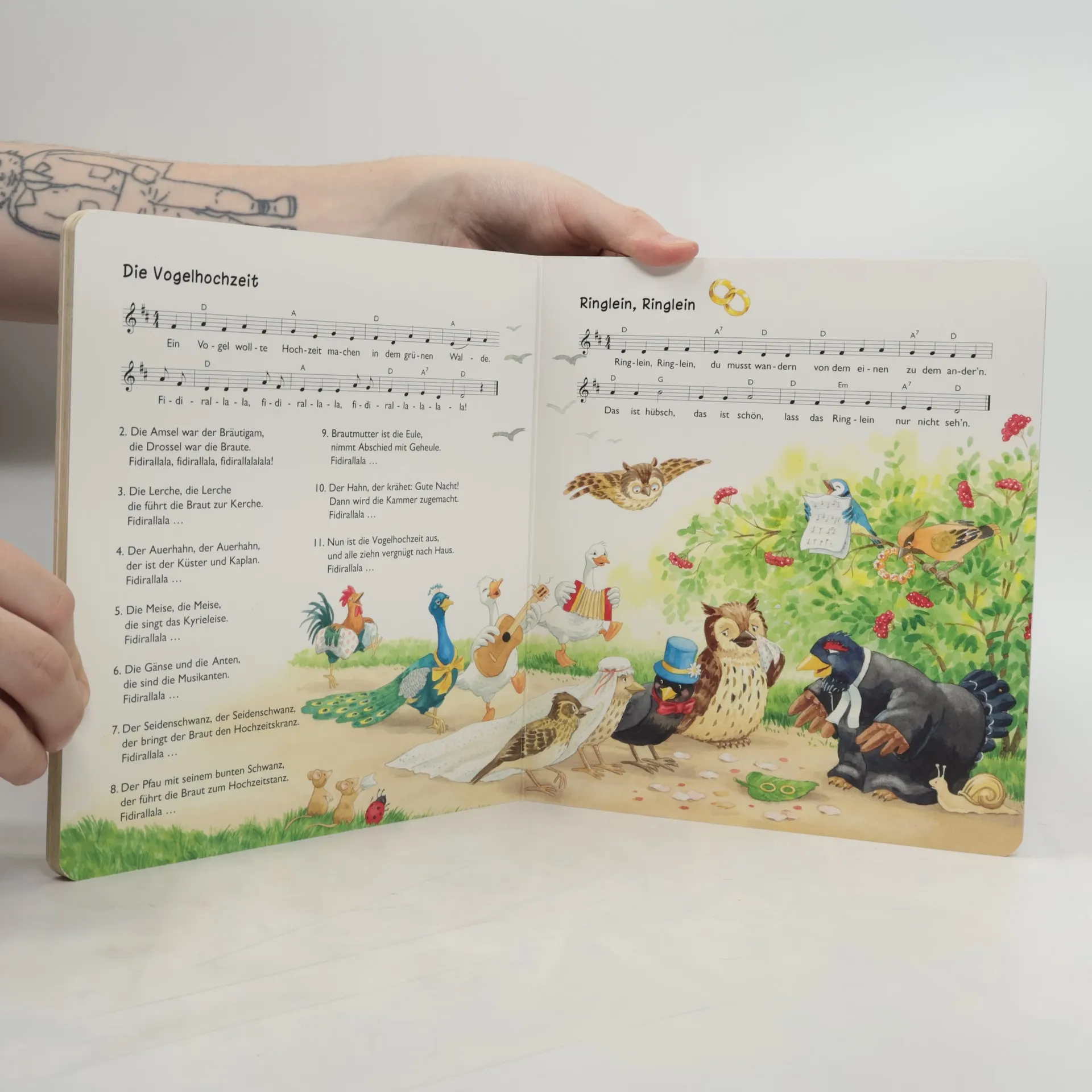 Mit Kindern macht singen einfach Spaß. Ob Sie die Noten treffen oder nicht ist dabei egal. Aber der Text muss sitzen! In diesem großen und dicken Pappbilderbuch sind 21 beliebte Kinderlieder zusammengefasst. Von ganz einfachen Liedern, die man Babys vorsingt, bis hin zu den lustigen Spaßliedern für Kindergartenkinder. Die dazugehörigen Bilder bieten viele Details zum weiteren Erzählen. Alle Lieder sind mit Notensatz abgebildet, zum Mitsingen und Nachspielen mit einem Instrument. Dieses Buch enthält: Backe, backe Kuchen Summ, summ, summ Die Vogelhochzeit Ri-ra-rutsch Hopp, hopp, hopp Hänsel und Gretel Die Räder am Bus Alle meine Entchen Kuckuck, Kuckuck Grün, grün, grün sind alle meine Kleider Hoch sollst du leben Zum Geburtstag viel Glück Die Affen rasen durch den Wald Brüderlein, komm, tanz mit mir Es tanzt ein Bi-Ba-Butzemann Häschen in der Grube Auf unsrer Wiese gehet was Schneeflöckchen, Weißröckchen ABC, die Katze lief im Schnee Schlaf, Kindlein, schlaf Der Mond ist aufgegangen