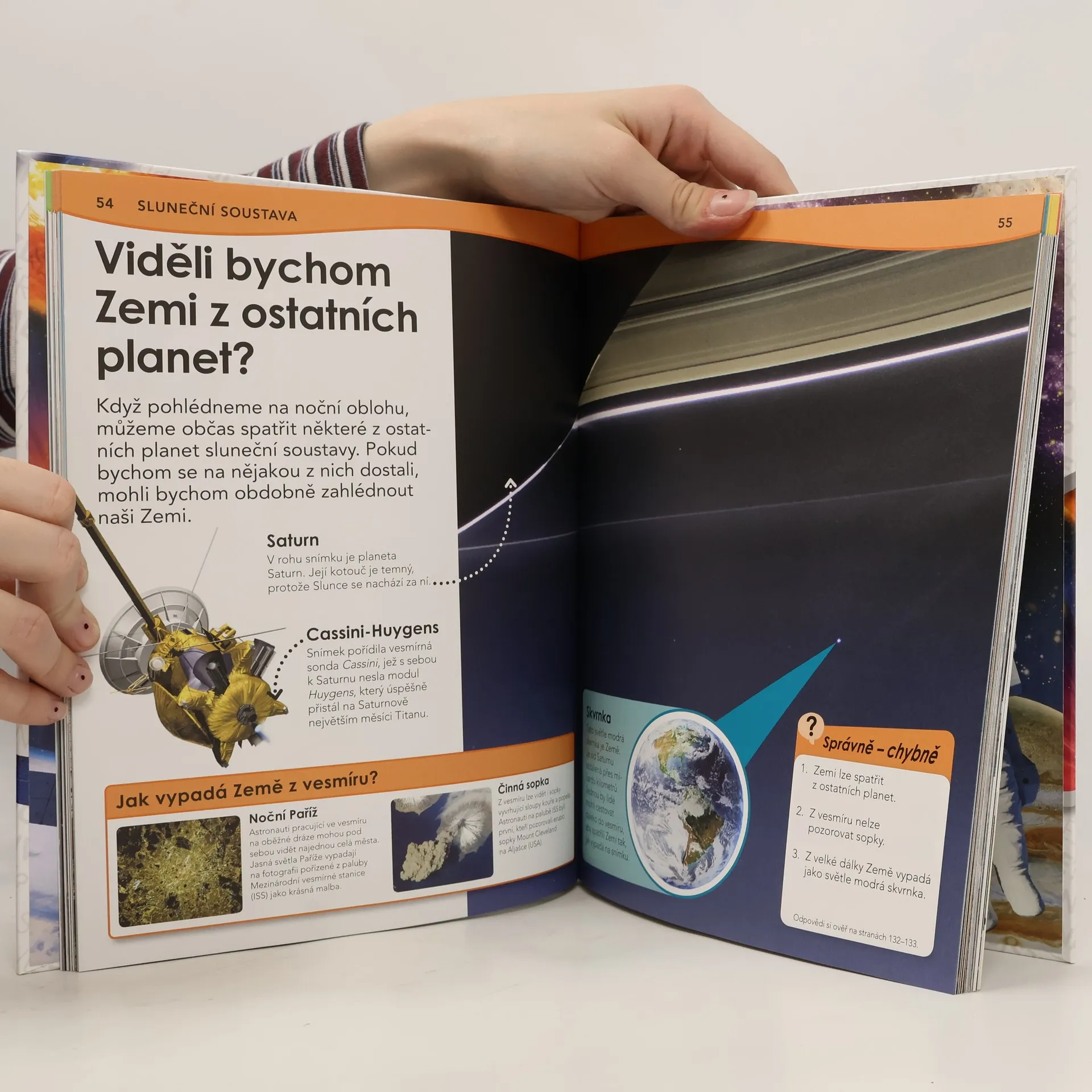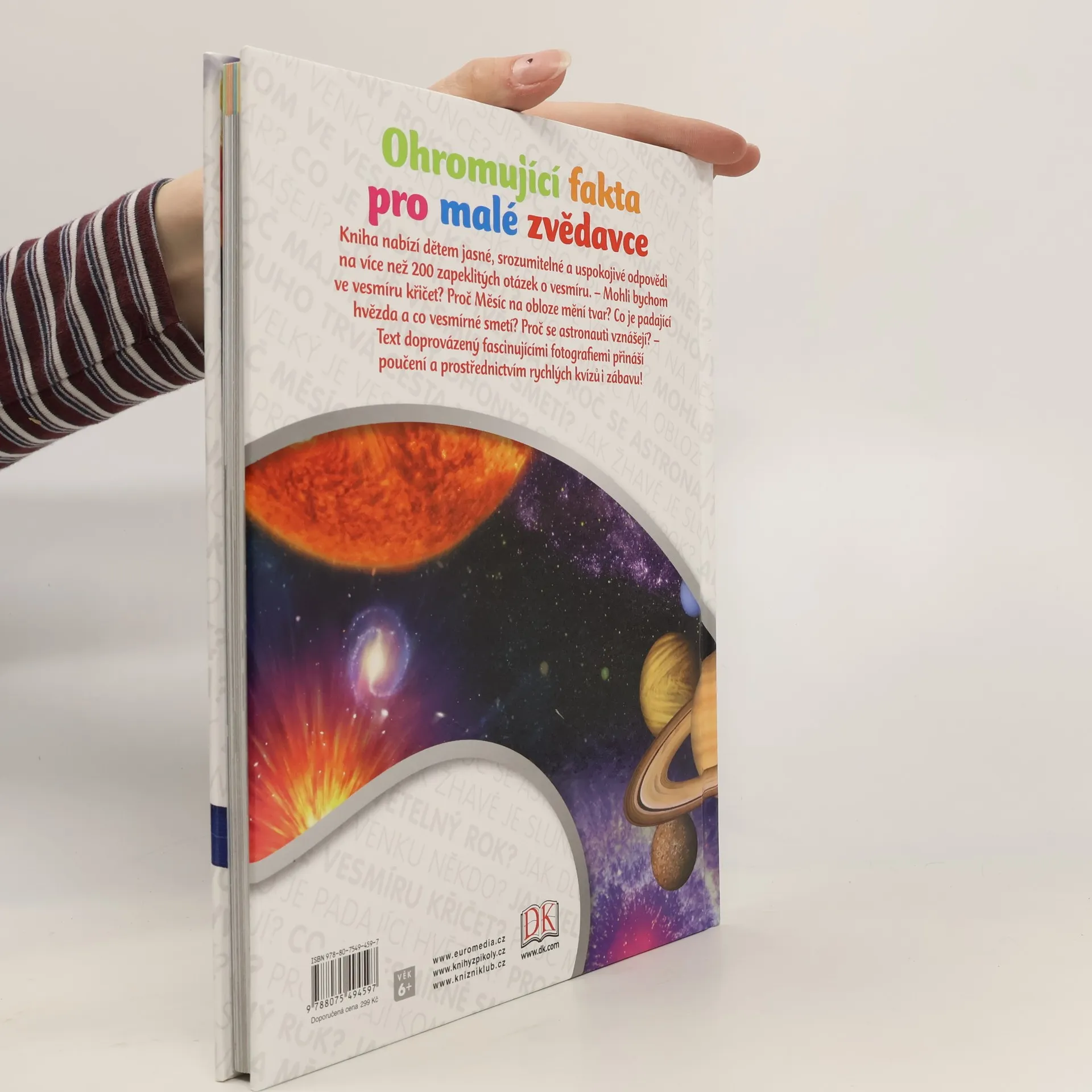 Brilantní odpovědi na zapeklité otázky, to je podnázev této encyklopedie o vesmíru, určené pro děti mladšího školního věku. – Mohli bychom ve vesmíru křičet? Proč Měsíc na obloze mění tvar? Co je padající hvězda? Co je vesmírné smetí? Proč se astronauti vznášejí? – Na více než 200 otázek o sluneční soustavě, hvězdách, galaxiích či průzkumu vesmíru dostávají děti jasné, srozumitelné a uspokojivé odpovědi plné informací, doprovázených fascinujícími fotografiemi.