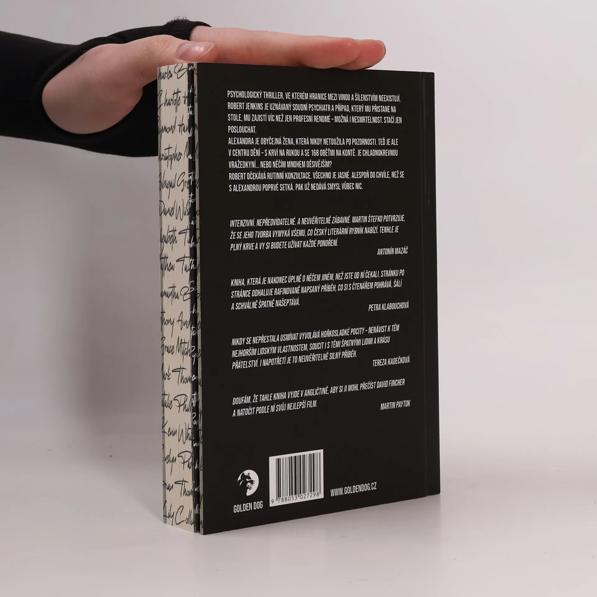 Robert Jenkins je uznávaný soudní psychiatr. Před sebou má případ, díky kterému už jeho jméno nikdy nezapadne. A přitom stačí jen mluvit a naslouchat.Alexandra je obyčejnou ženou, která nikdy nestála v centru dění. Až doposud. Ocitla se ve světle reflektorů s krví na rukou. Alexandra je vražedkyně. Na svém kontě má 168 zabití.Robert se těší na jednoduchý případ. Všechno je jasné. Alespoň do chvíle, než se s Alexandrou poprvé setká.