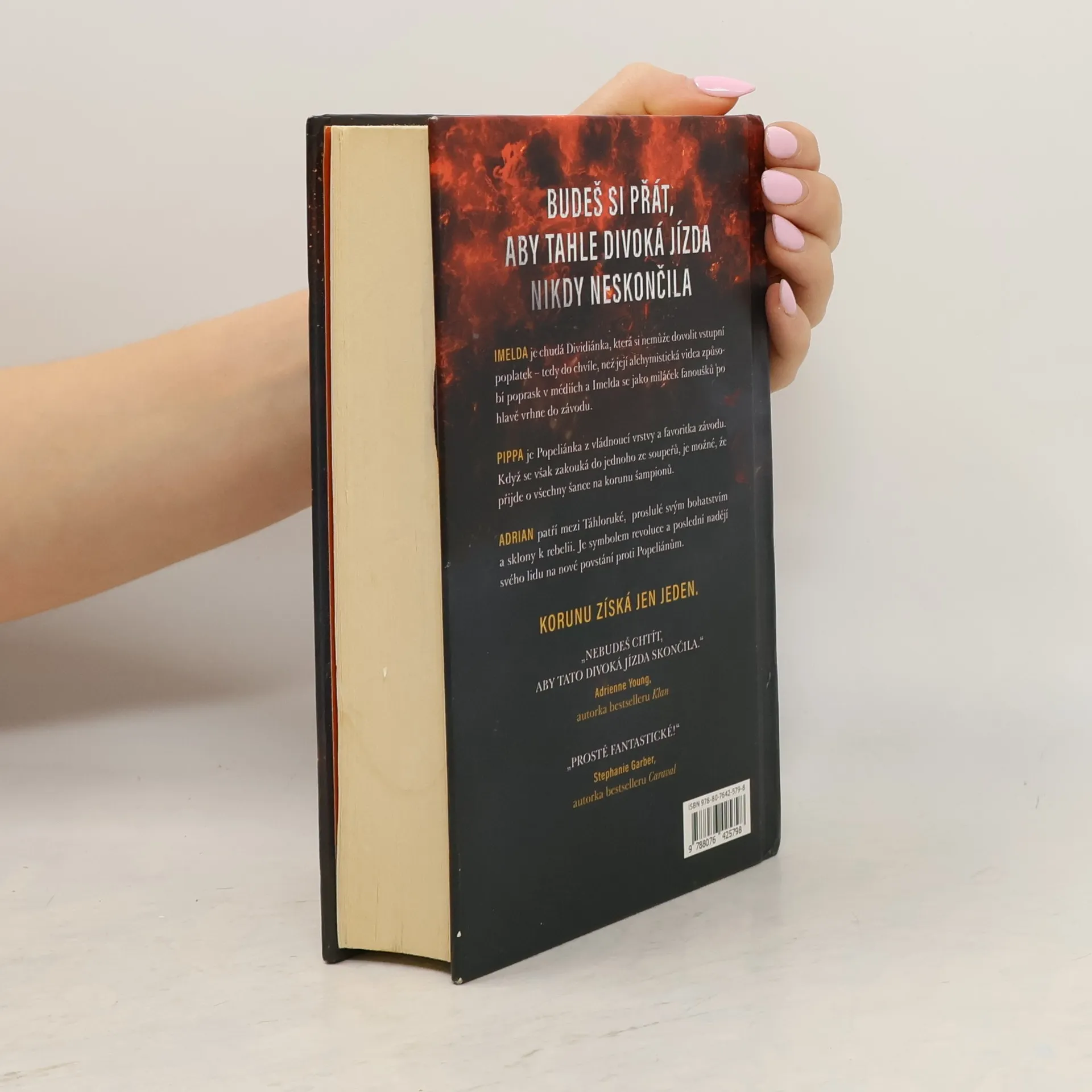 Už odedávna, kdy Popeliáni dostali od svých božstev fénixy, na nich jezdí do bitev, na lov a zejména na proslulém Dostihu. Elitní jezdci ze znepřátelených kultur touží po vítězství, a tak pilují dávné umění vytvářet a ovládat fénixy – koně, kteří se za pomoci alchymie rodí z popela. Každé ráno znovu povstávají, aby večer opět shořeli v ničivých plamenech. Dobrá alchymie ovšem není k ničemu, pokud jezdec nepřežije brutální noční souboje. Vražda je sice nezákonná, ale lámat kosti a otrávit popel je legální – publikum to dokonce vyžaduje. V letošním závodě soutěží jedenáct jezdců, ale tři z nich riskují víc než ostatní – dcera dvou bývalých šampionů, nadějná stipendistka a syn revolucionáře. Kterému z nich se podaří splnit si svůj velký sen o slávě a získat moc ve prospěch svého lidu? Anebo všichni shoří v drtivé porážce? VÍTĚZEM SE ČLOVĚK NERODÍ, VÍTĚZEM SE MUSÍ STÁT. IMELDA je chudá Dividiánka, která si nemůže dovolit vstupní poplatek – tedy do chvíle, než její alchymistická videa způsobí poprask v médiích a Imelda se jako miláček fanoušků po hlavě vrhne do závodu. PIPPA je Popeliánka z vládnoucí vrstvy a favoritka závodu. Když se však zakouká do jednoho ze soupeřů, je možné, že přijde o všechny šance na korunu šampionů. ADRIAN patří mezi Táhloruké, známé svým bohatstvím, ale také zmařenými povstáními. Je symbolem revoluce a poslední nadějí svého lidu na nové povstání proti Popeliánům. KORUNU ZÍSKÁ JEN JEDEN.