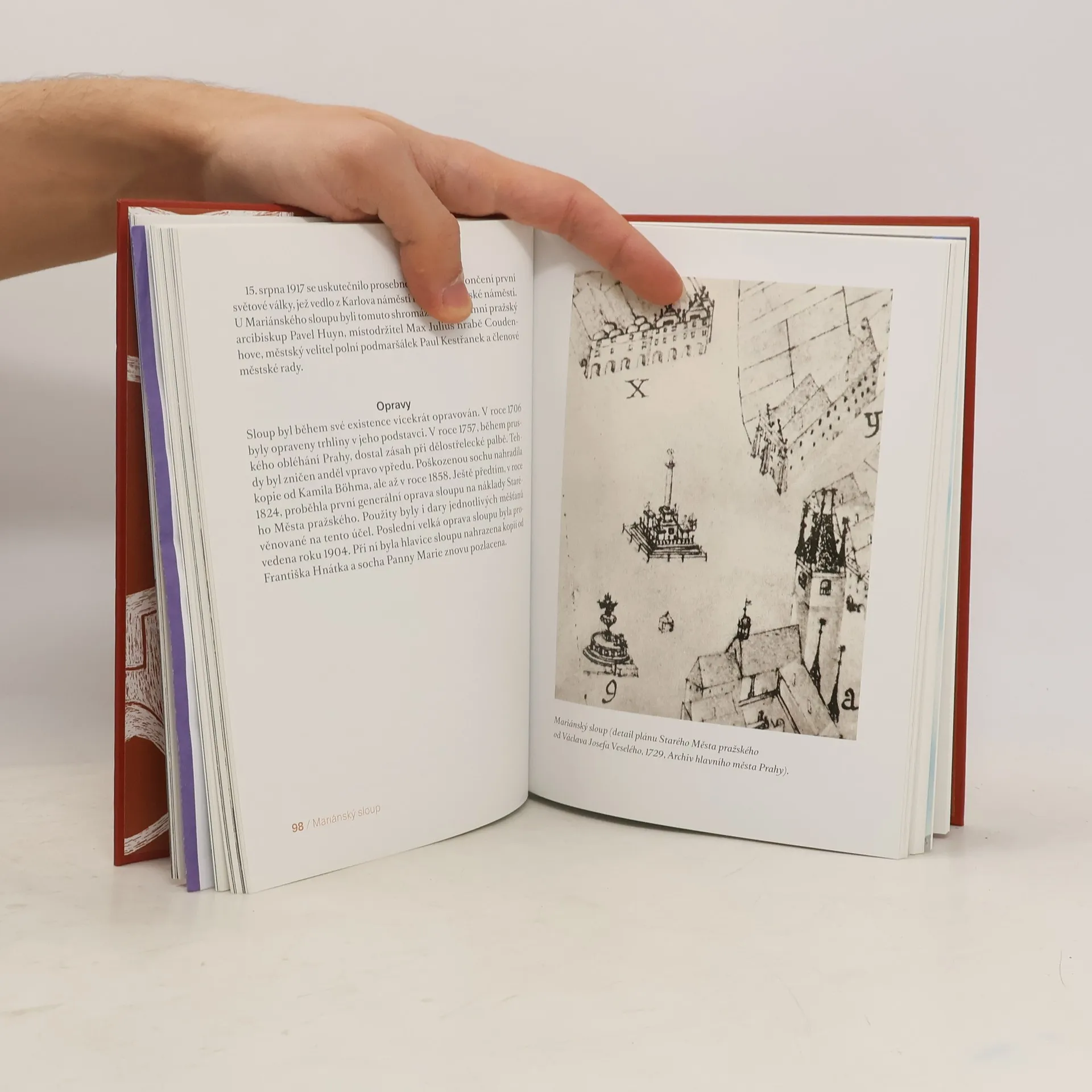 Kniha přístupnou a atraktivní formou pojednává o vzniku, stržení i obnově mariánského sloupu na Staroměstském náměstí v Praze. Sloup byl postaven jako pomník k poctě Bohorodičky – na poděkování za obranu Prahy před pleněním švédských vojsk v roce 1648. Místo, kde stál a opět stojí, lze bez obav označit za duchovní střed Prahy i Evropy. Dílo českého raněbarokního sochaře Jana Jiřího Bendla považují mnozí po zásluze za umělecky hodnotnější, než jsou podobné sloupy ve Vídni a v Mnichově. Autor nezastírá, že sloup je předmětem ostrých historických, politických a konfesních sporů, volá ovšem po vzájemném porozumění a usmíření. Když se sloup v listopadu 1918 stal terčem politováníhodného vandalského činu, nikdo netušil, že se jeho obnovy dočkáme až v létě 2020. Stržení sloupu se ale mezitím stalo mohutným impulsem pro výstavbu řady nových kostelů na různých místech Prahy (viz epilog knihy). Autor uvádí do pozoruhodných souvislostí stavby, události i osobnosti, spjaté s Mariánským sloupem. Jeho výklad doprovázejí desítky fotografií, ukázky z dobových dokumentů, reprodukce výtvarných děl, ale i modlitby, dopisy, básně a věroučné reflexe.