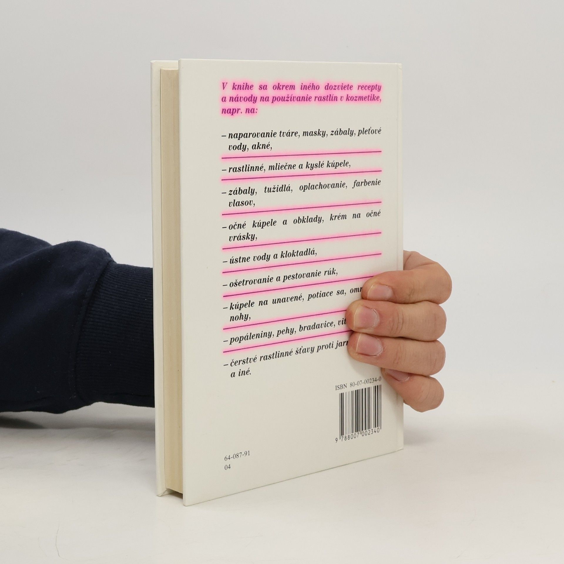 Informácie o možnostiach využívania liečivého účinku rastlín v kozmetike. Recepty a návody, ako si pripraviť rôzne kozmetické prípravky - pleťové masky, krémy, pleťové vody, prísady do kúpeľa, zábaly a pod. Kniha obsahuje i obrázkový herbár - opis rastlín, ich vyobrazenie, výskyt, zber, obsahové látky, kozmetický účinok a spôsob použitia.