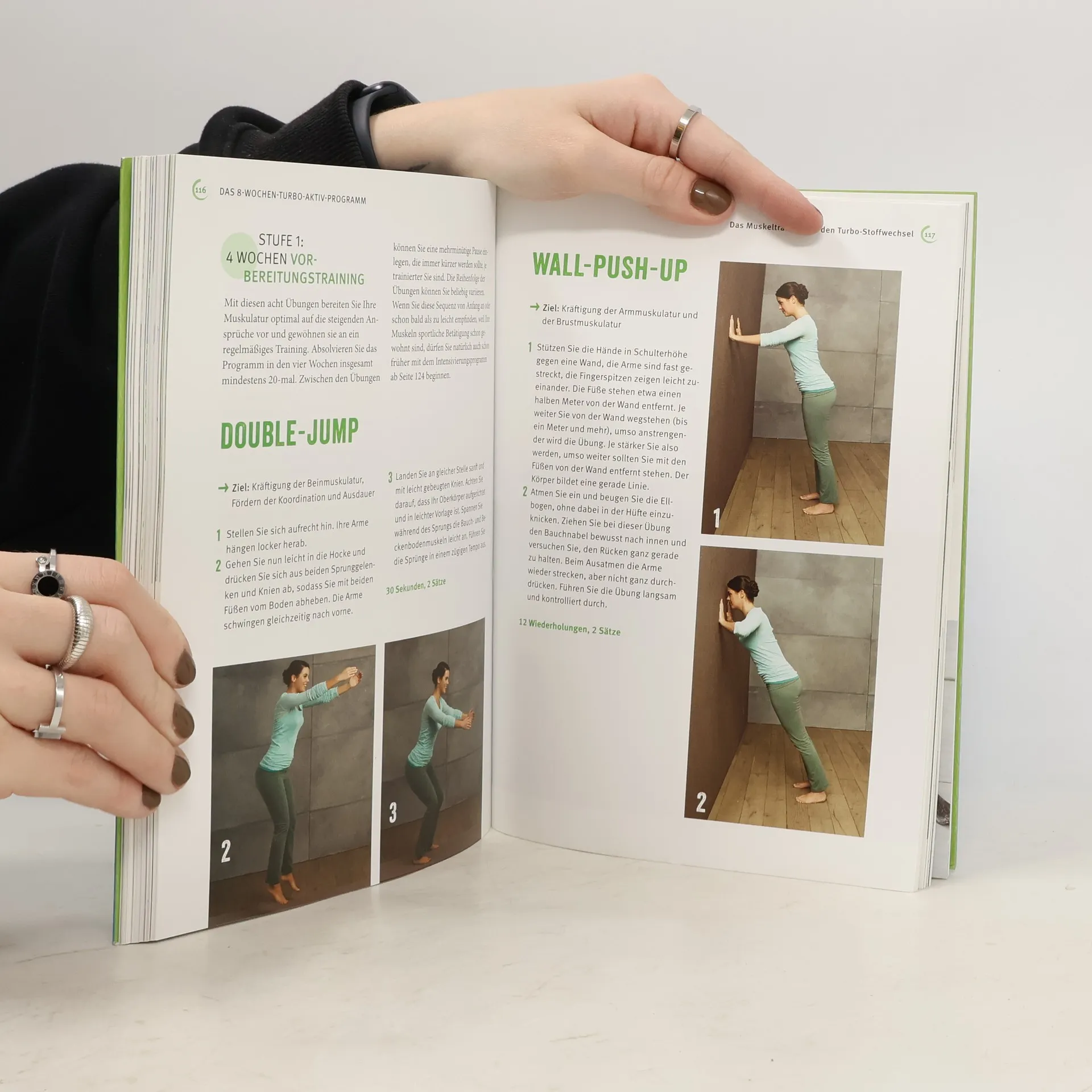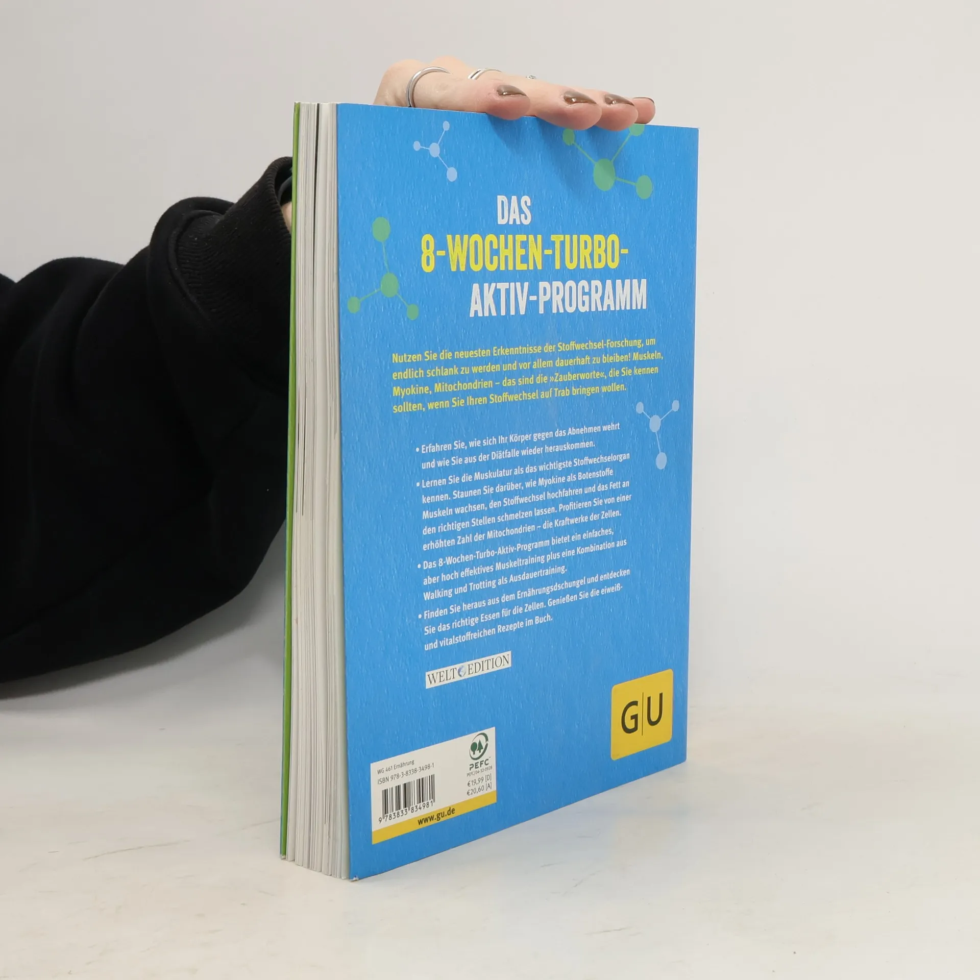 Nutzen Sie die Erkenntnisse der Stoffwechsel-Forschung, um schlank zu werden und dauerhaft zu bleiben. Mit gezieltem Muskeltraining wird der Turbo gezündet! Myokine, hormonähnliche Botenstoffe, unterstützen die Fettverbrennung, insbesondere an Problemzonen. Das abwechslungsreiche 8-Wochen-Turbo-Aktiv-Programm setzt dies effektiv um. Die Übungen sind so gestaltet, dass auch Übergewichtige und Ungeübte leicht einsteigen können. Ein begleitendes Ernährungsprogramm rundet das Konzept ab und bietet eine Lösung für alle, die trotz zahlreicher Diäten nicht abnehmen konnten, da diese den Stoffwechsel aus dem Takt gebracht haben. Der entscheidende Unterschied zu herkömmlichen Diäten: Um erfolgreich und nachhaltig abzunehmen, sollten Sie mit Ihrem Körper arbeiten, nicht gegen ihn. Diäten senken den Stoffwechsel und reduzieren wichtige Muskelmasse. Der Körper kann überflüssige Pfunde selbst abwerfen, wenn der Stoffwechsel richtig angeregt wird. Regelmäßige Bewegung und eine auf den Biorhythmus abgestimmte Ernährung fördern die Fettverbrennung. Die Kombination aus Ausdauer- und Krafttraining erhöht den Grundumsatz, sodass der Körper effektiv Fett verbrennt. Bringen Sie Ihren Körper in nur acht Wochen auf Hochtouren!