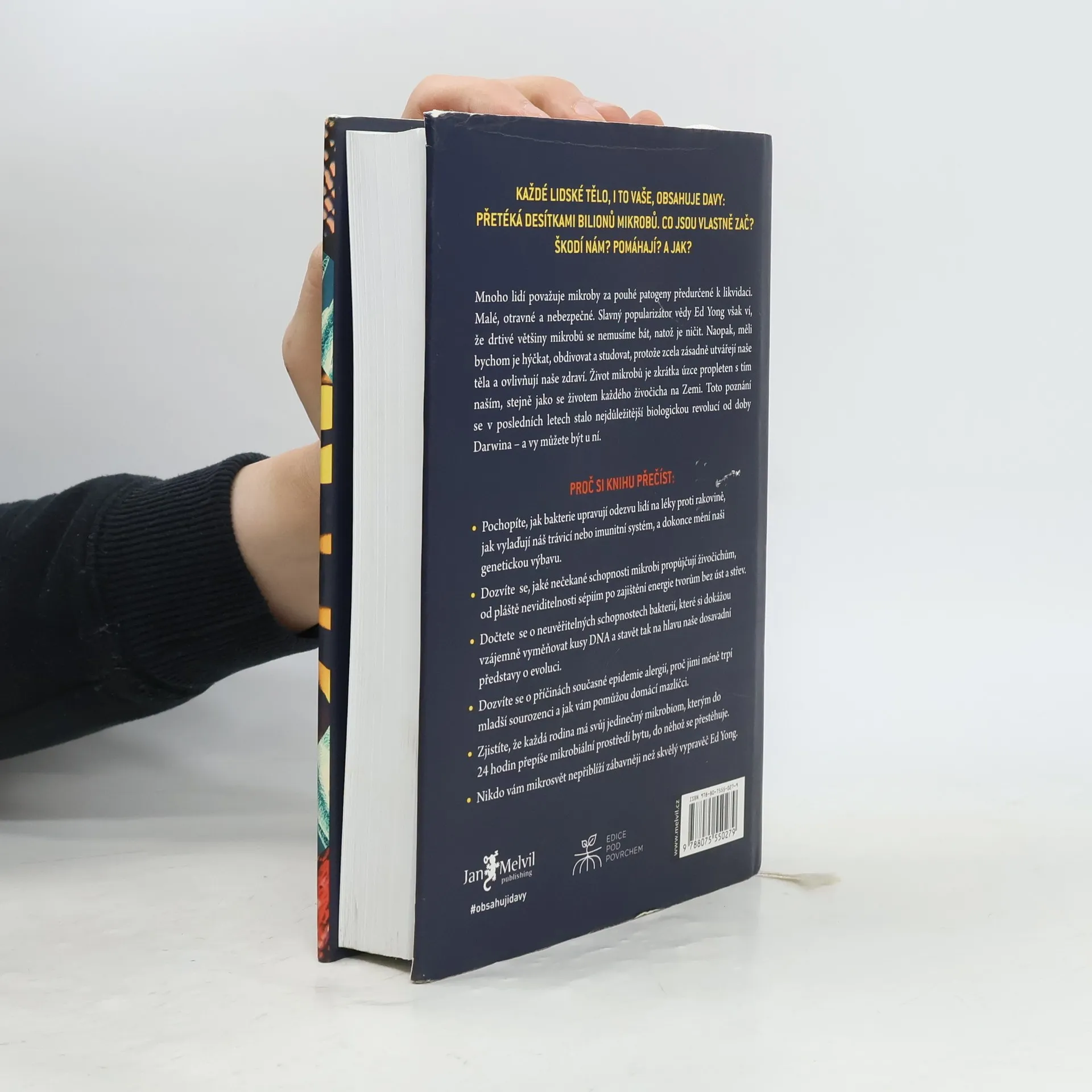 Přelomové, nádherně poučné a velmi zábavné pojednání o nejzásadnější revoluci v biologii od dob Darwina - pohled na svět „očima mikroba“, který odhaluje kouzelný a radikálně přestavěný obraz života na Zemi. Každý živočich, ať už člověk, sépie nebo vosa, je domovem milionů bakterií a dalších mikrobů. Ed Yong, jehož humor je stejně evidentní jako jeho vzdělání, nás ponouká k tomu, abychom se na sebe a své zvířecí společníky podívali v novém světle - ne jako na jedince, ale spíše jako na vzájemně propojené a závislé davy, kterými nepochybně jsme. Mikrobi v našem těle jsou součástí našeho imunitního systému a chrání nás před chorobami. V hlubokých oceánech se nacházejí záhadní tvorové bez úst a střev, kterým veškerou energii zajišťují mikrobi. Bakterie poskytují sépiím pláště neviditelnosti, pomáhají škůdcům likvidovat lesy a umožňují parazitům způsobovat nemoci postihující miliony lidí. Mnoho lidí mikroby považuje za patogeny předurčené k likvidaci, ale ti, kteří s námi žijí - mikrobiom - formují naše tělo, chrání naše zdraví, utvářejí naši identitu a zaručují nám neuvěřitelné schopnosti. V této ohromující knize vás Ed Yong zavede na velkolepou výpravu za našimi mikrobiálními partnery a představí vám vědce v předních liniích vývoje. Změní váš pohled na přírodu a zároveň i vnímání našeho místa v ní.