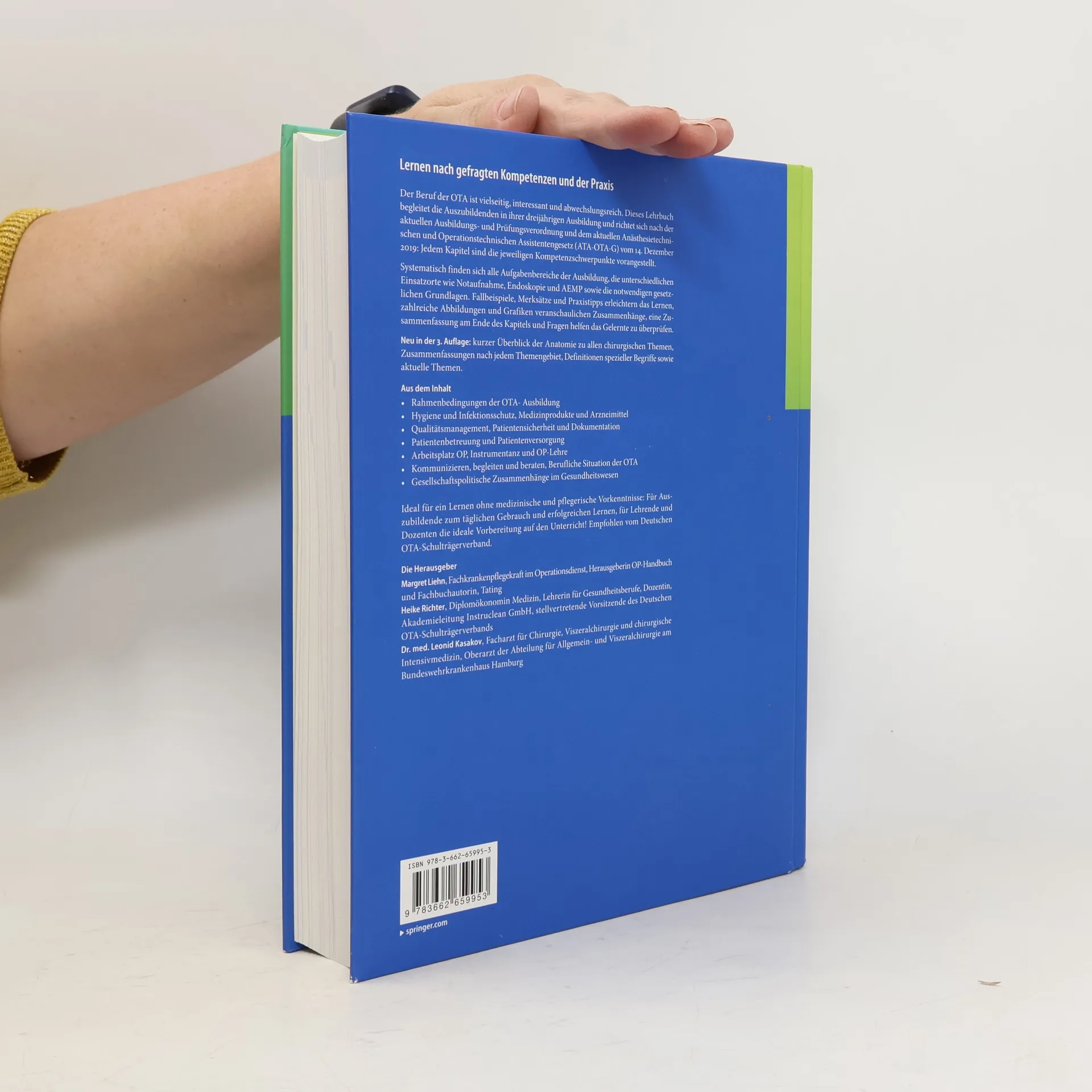 Der Beruf der OTA ist vielseitig, interessant und abwechslungsreich. Dieses Lehrbuch begleitet die Auszubildenden in ihrer dreijährigen Ausbildung und richtet sich nach der aktuellen Ausbildungs- und Prüfungsverordnung und dem aktuellen Anästhesietechnischen und Operationstechnischen Assistentengesetz (ATA-OTA-G) vom 14. Dezember 2019: Jedem Kapitel sind die jeweiligen Kompetenzschwerpunkte vorangestellt. Systematisch finden sich alle Aufgabenbereiche der Ausbildung wie Hygiene, Instrumentanz, Qualitätsmangement, die unterschiedlichen Einsatzorte wie Notaufnahme, Endoskopie und AEMP sowie die notwendigen gesetzlichen Grundlagen. Fallbeispiele, Merksätze und Praxistipps erleichtern das Lernen, zahlreiche Abbildungen und Grafiken veranschaulichen Zusammenhänge, eine Zusammenfassung am Ende des Kapitels und Fragen helfen das Gelernte zu überprüfen. Neu in der 3. Auflage: kurzer Überblick der Anatomie zu allen chirurgischen Themen, Zusammenfassungen nach jedem Themengebiet, Definitionen spezieller Begriffe sowie aktuelle Themen. Ideal für ein Lernen ohne medizinische und pflegerische Vorkenntnisse: Für Auszubildende zum täglichen Gebrauch und erfolgreichen Lernen, für Lehrende und Dozenten die ideale Vorbereitung auf den Unterricht! Empfohlen vom Deutschen OTA-Schulträgerverband.